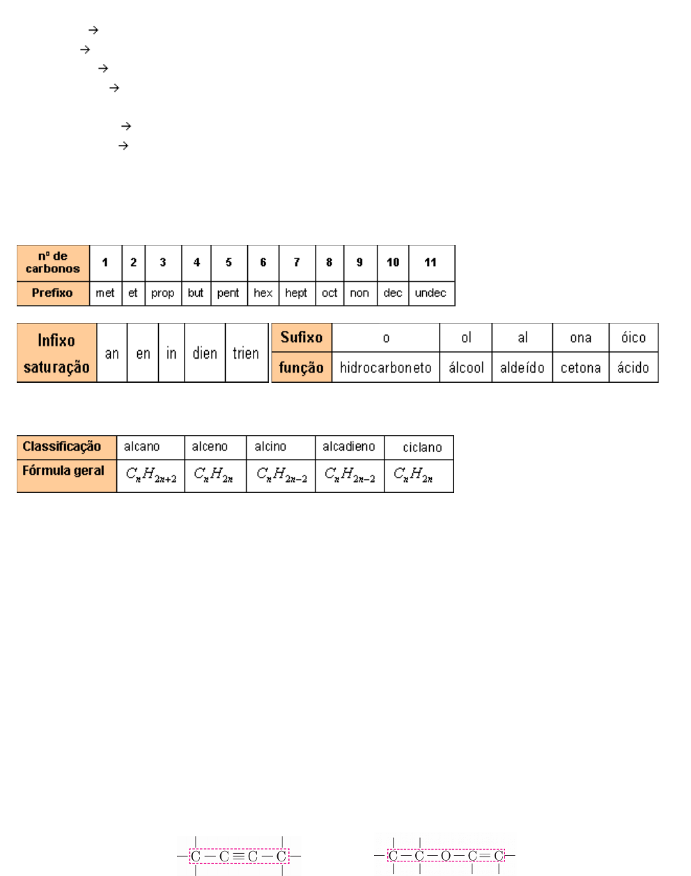 QUÍMICA ORGÂNICA Professor Alípio S. Amaral 3 Química orgânica 1) Cadeias carbônicas Alifáticas cadeias abertas. Cíclicas cadeias fechadas. Saturadas cadeia com ligações simples entre os carbonos. Insaturadas cadeias com ligações duplas, triplas ou duplas e triplas entre átomos de carbono. Homogêneas cadeia que só possui carbonos ligados entre si. Heterogênea cadeia que possui um átomo diferente do de carbono interligando os demais. 2) Nomenclatura 3) Hidrocarbonetos 4) Ligações entre Carbonos A – B ligação - que é uma ligação simples A = B 1 ligação - que é uma ligação dupla 1 ligação A B 1 ligação - que é uma ligação tripla 2 ligações 5) Cadeia principal Determina-se a cadeia principal, que é aquela que além de possuir o maior número de átomos de carbono, contém também as ligações duplas, triplas e o grupo funcional. Quando houver duas ou mais possibilidades, escolhe-se como cadeia principal a que contiver maior número de grupos laterais (cadeia mais ramificada). 6)Cadeia ABERTA, ACÍCLICA ou ALIFÁTICA Apresenta pelo menos duas extremidades (pontas) e nenhum ciclo ou anel 7) Cadeia FECHADA ou CÍCLICA Não apresenta extremidades, e os átomos de carbono se unem originando um ou mais ciclos (ou anéis). Essas cadeias podem ser representadas de outras formas, como: ou ou ou ou 8) Cadeia NORMAL, RETA ou LINEAR Apresenta somente duas extremidades, e seus átomos estão dispostos numa única seqüência. Observação: Numa cadeia normal, reta ou linear, não é preciso que todos os átomos estejam representados numa mesma linha. Observe: 9) Cadeia RAMIFICADA Apresenta no mínimo três extremidades, e seus átomos não estão dispostos em seqüência única, apresentado ramificações. 10) Cadeia SATURADA É aquela que apresenta somente ligações simples entre os átomos de carbono. 11) Cadeia INSATURADA É aquela que apresenta pelo menos uma ligação dupla ou tripla entre os átomos de carbono. 12) Cadeia HOMOGÊNEA É constituída somente por átomos de carbono. 13) Cadeia HETEROGÊNEA Existe pelo menos um heteroátomo entre os átomos de carbono da cadeia. Exemplos 01 – Indique a alternativa que apresenta respectivamente os nomes corretos das seguintes ramificações a) sec-butil, isopentil, benzil, terc-butil e vinil. b) iso-propil, sec-butil, fenil, terc-pentil e benzil c) iso-propil, sec-butil, benzil, terc-pentil e fenil d) sec-propil, isobutil, benzil, terc-pentil e fenil e)sec-propil, isobutil, fenil, terc-pentil e benzil 02 – Observe o composto a seguir: Composto orgânico em exercício sobre ramificações Indique a alternativa que traz a nomenclatura das ramificações que esse composto possui a) metil, metil, metil e isobutil b) metil, metil, metil e sec-butil c) metil e sec-pentil d) metil, metil e sec-butil e) metil, metil e isobutil 03 –Classifique as cadeias carbônicas a seguir como abertas ou fechadas, normais ou ramificadas, saturadas ou insaturadas, homogêneas ou heterogêneas e aromáticas ou não-aromáticas. a) J JJ J e) JJ JJ i) b) f) j) c) g) l) d) h) m) 04– (UNA-MG) A cadeia a seguir pode ser classificada como: a) aberta, heterogênea, saturada e normal. d) acíclica, homogênea, insaturada e normal. b) acíclica,homogênea,insaturada e ramificada. e) alifática, heterogênea, ramificada e insaturada. c) cíclica, aromática. 05 – A fórmula molecular de um hidrocarboneto com cadeia carbônica é: a) C9H8. b) C9H12. c) C9H7. d) C6H11. e) C9H10. 06 – A borracha natural é um líquido branco e leitoso, extraído da seringueira, conhecido como látex. O monômero que origina a borracha natural é o metil-1, 3-butadieno , do qual é correto afirmar que: a) é um hidrocarboneto de cadeia saturada e ramificada. b) é um hidrocarboneto aromático. c) tem fórmula molecular C4H5 d) apresenta dois carbonos terciários, um carbono secundário e dois carbonos primários. e) é um hidrocarboneto insaturado de fórmula molecular C5H8. O O N N C C C C C C CCCC C C C C C C C O CCCCC O C C C C C CCCCC C C C C N C CCCCNC C C C O C CCCOC C C C O C C CCCOC C C C C C C C O C C C C C C O C C C C C C O C C C C C C C C OCC C C C C C CC CC C C C C C C C C C C C C C C C C C C C C C C C C C C C C C C C C C CC C C CC
