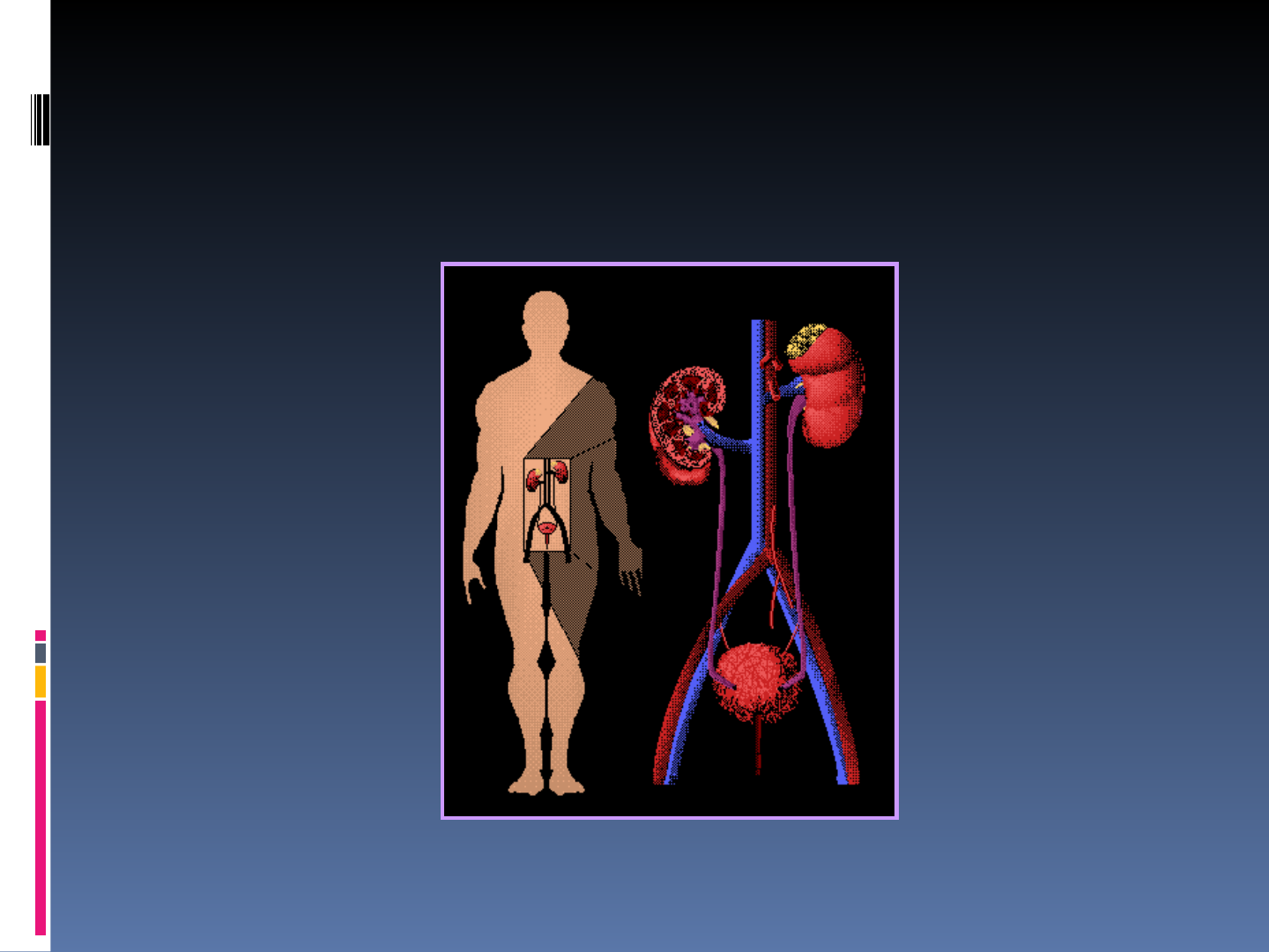 Sistema urinário Sistema urinário O sistema urinário é constituído pelos órgãos uropoéticos, isto é, incumbidos de elaborar a urina e armazená-la temporariamente até a oportunidade de ser eliminada para o exterior. Na urina encontramos ácido úrico, ureia, sódio, potássio, bicarbonato, etc. Este aparelho pode ser dividido em órgãos secretores - que produzem a urina excretores - que são encarregados de processar a drenagem da urina para fora do corpo. FILTRAR O SANGUE DEPURAR O PLASMA (PURUFICAR) REGULAR O METABOLISMO REGULAR A QUANTIDADE DE H20 REGULAR A PRESSÃO ARTERIAL Os órgãos urinários compreendem: os rins (2), que produzem a urina, os ureteres (2) ou ductos, que transportam a urina para a... bexiga (1), onde fica retida por algum tempo, e a uretra (1), através da qual é expelida do corpo. Além dos rins, as estruturas restantes do sistema urinário funcionam como um encanamento constituindo as vias do trato urinário. Essas estruturas – ureteres, bexiga e uretra – não modificam a urina ao longo do caminho, ao contrário, elas armazenam e conduzem a urina do rim para o meio externo. Expulsão de produtos residuais da atividade celular e de outras substâncias presentes em excesso no sangue. Ocorre através : - Sistema urinário - que é composto por: dois rins, dois ureteres, uma bexiga e uma uretra; Pele - através do suor; Boca - através da expiração (CO2). O sangue carrega excreções procedentes das células, onde ocorre a respiração celular. Os rins Os rins são órgãos pares, em forma de grão de feijão, localizados logo acima da cintura, de cada lado da coluna vertebral. Cada rim tem cerca de 11,25cm de comprimento, 5 a 7,5cm de largura e um pouco mais que 2,5cm de espessura. O peso do rim do homem adulto varia entre 125 a 170g; na mulher adulta, entre 115 a 155g. Funções dos rins Os rins realizam o trabalho principal do sistema urinário, com as outras partes do sistema atuando, principalmente, como vias de passagem e áreas de armazenamento. Com a filtração do sangue e a formação da urina, os rins contribuem para a homeostasia dos líquidos do corpo de várias maneiras. As funções dos rins incluem: Regulação da composição iônica do sangue; Manutenção da osmolaridade do sangue; Regulação do volume sangüíneo; Regulação da pressão arterial; Regulação do pH do sangue; Liberação de hormônios; Regulação do nível de glicose no sangue; Excreção de resíduos e substâncias estranhas. Bacinete Artéria renal Veia renal Uréter Cápsula renal Zona medular Estrutura interna de um rim Néfron Unidade funcional do rim responsável pela filtração do sangue e depuração do plasma. Temos aproximadamente 1 bilhão de néfrons em cada rim Composto por um glomérulo renal e um sistema de túbulos que desembocam na pelve renal com a urina formada A Filtração do Sangue Uma das ramificações da aorta – artéria renal, transportando o sangue, penetra no rim, onde se ramifica em vasos de menor calibre. Artéria renal Artéria renal Capilares sanguíneos Dentro do rim ocorre a Filtração do sangue A este nível são retidas as substâncias que irão formar a urina, tais como: Água (95%) - Ureia (3%) - Cloreto de sódio Ácido úrico Bacinete Uréter Zona medular Zona cortical A filtração do sangue Formação da urina Reabsorção Osmose Passagem natural da água para os capilares sanguíneos Reabsorção Água + Sódio Reabsorção Bexiga ÓRGÃO OCO FORMADO DE MÚSCULO LISO E REVESTIDO DE MUCOSA, SERVE PARA ARMAZENAR A URINA PARA SER EXCRETADA Bexiga Armazena a urina até ser expulsa para o exterior, pela uretra. Uretra CANAL QUE CONDUZ A URINA DA BEXIGA ATÉ O MEIO EXTERNO. TEM RELAÇÃO COM O APARELHO REPRODUTOR MASCULINO, DIFERENTE DA MULHER QUE É UM CANAL INDEPENDENTE Uretra Uretra é a denominação dada ao canal condutor da urina, que parte da bexiga e termina na superfície exterior do corpo, no pénis ou vulva. A diferença é no comprimento. A uretra masculina mede cerca de 16 cm enquanto a feminina mede apenas 4 cm. Além disto, a uretra masculina apresenta uma dupla função (condutora de sémen e urina) ao passo que na mulher o sistema urinário é independente do reprodutor. Curiosidades A urina é composta por cerca de 95% de água. As principais excreções da urina humana são: a ureia, o cloreto de sódio e o ácido úrico. Sangue: 180 l/dia filtrados. Urina: 1 a 2 l.