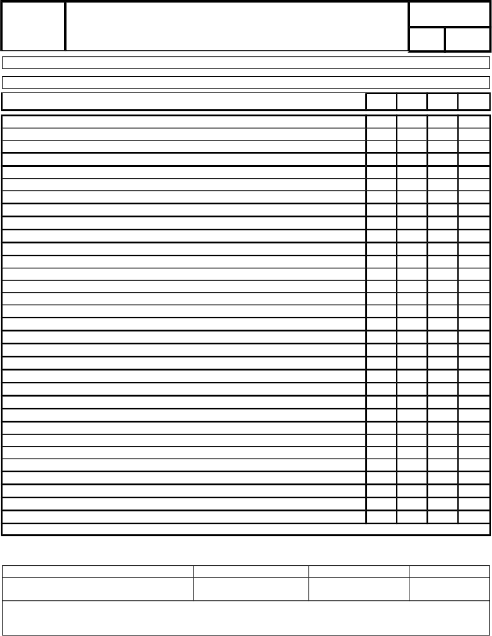 - 1 - CHECK LIST - GERADOR Código: SEG-NWN/12 Folha: 1/1 Revisão: 00 Equipamento: Empresa: ITENS A SEREM OBSERVADOS C NC P NA Nível de óleo do motor Nível de óleo hidráulico Nível da água do radiador Nível de óleo diesel Local de instalação permite apenas o acesso de pessoas autorizadas Sem vazamentos Presença e nível de carga do extintor de incêndio Funcionamento dos instrumentos do painel Existe cadeado no disjuntor de segurança Existe chave Liga-desliga A carcaça do motor está aterrada eletricamente A fiação elétrica está conforme Existe extintor de incêndio carregado nas proximidades A carga do extintor está dentro da validade Saída de ar voltada para baixo O local tem piso nivelado A área está sinalizada de acordo com o risco da atividade Abraçadeira na mangueira de saída Estado e conservação de instalações elétricas O operador recebeu treinamento para operar o equipamento O operador utiliza sempre os EPI’s indicados para a atividade Funcionamento do sensor de temperatura de óleo hidráulico Estado do sistema de reboque Estado e conservação da carcaça Legenda: C = Conforme NC = Não Conforme P = Parcialmente NA = Não se Aplica Nome Cargo Visto Data Observações: