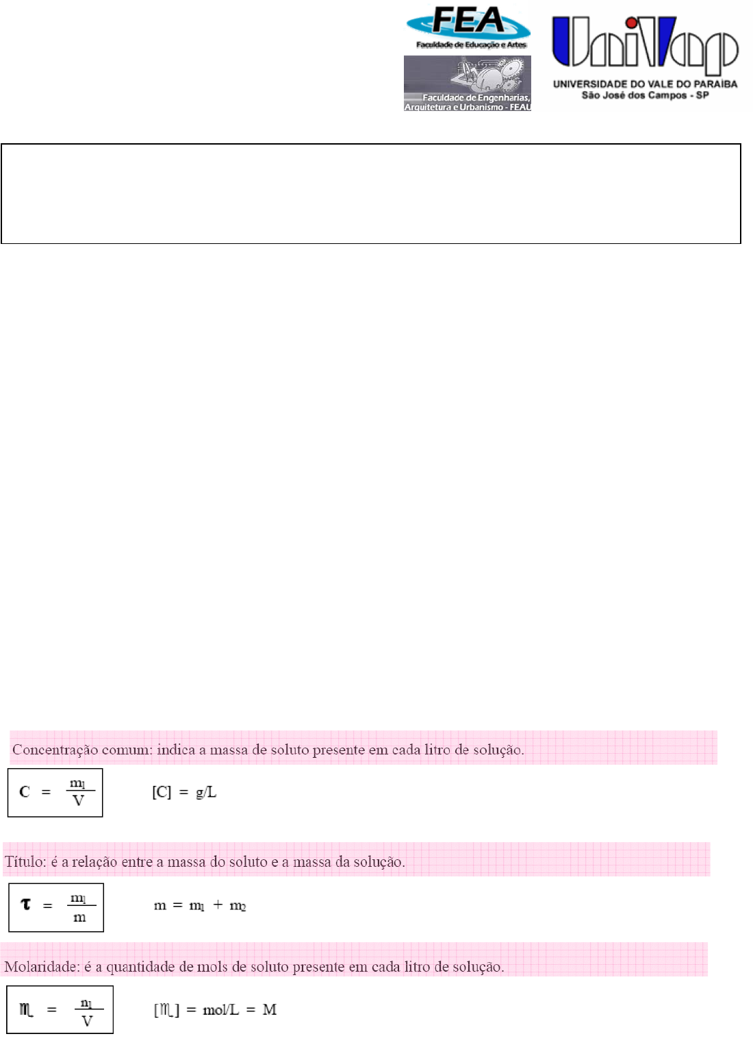 Fís.-Qui. Exp. 1 – Pratica 2: Soluções & Titulação Condutométrica 1 Físico-Química Experimental I Bacharelado em Química Engenharia Química Prof. Dr. Sergio Pilling Objetivos: Nesta prática iremos rever os conceitos de preparo de diferentes tipos de soluções (concentração, molaridade, normalidade, etc). Faremos uma titulação simples utilizando um indicador de pH para neutralizarmos uma solução básica. Introduziremos a técnica de condutométrica. Utilizando o procedimento de titulação condutométrica, determinaremos o ponto de equivalência de uma reação de neutralização de uma base por ácido forte e, também, para neutralização de uma base forte por um acido fraco. Para este procedimento será utilizado um condutivímetro. 1) Soluções Em química, solução é o nome dado a dispersões cujo tamanho das moléculas dispersas é menor que 1 nanometro (10 Angstrons). A solução ainda pode ser caracterizada por formar um sistema homogêneo (a olho nu e ao microscópio), por ser impossível separar o disperso do dispersante por processos físicos. As soluções são compostas por moléculas ou íons comuns. Podem envolver sólidos, líquidos ou gases como dispersantes (chamados de solventes – existentes em maior quantidade na solução) e como dispersos (solutos). A solução também pode apresentar-se nesses três estados da matéria. As soluções podem ser classificadas quanto ao estado físico (sólidas, líquidas ou gasosas ), quanto à condutividade elétrica (Eletrolíticas ou iônicas, Não-eletrolíticas ou moleculares), quanto à proporção soluto/solvente (Diluída , Concentrada , Não-saturada, Saturada, Supersaturada ). É importante destacar que soluções gasosas são formadas apenas por solvente e soluto gasosos. Principais tipos de concentrações: Prática 2 – Soluções & Titulação Condutométrica. Revisão sobre preparação de soluções (concentração, molaridade, normalidade, etc) e titulação usando indicador de pH. Introdução a condutometria e titulação condutométrica (ácido forte-base forte e ácido fraco-base forte). Obs. o número de moles n é a massa (em gramas) dividida pela massa molar → n = m/MOL Fís.-Qui. Exp. 1 – Pratica 2: Soluções & Titulação Condutométrica 2 Percentagem em peso: é a massa do soluto em 100 g da solução. Exemplos: 1) Considere que 10 gramas de um soluto A são dissolvidos em 90 gramas de um solvente B. Qual o título da solução? Resp: m1 = 10 gramas (soluto A) e m2 = 90 gramas (solvente B) T = m1 / m1 + m2 = 10 g / 100g = 0,1 2) Qual a percentagem da solução anterior? Resp: A percentagem em peso (% em peso) = título x 100 = 0,1 x 100 = 10% 3) Uma solução contém 4 moles do soluto dissolvidos em 16 moles do solvente. Determinar: a) a fração molar do soluto. b) a fração molar do solvente. Resp: n1 = 4 , n2 = 16 → n = n1+n2 =20 x1= n1/n = 4/20 = 0,2 x2 =n2/n =16/20 = 0,8 Observe que x1+x2 =1 4) Uma solução é preparada, dissolvendo-se 4,35 gramas de NaNO3 em 2000 gramas de água. Qual seria a molalidade da solução? Dado: Mol = 87 g é o mol do soluto. Resp: n1 = massa do soluto / mol do soluto = 4,35 g / 87 g = 0,05 m2 = 2000 g = 2 kg molalidade = 0,05 / 2 = 0,025 molal 5) Qual a concentração de uma solução que contém 20 gramas do soluto dissolvido em 0,5 litro de solução? Resp: m1 = 20 g V = 0,5 litro Concentração = 20g / 0,5 litro = 40 g / litro 6) Relacionando a molaridade com a Concentração Comum: Foram dissolvidos 4,9 g de H2SO4 em água suficiente para 0,5 litros de solução. Qual a concentração molar (molaridade) e a concentração comum da solução ? Dado: mol de H2SO4 = 98 g Resp: Cálculo da concentração molar ou molaridade: n1 = m1 / mol = 4,9 g / 98 g = 0,05 M = n1 / V (litros) = 0,05 / 0,5 litros = 0,1 molar Cálculo da concentração comum: C = M . mol = 0,1 , 98 g = 9,8g / litro ou C = m1 / V = 4,9g/0,5 litros = 9,8g/litro Fís.-Qui. Exp. 1 – Pratica 2: Soluções & Titulação Condutométrica 3 Normalidade ou concentração normal é a relação entre o número de equivalentes-gramas (nE) do soluto e o volume da solução, em litros. Obs. o número de equivalente gramas é igual a massa (em gramas) dividido pelo Equivalente-grama (E) do reagente: nE = m/E. Lembrete: 1 L = 1dm3 = 103 cm3 = 1000 cm3 Para entendermos o conceito de normalidade e preciso entender o que é um Equivalente-grama. Equivalente-grama (E) de um elemento químico é a relação entre átomo-grama (A) e sua valência (v), no composto considerado. Exemplos: Para o sódio - Na Valência =1 E = A / v = 23g / 1 = 23g Para o bário - Ba Valência =2 E = A / v = 137g / 2 = 68,5g Para o alumínio - Al Valência =3 E = A / v = 27g / 3 = 9g Para o oxigênio - O Valência =2 E = A / v = 16 g / 2 = 8g Equivalente-grama (E) de um ácido é a relação entre a molécula-grama ou mol do ácido e o número de hidrogênios ácidos ou ionizáveis (x). Exemplos: Para o ácido nítrico - HNO3 Quant de H ionizáveis = 1 E = mol / x = 63g / 1= 63g Para o ácido sulfúrico - H2SO4 Quant de H ionizáveis = 2 E = mol / x = 98g / 2 = 49g Para o ácido fosfórico - H3PO4 Quant de H ionizáveis = 3 E = mol /x = 98g / 3 = 32,7g Para o ácido fosforoso - H3PO3 Quant de H ionizáveis = 2 E = mol / x = 82g / 2 = 41g Para o ácido hipofosforoso - H3PO2 Quant de H ionizáveis = 1 E = mol / x = 66g / 1 = 66g Para o acido acético CH3COOH Quant de H ionizáveis = 1 E = mol / x = 60g / 1 = 60g Obs. ácido hipofosforoso ácido fosfórico ácido fosforoso acido acético Equivalente-grama (E) de uma base é a relação entre a molécula-grama ou mol da base e o número de hidroxilas (x). Exemplos: Para o hidróxido de sódio - NaOH E = mol / x = 40g / 1 = 40g Para o hidróxido de cálcio - Ca(OH) 2 E = mol / x = 74g / 2 = 37g Para o hidróxido de alumínio - Al(OH)3 E = mol / x = 78g / 3 = 26g Equivalente-grama (E) de um sal é a relação entre a molécula-grama ou mol do sal e valência total do c