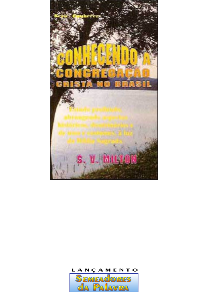 CONHECENDO A CONGREGAÇÃO CRISTÃ NO BRASIL S. V. MILTON Digitalizado e Revisado por PerolaGospel http://semeadoresdapalavra.queroumforum.com A. D. SANTOS EDITORA LTDA 2.a Edição, 1998 A. D. SANTOS EDITORA LTDA 1995 78 páginas Diagramação e Arte: André P. Santos 1. Seitas 2. Heresias Código para pedido: 2915 Impressão: Editora Betânia Edição e Distribuição: Al. Dr. Carlos de Carvalho, 311 Lj: 14 - Centro Curitiba - PR - 80410-180 SEDE PRÓPRIA - Fone/Fax (041) 223.0801 / 223.8743 E-Mail: adsantos@per.com.br SUMÁRIO CONTRACAPA APRESENTAÇÃO 1 - INTRODUÇÃO 2 - UM SISTEMA OPRESSOR 3 - NO PRINCÍPIO ERA LUÍS 4 - CHEGADA AO BRASIL 5 - CHEGADA AO PARANÁ 6 - CARACTERÍSTICAS DA CONGREGAÇÃO CRISTÃ 6.1. DESCRIÇÃO 6.2. USOS E COSTUMES 6.3. AS DOUTRINAS 6.4. A ORGANIZAÇÃO 6.5. SISTEMA PASTORAL 6.6. DÍZIMO OBRIGATÓRIO 6.7. CONSELHO DIRIGENTE 6.8. SANTA CEIA 6.9. O BATISMO 6.10. SISTEMA DE ENSINO 6.11. A VIDA EM COMUNIDADE 7 - MODELO EM CORINTO 8 - DOUTRINA DO BATISMO E OUTROS ASPECTOS 8.1. O BATISMO SEM CRITÉRIO E A FALTA DE CONVERSÃO 8.2. SEM PASTOR E SEM SALÁRIO 9 - BÊNÇÃOS DA CONTRIBUIÇÃO 9.1. A IGREJA DE CORINTO 9.2. A NECESSIDADE DE UM PASTOR 9.3 A REJEIÇÃO DO PREPARO INTELECTUAL 9.4. A ÊNFASE ÀS PROFECIAS 9.5. O USO DO VÉU 9.6. ÓSCULO SANTO 9.7. DISCRIMINAÇÃO FEMININA 9.8. A CEIA DO SENHOR 10 - REFUTAÇÃO BÍBLICA 10.1. A IGREJA NÃO SALVA 10.2. A RESTAURAÇÃO PELO NOVO NASCIMENTO 10.3. A PREGAÇÃO EM PÚBLICO 10.4. INSTITUIÇÃO DE PASTORES 10.5. A QUESTÃO DO DÍZIMO 10.6. AINDA O SALÁRIO PASTORAL 10.7. OUTROS TEXTOS SOBRE A DISCRIMINAÇÃO DA MULHER 10.8. ORGULHO E SOBERBA ATÉ NA SAUDAÇÃO 10.9. DE JOELHO É MELHOR? 10.10. OS OFICIAIS DA IGREJA 11 - ÚLTIMAS CONSIDERAÇÕES 12 - O PENSAMENTO TEOLÓGICO DE FRANCISCON BIBLIOGRAFIA CONTRACAPA Trata-se de um livro escrito com carinho e profundo amor pelos irmãos da Congregação Cristã no Brasil. O autor, conhece profundamente o assunto, por experiência pessoal, e por ter efetuado entrevistas e pesquisas nas literaturas existentes da própria Congregação Cristã. O leitor irá saber toda a história, desde a fundação até os nossos dias. Conhecerá também as doutrinas, usos e costumes, acompanhado de profunda análise bíblica O objetivo da editora não é combater os irmãos da Congregação Cristã no Brasil, mas sim, transmitir ao povo evangélico, o conhecimento necessário, sem proselitismo. APRESENTAÇÃO É com satisfação que apresentamos ao público ledor mais um livro da Série CONHECER. Este livro trata da CONGREGAÇÃO CRISTÃ NO BRASIL; é um estudo rápido de suas origens, crenças e costumes. O propósito é ampliar os conhecimentos de nossos leitores no campo religioso. Embora a obra pareça polêmica, não é este o propósito e objetivo desta editora. Registramos nossos agradecimentos a todos quantos têm dado atenção às nossas edições. O Editor 1 - INTRODUÇÃO Ao nos propormos fazer uma análise do sistema doutrinário da Igreja Congregação Cristã no Brasil, não temos em mente o ataque pessoal nem confronto de opiniões. Nosso único objetivo é examinar suas doutrinas à luz da Bíblia. Desejamos oferecer aos interessados orientações seguras sobre as interpretações equivocadas de diversos ensinamentos bíblicos praticadas por essa denominação. É oportuno esclarecer que nada temos contra a pessoa dos filiados à Congregação. A Bíblia nos exorta a amar incondicionalmente a todos os homens, o que não implica silenciarmo-nos diante de práticas religiosas distorcidas da verdade bíblica. Jesus veio desfazer um sistema religioso que há muito seus líderes haviam transformado numa fonte de poder para alcançarem objetivos pessoais. O judaísmo já não testemunhava o nome de Jeová como Deus único e verdadeiro entre os povos da época. O fim da religião judaica primitiva foi conseqüência das distorções das verdades bíblicas para atender interesses particulares, privilegiando pessoas e grupos em detrimento à sã doutrina. Jesus denunciou essa realidade, pregou o início de um tempo novo, onde a adoração de Deus seria "em espírito e verdade", abolindo o sangue do sacrifício de animais como elemento remidor de pecados. Ele era o Messias esperado, mas não viera em poder temporal, a fim de livrar Israel dos inimigos pela força da espada, conforme acreditavam. Veio conduzir a humanidade ao tempo da graça, onde o meio de justificação do pecador seria exclusivamente pela fé. "Maravilho-me de que tão depressa passásseis daquele que vos chamou à graça de Cristo para outro evangelho, o qual não é outro, mas há alguns que vos inquietam e querem transtornar o evangelho de Cristo (Gl 1.6-7). Jesus pagou um alto preço para que a verdade por ele ensinada permanecesse intacta. Aos cristãos verdadeiros, conhecedores da realidade doutrinária do cristianismo, cabe denunciar os equívocos, ensinar a observação correta do que dizem as Escrituras e preservar a pureza desses ensinamentos. Essa posição deve ser mais firme na medida em que quaisquer organizações religiosas insistam em impor aos outros sua interpretação particular das doutrinas bíblicas, considerando todos os demais errados, a ponto de ensinar seus adeptos a não responderem a saudação em nome do Deus que acreditam, discriminando as pessoas que não pertencem ao seu grupo denominacional. Muitos seguem religiões e denominações sem questionarem a veracidade de suas crenças em relação ao que diz a Bíblia, defendem com entusiasmo as doutrinas que lhes são impostas, sem considerar a possibilidade de interpretações incorretas. Não se permitem um questionar sincero, nem admitem que possa haver falhas quando homens se colocam como únicos donos da verdade. Essa é a prática da "religiosidade" que impede o crescimento espiritual do indivíduo. A tendência do praticante é satisfazer-se com a situação, mais por comodismo do que por convicção. O religioso "engole" t