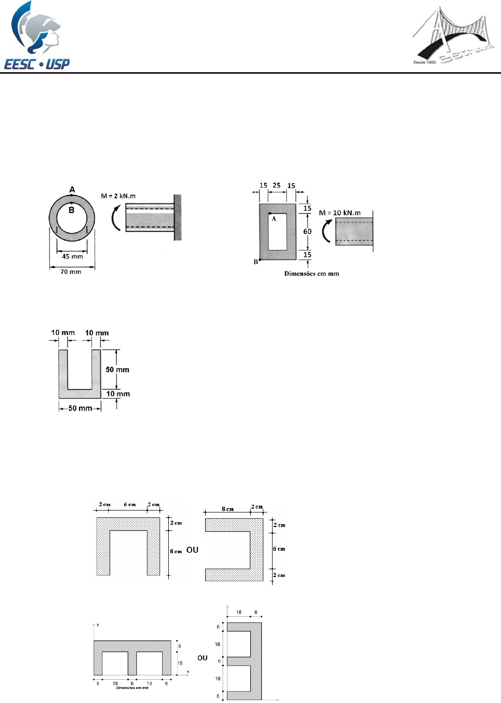 Escola de Engenharia de São Carlos / USP Departamento de Engenharia de Estruturas Lista de Exercícios – Flexão Pura 1 – Considere as vigas de seção indicada abaixo. Determine as tensões normais nos pontos A e B indicados. a) b) 2 – Determine o máximo momento fletor que pode ser aplicado à seção abaixo, considerando que a tensão admissível do material é de 150 MPa. 3 – Durante a execução de uma obra, você recebeu uma série de vigas metálicas que devem ser devidamente posicionadas. Considerando que o plano de solicitações é vertical, em que sentido as vigas abaixo devem ser posicionadas? Dica: W a) b) Escola de Engenharia de São Carlos / USP Departamento de Engenharia de Estruturas c) 4 – Considerando as figuras do exercício 3, qual o maior momento fletor que pode ser aplicado sabendo‐se que as tensões admissíveis à tração e à compressão valem, respectivamente, 120 e 150 MPa. 5 – Em uma construção existente, você foi requisitado a reforçar as vigas metálicas que compõem um dos pavimentos. Foram propostas duas maneiras de realizar o reforço. Qual das duas propostas poderia incrementar a resistência à flexão de maneira mais efetiva? Relacionada à viga sem reforço, em quanto seria esse aumento de resistência (em %)? 6 – Dada a viga composta por aço e alumínio, conforme a seção transversal mostrada na figura, determine o maior momento fletor que esta barra pode ser submetida. Considere Eaço = 210 GPa, 𝜎 ç = 120 MPa, Eal = 70 GPa, 𝜎 = 100 MPa. Escola de Engenharia de São Carlos / USP Departamento de Engenharia de Estruturas 7 – A viga de seção composta de alumínio e bronze é submetida a um momento fletor de 60 N.m. Considerando Eal = 70 GPa e Ebronze = 105 GPa, determine as tensões máximas no alumínio e no bronze. 8 – Uma viga de madeira foi reforçada em sua parte inferior com uma tira de aço. Determine a tensão máxima de tração que a viga pode resistir para a situação sem e com reforço, quando submetida a um momento no sentido apresentado na figura abaixo. Considere Eaço = 200 GPa, 𝜎 ç = 120 MPa, Emadeira = 12 GPa e 𝜎 = 50 MPa. 9 – Uma laje de concreto armado é reforçada por barras de aço de 12,5 mm de diâmetro, espaçadas em 200 mm. Se o concreto tem tensão admissível de 15 MPa e o aço admite tensão de 120 MPa, determine o maior momento fletor positivo que pode ser aplicado por metro de laje. Considere Eaço = 200 GPa e Econc = 20 GPa. Escola de Engenharia de São Carlos / USP Departamento de Engenharia de Estruturas 10 – Uma viga de concreto armado é composta por três barras de aço de 25 mm de diâmetro. Admitindo que as tensões admissíveis do aço e do concreto sejam, respectivamente, 150 MPa e 12 MPa, determine o maior momento que pode atuar na viga. Considere Eaço = 200 GPa e Econc = 20 GPa. 11 – Considerando as vigas abaixo, determine o valor das tensões normais nos pontos A, B e D indicados, assim como o ângulo que a linha neutra forma com a horizontal. 12 – Se o momento que atua na seção transversal de alumínio abaixo indicada vale M = 520 N.m, determine as tensões normais nos pontos A e B. Determine também o ângulo que a linha neutra forma com a horizontal.