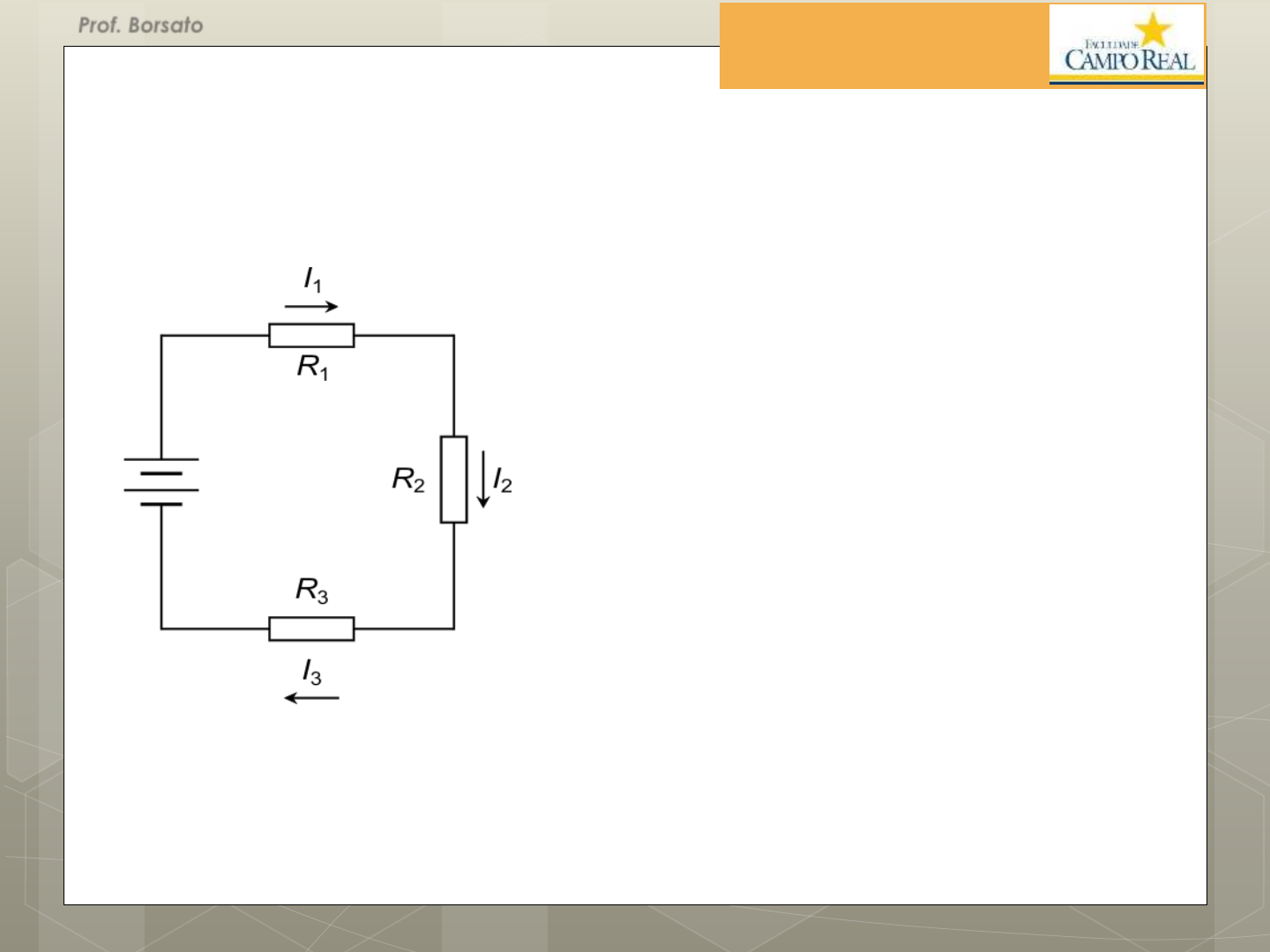 Prof. Borsato 63 PROPRIEDADES DA ASSOCIAÇÃO EM SÉRIE DE RESISTORES A corrente que circula pelos resistores é a mesma em qualquer ponto do circuito, porque só há um caminho por onde ela pode fluir. Então: I1 = I2 = I3 U Prof. Borsato 64 Cada resistor ficará submetido a uma d.d.p., de acordo com a Lei de Ohm: V1 = R1 · I1 V2 = R2 · I2 V3 = R3 · I3 A soma das tensões nos resistores é igual à força eletromotriz da fonte: U = V1 + V2 + V3 U Prof. Borsato 65 Para a fonte, é como se houvesse um único resistor no circuito solicitando cor- rente. Este resistor é o resistor equivalente Req: V = Req · I o resistor equivalente é igual à soma dos resistores associados: Req = R1 + R2 + R3 U U Prof. Borsato 66 PROPRIEDADES DOS RESISTORES ASSOCIADOS EM PARALELO Todos os resistores as- sociados são submetidos à mesma tensão V da fonte: U = V1 = V2 = V3 A corrente I fornecida pela fonte se divide pelos resistores associados, de modo que: I = I1 + I2 + I3 U Prof. Borsato 67 Da Lei de Ohm segue o cálculo das correntes individuais nos resistores: U Prof. Borsato 68 o resistor equivalente é obtido pela equação: Se somente dois resistores estiverem associados em paralelo, usa-se a regra do produto dividido pela soma: U Prof. Borsato 69 CIRCUITO ABERTO É o impedimento total à passagem da corrente elétrica através do circuito. É como se fosse ligado ao circuito um resistor de valor infinitamente grande, que representa oposição total à passagem da corrente elétrica. U Prof. Borsato 70 CURTO-CIRCUITO É a ligação intencional ou acidental entre dois ou mais pontos de um circuito, estando ou não sob d.d.p., através de um fio de resistência desprezível. U Prof. Borsato 71 O DIVISOR DE TENSÃO RESISTIVO O cálculo das tensões nos resistores é simplificado: Resistores em série formam um divisor de tensão resistivo: U U U U Prof. Borsato 72 EXERCÍCIO 3 Sabendo-se que a tensão no resistor R1 é 3 V, qual a tensão aplicada pela fonte? U Prof. Borsato 73 Solução: Como os resistores estão em série, a corrente em um deles é igual em qualquer ponto do circuito, inclusive no resistor equivalente. Req = R1 + R2 + R3 Req = 4 + 8 + 2 = 14 W A corrente no resistor 1 é obtida: Prof. Borsato 74 Sabendo que em resistores em série temos: I = I1 = I2 = I3 I = 0,75 A U = Req · I U = 14 · 0,75 U = 10,5 V Prof. Borsato 75 LEIS DE KIRCHHOFF São o resultado de um trabalho desenvolvido por Gustav Kirchhoff, que facilita o cálculo dos circuitos elétricos. Conceitos: Nó: é qualquer ponto do circuito onde concorrem três ou mais condutores. Prof. Borsato 76 Ramo: é qualquer trecho do circuito compreendido entre dois nós consecutivos. Prof. Borsato 77 Malha: é qualquer circuito fechado, formado por ramos. Prof. Borsato 78 A 1.ª Lei de Kirchhoff ou Lei dos nós diz que: A soma algébrica das correntes que chegam a um nó é igual à soma algébrica das correntes que saem deste nó. I1 + I2 = I3 Prof. Borsato 79 A corrente convencional, partindo da fonte e se dividindo pelos nós, polariza com sinal positivo o “lado” do resistor por onde ela entra. Dessa maneira, estabelecem-se as polaridades das tensões nos resistores: U Prof. Borsato 80 A 2.ª Lei de Kirchhoff ou Lei das Malhas diz: Percorrendo-se uma malha, num mesmo sentido, a soma das tensões nos elementos de circuito encontrados é igual a zero. Para aplicar a 2a Lei de Kirchhoff, considera-se, para cada tensão, o primeiro sinal encontrado no sentido do percurso. Para cada malha, o sentido do percurso é arbitrado. Prof. Borsato 81 –U + V1 + V3 + V2 = 0 U = V1 + V3 + V2 U Prof. Borsato 82 –V3 + V4 + V5 + V6 = 0 V3 = V4 + V5 + V6 U Prof. Borsato 83 – U + V1 + V4 + V5 + V6 + V2 = 0 U = V1 + V4 + V5 + V6 + V2 U Prof. Borsato 84 A resolução de circuitos elétricos contendo associações mistas de resistores não tem uma regra-padrão. Geralmente, há mais de uma maneira de visualizar o problema e encontrar a solução. A experiência é obtida com a prática. A seguinte sequência de etapas é sugerida, para resolver os circuitos de modo racional: 1. enumerar de modo organizado as grandezas conhecidas e aquelas a serem calculadas; 2. identificar os nós e as malhas do circuito; 3. atribuir a cada ramo do circuito o sentido para as correntes e a polaridade das tensões nos resistores; Prof. Borsato 85 4. escrever as equações de corrente para cada nó e as de tensões para cada malha, de acordo com as leis de Kirchhoff; 5. utilizar, sempre que possível, as propriedades das associações série e paralelo e a Lei de Ohm, para determinar tensões e correntes desconhecidas; 6. escolher as equações convenientes dentre aquelas obtidas na 4a etapa; cada equação só permite determinar uma incógnita, não sendo útil aquela que, após a substituição dos valores conhecidos, apresentar mais de um termo a ser determinado. Prof. Borsato 86 EXEMPLO No circuito abaixo: a) determinar a polaridade das tensões nos resistores; b) escrever as equações das tensões em todas as malhas; c) obter as tensões e as correntes em todos os resistores. Prof. Borsato 87 Solução: a) A corrente parte da fonte e percorre o circuito, se dividindo pelos resistores e polarizando-os como se vê: Prof. Borsato 88 As equações das correntes nos nós: nó b: I1 = I2 + I3 nó e: I2 + I4 = I1 Prof. Borsato 89 b) As equações das tensões nas malhas: malha a-b-e-f-a: V = V1 + V2 malha a-b-c-d-e-f-a: V = V1 + V3 + V4 malha b-c-d-e-b: V2 = V3 + V4 Prof. Borsato 90 c) Quando há resistores em série com a fonte, a corrente que percorre este resistor, neste caso, R1, é a mesma que sai da fonte. Para determinar a corrente fornecida pela fonte, deve ser conhecido o resistor equivalente do circuito: Prof. Borsato 91 Prof. Borsato 92 a corrente fornecida pela fonte: Conseqüentemente: I1 = 0,5 A V1 = R1 · I1 V1 = 10 · 0,5 = 5 V A equação da malha a-b-e-f-a: V = V1 + V2 10 = 5 + V2 V2 = 5 V Prof. Borsato 93 A corrente no resistor R2 é obtida pe