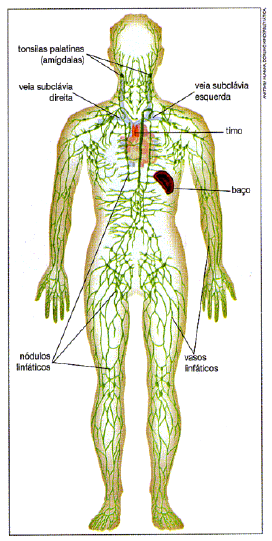 SISTEMA LINFÁTICO Sistema paralelo ao circulatório, constituído por uma vasta rede de vasos semelhantes às veias (vasos linfáticos), que se distribuem por todo o corpo e recolhem o líquido tissular que não retornou aos capilares sangüíneos, filtrando-o e reconduzindo-o à circulação sangüínea. É constituído pela linfa, vasos e órgãos linfáticos. Os capilares linfáticos estão presentes em quase todos os tecidos do corpo. Capilares mais finos vão se unindo em vasos linfáticos maiores, que terminam em dois grandes dutos principais: o duto torácico (recebe a linfa procedente da parte inferior do corpo, do lado esquerdo da cabeça, do braço esquerdo e de partes do tórax) e o duto linfático (recebe a linfa procedente do lado direito da cabeça, do braço direito e de parte do tórax), que desembocam em veias próximas ao coração. Linfa: líquido que circula pelos vasos linfáticos. Sua composição é semelhante à do sangue, mas não possui hemácias, apesar de conter glóbulos brancos dos quais 99% são linfócitos. No sangue os linfócitos representam cerca de 50% do total de glóbulos brancos. Imagem: CRUZ, Daniel. O Corpo Humano. São Paulo, Ed. Ática, 2000. Órgãos linfáticos: amígdalas (tonsilas), adenóides, baço, linfonodos ( nódulos linfáticos) e timo (tecido conjuntivo reticular linfóide: rico em linfócitos). Amígdalas (tonsilas palatinas): produzem linfócitos. Timo: órgão linfático mais desenvolvido no período prenatal, involui desde o nascimento até a puberdade. Linfonodos ou nódulos linfáticos: órgãos linfáticos mais numerosos do organismo, cuja função é a de filtrar a linfa e eliminar corpos estranhos que ela possa conter, como vírus e bactérias. Nele ocorrem linfócitos, macrófagos e plasmócitos. A proliferação dessas células provocada pela presença de bactérias ou substâncias/organismos estranhos determina o aumento do tamanho dos gânglios, que se tornam dolorosos, formando a íngua. Baço: órgão linfático, excluído da circulação linfática, interposto na circulação sangüínea e cuja drenagem venosa passa, obrigatoriamente, pelo fígado. Possui grande quantidade de macrófagos que, através da fagocitose, destroem micróbios, restos de tecido, substâncias estranhas, células do sangue em circulação já desgastadas como eritrócitos, leucócitos e plaquetas. Dessa forma, o baço “limpa” o sangue, funcionando como um filtro desse fluído tão essencial. O baço também tem participação na resposta imune, reagindo a agentes infecciosos. Inclusive, é considerado por alguns cientistas, um grande nódulo linfático. Origem dos linfócitos: medula óssea (tecido conjuntivo reticular mielóide: precursor de todos os elementos figurados do sangue). · Linfócitos T – maturam-se no timo. · Linfócitos B – saem da medula já maduros. Os linfócitos chegam aos órgãos linfáticos periféricos através do sangue e da linfa. SISTEMA ENDÓCRINO Glândulas e hormônios O sistema endócrino é formado pelo conjunto de glândulas endócrinas, as quais são responsáveis pela secreção de substância denominadas hormônios. As glândulas endócrinas (do grego endos, dentro, e krynos, secreção) são assim chamados por que lançam sua secreção (hormônios) diretamente no sangue, por onde eles atingem todas as células do corpo. Cada hormônio atua apenas sobre alguns tipos de células, denominadas células-alvo. As células alvo de determinado hormônio possuem, na membrana ou no citoplasma, proteínas denominadas receptores hormonais, capazes de se combinar especificamente com as moléculas do hormônio. É apenas quando a combinação correta ocorre que as células-alvo exibem as respostas características da ação hormonal. A espécie humana possui diversas glândulas endócrinas, algumas delas responsáveis pela produção de mais de um tipo de hormônio: Hipotálamo Sistema Endócrino: Hipotálamo. Se localiza na base do encéfalo, sob uma região encefálica denominada tálamo. A função endócrina do hipotálamo está a cargo das células neurossecretoras, que são neurônios especializados na produção e na liberação de hormônios. Hipófise (ou glândula Pituitária) A hipófise é dividida em três partes, denominadas lobos anterior, posterior e intermédio, esse último pouco desenvolvido no homem. O lobo anterior (maior) é designado adeno-hipófise e o lobo posterior, neuro-hipófise. Hormônios produzidos no lobo anterior da hipófise * Samatotrofina (GH) - Hormônio do crescimento. * Hormônio tireotrófico (TSH) - Estimula a glândula tireóide. * Hormônio adrenocorticotrófico (ACTH) - Age sobre o córtex das glândulas supra-renais. * Hormônio folículo-estimulante (FSH) - Age sobre a maturação dos folículos ovarianos e dos espermatozóides. * Hormônio luteinizante (LH) - Estimulante das células intersticiais do ovário e do testículo; provoca a ovulação e formação do corpo amarelo. * Hormônio lactogênico (LTH) ou prolactina - Interfere no desenvolvimento das mamas, na mulher e na produção de leite. * Os hormônios designados pelas siglas FSH e LH podem ser reunidos sob a designação geral de gonadotrofinas. Hormônios produzidos pelo lobo posterior da hipófise * Oxitocina - Age particularmente na musculatura lisa da parede do útero, facilitando, assim, a expulsão do feto e da placenta. * Hormônio antidiurético (ADH) ou vasopressina - Constitui-se em um mecanismo importante para a regulação do equilíbrio hídrico do organismo.