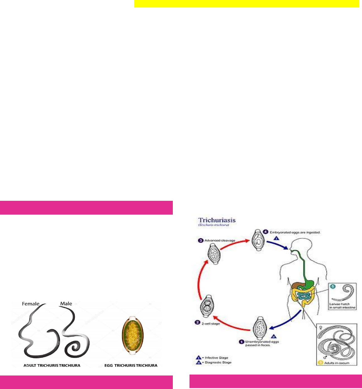 LARA BIANCA CARDOSO PEREIRA | MED UEMA XVI | @LIFESTYLEMEDICINA Trichuris Trichiura e outros Trichuridas Esses nematódeos têm como característica especial a ausência de órgãos sensoriais denominados fasmídes, além da ausência de canais laterais do sistema excretor e a presença de uma capsula bucal muito reduzida ou ausente. Trichuris Trichiura É o agente etiológico da tricuríase, mais prevalente em regiões de clima quente e úmido e condições sanitárias precárias. MORFOLOGIA Os vermes adultos possuem formato de chicote, sendo os machos menores que as fêmeas. Eles possuem dimorfismo sexual: os machos apresentam extremidade posterior curvada, com testículos e espículo e as fêmeas possuem vulva, útero e ovário. Os ovos apresentam forma elíptico característico (formato de barril) com poros salientes e transparentes nas extremidades. CICLO DE VIDA 1- Machos e fêmeas habitam o intestino grosso de humanos, principalmente o ceco e o cólon ascendente. Nas infecções mais intensas, podem ocupar o cólon distal, reto e porção distal do íleo. Toda a região esofagiana do parasito penetra na camada epitelial do intestino, onde se alimenta de enterócitos lisados no sangue. Já a porção posterior do parasito permanece exposta no lúmen intestinal, facilitando a reprodução e eliminação dos ovos. 2 e 3- o embrião contido dentro do ovo eliminado se desenvolve para se tornar infectante 4- Os ovos infectantes podem contaminar alimentos, podendo, assim, ser ingeridos pelo homem 5- Os ovos eclodem por um dos seus poros no intestino delgado do hospedeiro, estimulado pelo suco gástrico e pancreático. No desenvolvimento das larvas nos humanos, alguns autores relatam que as larvas penetram na região duodenal (criptas de Lieberkuhn) e, posteriormente, as larvas ganham a luz intestinal e migram para região cecal, onde completam seu desenvolvimento, passando pelos 4 estágios de larvais típicos. O crescimento e desenvolvimento dos vermes levam ao rompimento das células epiteliais e à exposição da porção posterior do corpo do verme. SINTOMATOLOGIA • Dor de cabeça • Dor epigástrica e na região inferior do abdome • Diarreia • Náusea • Vômitos • Sangue nas fezes • Anemia • Desnutrição grave • Prolapso retal com hemorroidas • Apendicite • Síndrome disentérica crônica LARA BIANCA CARDOSO PEREIRA | MED UEMA XVI | @LIFESTYLEMEDICINA ALTERAÇÕES IMUNOPATOLÓGICAS • Aumento da produção de muco intestinal • Descamação epitelial • Eosinófilos • TNF DIAGNÓSTICO LABORATORIAL • Métodos quantitativos: Stoll e Kato – Katz • Métodos qualitativos: Willis, Hoffmann, Ritchie, etc. • Colonoscopia • Anoscopia TRATAMENTO • Anti-helminticos tem difícil acesso ao intestino grosso • Benzoilmidazóis (albendazol e mebendazol) • Emprego de um purgativo salino (sulfato de sódio ou limonada purgativa citromagnesiana) na véspera do tratamento, com o objetivo de deixar vazio o intestino grosso e eliminar o muco que reveste sua mucosa. • Leite de figueira, - ficina (a papaína tem ação semelhante com emprego limitado). • êxito variável os sais de piperazina, o iodeto de ditiazanina e o tiabendazol PROFILAXIA • Saneamento básico • Educação sanitária • Construção de fossas sépticas • Lavar as mãos antes de tocar os alimentos • Tratamento das pessoas parasitadas • Proteção dos alimentos contra moscas e baratas. Trichinella Spiralis MORFOLOGIA Os machos apresentam prolongações laterais denominadas pseudobolsas copulatórias e são menores que as femeas, as quais apresentam abertura vaginal e são vivíparas. Esses parasitos têm pouca especificidade, podendo infectar diversos mamíferos, causando triquenelose. CICLO DE VIDA A infecção ocorre por meio da ingestão de carne contendo L1 encistada na musculatura. Após a passagem no estomago, as larvas são liberadas do cisto e penetram no epitélio da mucosa duodenal, estabelecendo-se dentro dos enterócitos, onde sofrem mudas até a fase adulta. As femeas liberam larvas na circulação sistêmica (veia porta) e essas podem causar inflamação transitória em diversos tecidos. As larvas fixam-se nos músculos (miosite), formando cistos infectantes. SINTOMATOLOGIA • Náusea/vomito • Diarreia e edema intestinal • Encefalite, miocardite, nefrite... • Dor muscular • Dificuldade respiratória e danos cardíacos DIAGNÓSTICO: biópsia muscular e testes imunológicos TRATAMENTO: Tiabendazol (não tem droga específica) + corticoide e analgésicos