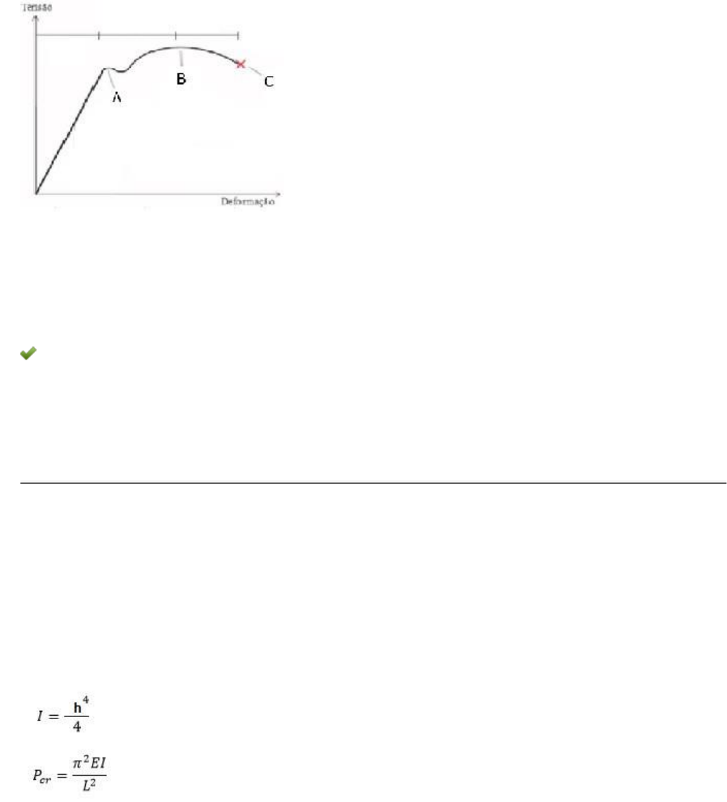 17/04/2020 UNIASSELVI - Centro Universitário Leonardo Da Vinci - Portal do Aluno - Portal do Aluno - Grupo UNIASSELVI https://portaldoalunoead.uniasselvi.com.br/ava/notas/request_gabarito_n2.php 1/5 1. Um determinado material foi submetido a um ensaio de tração, onde gerou a curva de tensão versus deformação conforme imagem anexa. Sendo assim, assinale a alternativa CORRETA que corresponde a cada fase de deformação do material ensaiado: a) C=Tensão de escoamento A=Tensão máxima de tração B=Ruptura b) A=Tensão de escoamento C=Tensão máxima de tração B=Ruptura c) A=Tensão de escoamento B=Tensão máxima de tração C=Ruptura d) B=Tensão de escoamento A=Tensão máxima de tração C=Ruptura 2. Uma coluna suportada por roletes tem seção transversal quadrada de 100 x 100mm e 2m de comprimento, sendo constituída por um material cujo módulo de elasticidade é E = 200 GPa. Calcule o momento de inércia e a carga crítica de Euler para a flambagem, e classifique V para as sentenças verdadeiras e F para as falsas: ( ) A carga crítica de Euler par à flambagem na coluna é igual a 4110 kN. ( ) O momento de inércia "I" da seção é igual a 8,33 x 10^-6 m^4. ( ) A carga crítica de Euler par à flambagem na coluna é igual a 411 MPa. ( ) O momento de inércia "I" da seção é igual a 8,33 x 10^6 mm^4. Assinale a alternativa que apresenta a sequência CORRETA: 17/04/2020 UNIASSELVI - Centro Universitário Leonardo Da Vinci - Portal do Aluno - Portal do Aluno - Grupo UNIASSELVI https://portaldoalunoead.uniasselvi.com.br/ava/notas/request_gabarito_n2.php 2/5 4. A imagem a seguir engloba cinco tipos de esforços diferentes. Assinale a alternativa CORRETA que apresenta respectivamente cada um deles: FONTE: https://i.pinimg.com/originals/1d/0d/1c/1d0d1c96a823be3a7eefb45dabccb5c9.jpg. Acesso em: 26 set. 2018. 5. A viga ABC ilustrada na figura seguinte tem apoios simples A e B e uma extremidade suspensa de B até C. O comprimento do vão é de 4,6 cm e o comprimento da extremidade suspensa é de 2,8 cm. Um carregamento uniforme de intensidade q = 110 N/m atua ao longo de todo o comprimento da viga. Encontre as forças reativas "RA" e "RB". 6. Encontre as tensões principais que atuam no ponto, mostrado na figura a seguir, utilizando o "Círculo de Mohr". a) F - V - V - F. b) V - V - F - V. c) V - F - F - V. d) F - F - V - V. 3. A Lei de Hooke descreve a relação linear entre a força e a deformação de um corpo. De acordo com esta lei: a) A força e a deformação são diretamente proporcionais quando atuam dentro do limite de proporcionalidade. b) A força e a deformação são indiretamente proporcionais. c) A força e a deformação não são proporcionais. d) A força e a deformação são diretamente proporcionais quando atuam fora do limite de proporcionalidade. a) 1 - Tração / 2 - Cisalhamento / 3 - Flexão / 4 - Torção / 5 - Compressão. b) 1 - Tração / 2 - Compressão / 3 - Cisalhamento / 4 - Flexão / 5 - Torção. c) 1 - Tração / 2 - Torção / 3 - Compressão / 4 - Flexão / 5 - Cisalhamento. d) 1 - Cisalhamento / 2 - Tração / 3 - Torção / 4 - Flexão / 5 - Rotação. a) As forças reativas são: RA = 0,159261 N e RB = 0,654739 N. b) As forças reativas são: RA = -80,3383 N e RB = 88,4783 N. c) As forças reativas são: RA = 1,59261 N e RB = 6,54739 N. d) As forças reativas são: RA = 7,83882 N e RB = 88,4783 N. 17/04/2020 UNIASSELVI - Centro Universitário Leonardo Da Vinci - Portal do Aluno - Portal do Aluno - Grupo UNIASSELVI https://portaldoalunoead.uniasselvi.com.br/ava/notas/request_gabarito_n2.php 3/5 7. Com relação aos diferentes estados de tensão num ponto, analise as sentenças a seguir: I- Estado Triplo ou Tri-Axial: as tensões que atuam nas faces do paralelepípedo elementar admitem componentesnas direções de todas as suas arestas. II- Estado Simples ou Uniaxial: nas faces do paralelepípedo atuam tensões na direção de uma única aresta.III- Estado de Cisalhamento Puro: nas faces do paralelepípedo atuam apenas tensões tangenciais. O simples valor "sigma" xy = "sigma" yx é suficiente para definir o estado de tensão no ponto. 8. Em um ponto de um corpo sob tensão, existem sobre os planos horizontal e vertical as tensões, como na figura. As tensões principais no ponto são de 100MPaC e de 30MPaT. Determine em MPa: 9. Um cilindro maciço é feito em um material cuja Tensão de Escoamento é 250 MPa. Para essa tensão, a deformação (elástica), verificada em um ensaio de Tensão vs. Deformação, é 0,0015. O cilindro apresenta diâmetro de 10 mm, comprimento de 150 mm e índice de esbeltez Ie = 60 mm. Considerando que o cilindro será utilizado como coluna apoiada por pino, determine a sua tensão crítica e se ocorre flambagem elástica ou inelástica e classifique V para as sentenças verdadeiras e F para as falsas. ( ) Tensão crítica ~ 225,65 Pa. ( ) Tensão crítica ~ 456,93 Pa ( ) Não ocorre flambagem inelástica, pois a tensão crítica é menor que a tensão de escoamento. ( ) Ocorre flambagem inelástica, pois a tensão crítica é maior que a tensão de escoamento. Assinale a alternativa que apresenta a sequência CORRETA: a) As tensões principais são: 3,38 ksi e - 21,38 ksi. b) As tensões principais são: 2,38 ksi e -14,38 ksi. c) As tensões principais são: 3,49 ksi e - 12,5 ksi. d) As tensões principais são: 2,49 ksi e - 14,5 ksi. Assinale a alternativa CORRETA: a) Somente as sentenças I e II estão corretas. b) Somente as sentenças I e III estão corretas. c) Todas as sentenças estão corretas. d) Somente as sentenças II e III estão corretas. a) R: 45 e 90. b) R: 25 e 95. c) R: 35 e 70. d) R: 25 e 75. 17/04/2020 UNIASSELVI - Centro Universitário Leonardo Da Vinci - Portal do Aluno - Portal do Aluno - Grupo UNIASSELVI https://portaldoalunoead.uniasselvi.com.br/ava/notas/request_gabarito_n2.php 4/5 10.Em relação ao CÍRCULO de MOHR, leia as sentenças a seguir: I- Estabelecer um sistema de coordenad