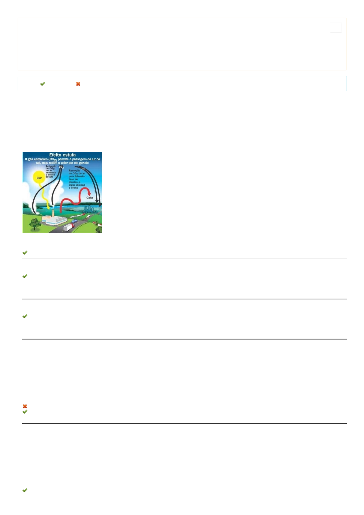 17/04/2020 UNIASSELVI - Centro Universitário Leonardo Da Vinci - Portal do Aluno - Portal do Aluno - Grupo UNIASSELVI https://portaldoalunoead.uniasselvi.com.br/ava/avaliacao/avaliacao_lista.php 1/3 Acadêmico: Flavia de Nobre Campelo (2000358) Disciplina: Recursos Naturais e Fontes de Energia (BID35) Avaliação: Avaliação Final (Objetiva) - Individual FLEX ( Cod.:513768) ( peso.:3,00) Prova: 15833720 Nota da Prova: 10,00 Legenda: Resposta Certa Sua Resposta Errada 1. Toda e qualquer mudança que ocorra no meio ambiente causa um impacto ambiental, alterando as condições do meio e pode ocorrer direta ou indiretamente. Partindo do exposto, o imagem anexa e analise as sentenças a seguir: I- As indústrias são as únicas responsáveis pelo efeito estufa. II- As plantas e as algas são responsáveis por reduzir a quantidade de CO2 na atmosfera. III- Os meios de transportes possuem uma parcela da responsabilidade do aquecimento global. Agora, assinale a alternativa CORRETA: FONTE DA IMAGEM: Disponível em: <http://www.sobiologia.com.br/conteudos/bio_ecologia/ecologia29.php>. Acesso em: 27 jul. 2015. a) As sentenças I e III estão corretas. b) Somente a sentença II está correta. c) As sentenças I e II estão corretas. d) As sentenças II e III estão corretas. 2. A aplicação da biomassa como matriz energética é possibilidade muito sapiente, devido às suas inúmeras vantagens, visto a crise energética e ambiental que estamos vivenciando. às vantagens da biomassa, assinale a alternativa CORRETA: a) Os resíduos são reaproveitados. b) Custo elevado para operação. c) Fonte de energia esgotável. d) Baixa efetividade energética. 3. O solo é um dos recursos naturais renováveis mais afetados pelas atividades antrópicas. O solo é base da estrutura das culturas agrícolas, pois é nele que as plantas encontram as c necessárias para se desenvolverem. Partindo do exposto, assinale a alternativa CORRETA que apresenta condições edafoclimáticas: a) Relevo, temperatura, vento e clima. b) Solo, clima, vento e luz. c) Relevo, temperatura, vento e pH das plantas. d) Água, calor, vento e solo. 4. Atualmente, estamos enfrentando uma crise energética mundial. Quanto mais a população cresce, mais aumenta a demanda de energia elétrica e, por diversos fatores ambientais, le impactos ambientais, muitas das fontes naturais para a produção de energia estão se esgotando. A exemplo disso, podemos citar a água utilizada nas hidrelétricas. Devido a este ce vez mais, as pesquisas científicas buscam, através das tecnologias aplicadas, novas fontes de energia limpas e renováveis. Com relação às novas fontes de energia, classifique V pa sentenças verdadeiras e F para as falsas: ( ) A conversão de energia solar em elétrica através de células fotovoltaicas é um dos marcos tecnológicos energéticos. ( ) As células fotovoltaicas são práticas e versáteis, podendo ser aplicadas em locais de difícil acesso. ( ) O custo-benefício da aplicação das células fotovoltaicas, isentas de poluição, é atrativo. Agora, assinale a alternativa que apresenta a sequência CORRETA: a) V - F - V. b) V - V - F. c) V - V - V. d) F - F - F. 5. As ações antrópicas têm ocasionado diversos impactos negativos sobre os sistemas naturais, sendo que a reversão desse quadro muitas vezes exige complexas interferências e m comportamento das pessoas envolvidas. Com base no exposto, classifique V para as sentenças verdadeiras e F para as falsas: ( ) Os sistemas naturais, por terem se formado há milhares de anos, são considerados complexos e resistentes, sendo relativamente difícil impactá-los através das ações humanas ( ) Uma das consequências da interferência humana sob os sistemas naturais é a eutrofização dos ambientes aquáticos. ( ) Entre os impactos das ações humanas sobre os ambientes naturais, pode-se citar o aumento da biodiversidade nativa, resultando em enriquecimento biológico. ( ) Para que haja o desenvolvimento de políticas racionais de gerenciamento do ambiente, é imprescindível o conhecimento profundo do ambiente. Agora, assinale a alternativa que apresenta a sequência CORRETA: a) V - V - F - F. b) F - F - V - F. c) F - V - F - V. 17/04/2020 UNIASSELVI - Centro Universitário Leonardo Da Vinci - Portal do Aluno - Portal do Aluno - Grupo UNIASSELVI https://portaldoalunoead.uniasselvi.com.br/ava/avaliacao/avaliacao_lista.php 2/3 d) V - F - V - V. 6. A agroecologia preconiza a conservação da fertilidade do solo, pois ao diversificar culturas o solo não é sobrecarregado, assim preservando sua integridade. Desta forma, analise as seguir: I- Ocorre o fechamento dos ciclos de nutrientes. II- Conserva o solo e o ciclo biológico da água. III- Diminuição do controle biológico de pragas através do excesso de agrotóxicos. Agora, assinale a alternativa CORRETA: a) As sentenças II e III estão corretas. b) Somente a sentença III está correta. c) As sentenças I e III estão corretas. d) As sentenças I e II estão corretas. 7. As fontes de energia não renováveis são causadoras de inúmeros problemas ao meio ambiente, pois são altamente poluidoras, liberam gases de efeito estufa, são esgotáveis e aind responsáveis por diversos desastres ambientais. Entretanto, fontes de energia não renováveis contemplam algumas vantagens. Sobre as vantagens presentes nas fontes de energia renováveis, analise as sentenças a seguir: I- Proporcionam a geração de empregos. II- Regeneram-se facilmente na natureza. III- Há apenas uma forma de processamento. IV- Apresentam facilidade de transporte. Agora, assinale a alternativa CORRETA: a) Somente a sentença II está correta. b) As sentenças II e III estão corretas. c) Somente a sentença I está correta. d) As sentenças I e IV estão corretas. 8. As fontes de energia renováveis geralmente são limpas e por isso não causam impactos ambientais. Neste sentido, este tipo de energia deve ser cada vez mais estudada e util