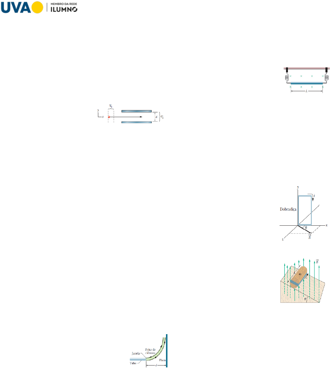 1aLista Exercícios Física III (Capítulo 28 ) Fonte: Fundamentos da Física – David Halliday, Robert Resnick, Jearl Walker. (vol. 3 – 8a. ed.) Prof Marcelo Diniz 1. Um elétron que tem velocidade 2,0x106m/si + 3,0x106m/sj, penetra num campo magnético B = 0,030i – 0,15j. (a) Determine o módulo, a direção e o sentido da força sobre o elétron. (b) Repita o cálculo para um próton tendo a mesma velocidade. 3. Um próton que se move num ângulo de 23o (em relação a um campo magnético de intensidade 2,6mT experimenta uma força magnética de 6,5x10-17N. Calcular: (a)a velocidade escalar e (b) a energia cinética em eV. 7. Na figura um elétron acelerado a partir do repouso por uma diferença de potencial V1 = 1,00kV entra no espaço entre duas placas paralelas, separadas por uma distância d = 20,0mm, entre as quais existe uma diferença de potencial V2 = 100V. A placa inferior está a um potencial menor. Despreze o efeito de borda e suponha que o vetor velocidade do elétron é perpendicular ao vetor campo elétrico na região entre as placas. Em termos dos vetores unitários, qual é o campo magnético uniforme para o qual a trajetória do elétron na região entre as placas é retilínea? 9. Um elétron possui uma velocidade inicial de (12,0j + 15,0 k)km/s e uma aceleração constante de (2,00 x 1012 m/s2 )i em uma região na qual existem um campo elétrico e um campo magnético, ambos uniformes. Se B = (400mT) i, determine o campo elétrico. 13. Uma fita de cobre com 150mm de espessura e 4,5mm de largura é submetida a um campo magnético uniforme de módulo 0,65T, com perpendicular à fita. Quando uma corrente i = 23A atravessa a fita, uma diferença de potencial V aparece entre suas bordas. Calcule V. (A concentração de portadores de carga no cobre é 8,47 x 1028 elétrons/m3.) 17. Um elétron de 1,2keV está circulando num plano perpendicularmente a um campo magnético uniforme. O raio da órbita é igual a 25cm. Calcule: a) a velocidade do elétron, b) o campo magnético, c) a freqüência da rotação, d) o período do movimento. 19. Campos magnéticos são freqüentemente usados para curvar um feixe de elétrons em experimentos de física. Que campo magnético uniforme, aplicado perpendicularmente a um feixe de elétrons que se move a 1,3x106m/s, é necessário para fazer com que os elétrons percorram uma trajetória circular de raio 0,35m? 17. Um feixe de elétrons cuja energia cinética é K emerge da “janela” de uma folha delgada, existente na extremidade de um tubo acelerador. Existe uma placa de metal a uma distância d desta janela e perpendicular à direção do feixe emergente. Mostre que podemos evitar que o feixe colida com a placa se aplicarmos um campo magnético B tal que B ≥ (2mK/e2d2)1/2. 31. Num espectrômetro de massa, usado para fins comerciais, íons de urânio de massa igual a 3,92x10-25kg e carga 3,2x10-19C são separados pelas espécies relacionadas. Primeiramente, os íons são acelerados através de uma diferença de potencial de 100kV e, então, passam dentro de um campo magnético, onde são deslocados numa trajetória de raio igual a 1,0m. Depois de ter viajado através de 180o , eles são coletados numa taça de 1,0cm de raio. a) Qual é o módulo do campo magnético(perpendicular) no separador? Se a máquina é feita para separar 100mg de material por hora, calcule: b) a corrente dos íons contidos na máquina e c) a energia térmica dissipada na taça durante uma hora. 27. Um elétron descreve uma trajetória helicoidal em um campo magnético uniforme de módulo 0,300T. O passo da hélice é 6,00μm, e o módulo da força magnética experimentada pelo elétron é 2,00 x 10-15 N. Qual é a velocidade do elétron? 29. Um pósitron de 2,0keV é projetado para dentro de um campo magnético uniforme B de 0,10T com o seu vetor velocidade fazendo um ângulo de 89o com B. Determine: a) o período, b) o passo, c) o raio da trajetória helicoidal. 39. Um fio de massa 13g e 62cm de comprimento está suspenso por um par de condutores espirais flexíveis, num campo magnético de 0,44T. Quais são o módulo e o sentido da corrente que anula o valor da tensão nos fios de suporte? 41. Um condutor horizontal numa linha de força transporta uma corrente de 5000A do sul para o norte. O campo magnético da Terra (60µT) está direcionado para o norte e inclinado para baixo de um ângulo de 70o com a linha horizontal. Determine o módulo, a direção e o sentido da força magnética devida ao campo da Terra sobre 100m do condutor. 43. Um fio de comprimento 50cm que está situado ao longo do eixo x e uma corrente de 0,50A passa através dele no sentido de x positivo. O fio está imerso num campo magnético dado em T e B = 0,0030j + 0,010k. Determine os componentes da força sobre o fio. 45. Uma barra de cobre de 1,0kg está em repouso sobre dois trilhos horizontais que distam 1,0cm um do outro e permite a passagem de uma corrente de 50A de um trilho para o outro. O coeficiente de atrito estático é de 0,60. Qual é o menor campo magnético (não necessariamente vertical) que daria início ao movimento da barra? 47. A Figura mostra uma bobina de retangular, com 20 voltas de fio, de dimensões 10,0cm por 5,0cm. Ela transporta uma corrente de 0,10A e pode girar em torno de um lado longo. Ela está montada com seu plano fazendo um ângulo de 30o com a direção de um campo magnético uniforme de 0,50T. Calcular o torque que atua sobre a bobina em torno do eixo que passa pelo lado longo. 53. A Figura mostra um cilindro de madeira com massa 0,25kg e comprimento L= 0,10m, com N=10 voltas de fio enrolado em torno dele longitudinalmente, de modo que o plano da bobina, assim, formada, contenha o eixo do cilindro. Qual é a corrente mínima através da bobina capaz de impedir o cilindro de rolar para baixo no plano inclinado de θ em relação à horizontal, na presença de um campo magnético uniforme vertical de 0,50T, se o plano dos enrolamentos for paral