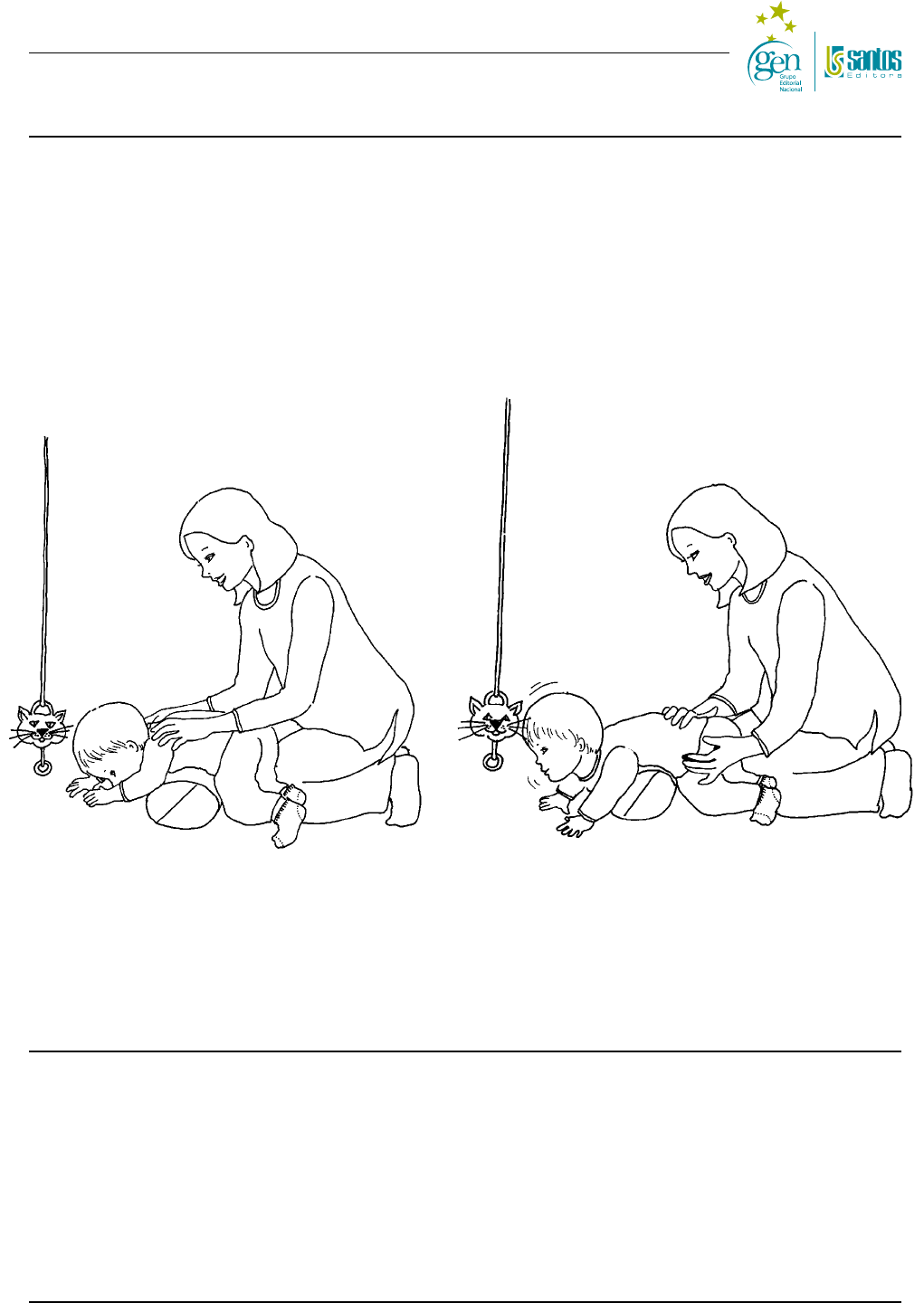 Método SARAH – Reabilitação baseada na família e no contexto da criança com lesão cerebral Desenvolvimento Motor © Livraria Santos Editora Lúcia Braga & Campos da Paz Atividade 1 Equilíbro cervical na posição prona Objetivo: Favorecer o equilíbrio de cabeça na posição prona, o uso dos braços para o apoio e o controle da musculatura do tronco superior. Como fazer: Posicione a criança na posição prona, sobre uma superfície firme. Coloque um rolo ou uma rampa pequena de espuma sob o seu abdômen para facilitar a elevação da cabeça. À medida que houver melhora do equilíbrio, incentive o apoio em antebraços e a elevação do tronco. Motive a criança a buscar estímulos visuais e auditivos durante a atividade.