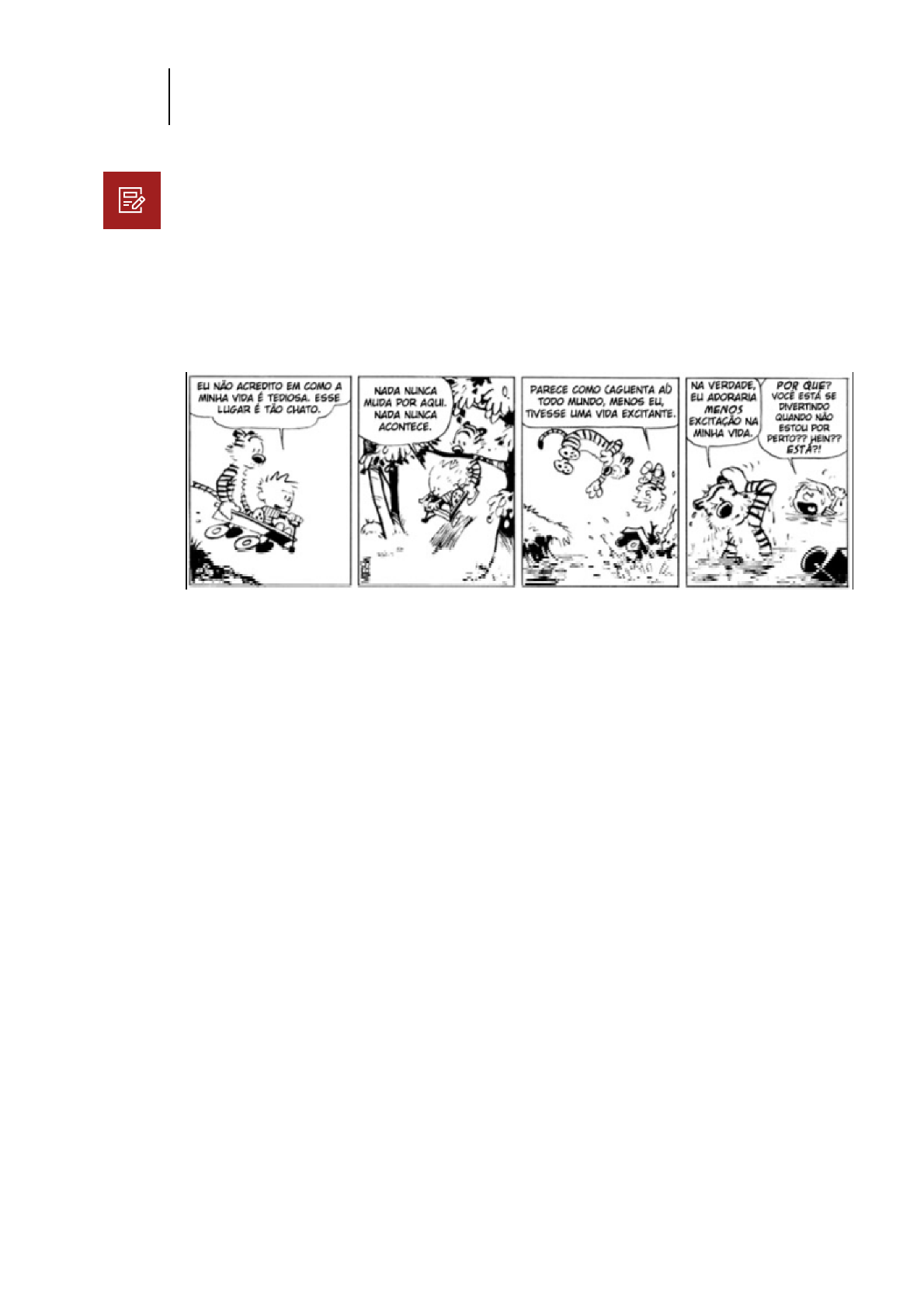 25/04/2020 Gabarito da atividade para avaliação - Semana 6: LEITURA E PRODUÇÃO DE TEXTOS - LET110 https://cursos.univesp.br/courses/3059/pages/gabarito-da-atividade-para-avaliacao-semana-6 1/4 LEITURA E PRODUÇÃO DE TEXTOS - LET110 Discurso & adequação6 A resposta correta da questão está identificada com a cor Vermelha. ATIVIDADE PARA AVALIAÇÃO (2 pontos) Leia a tirinha de Calvin e Haroldo a seguir: É correto afirmar que: JUSTIFICATIVA A tirinha produz um efeito de ironia justamente porque as imagens, que retratam momentos ativos e brincadeiras excitantes, se contrapõem à narração de Calvin sobre esses momentos que descreve como tediosos, chatos e monótonos. 1. a tirinha pretende colocar em causa a questão do ciúme infantil.a. a expressão facial de Haroldo indica que ele está entusiasmado com a reflexão de Calvin. b. Calvin é uma criança verdadeiramente entediada e reclusa.c. as imagens se contrapõem às falas de Calvin, produzindo um efeito de ironia.d. Calvin percebe que está se divertindo apenas no último quadrinho.e. (2 pontos) Leia a tirinha de Allan Sieber a seguir:2. 25/04/2020 Gabarito da atividade para avaliação - Semana 6: LEITURA E PRODUÇÃO DE TEXTOS - LET110 https://cursos.univesp.br/courses/3059/pages/gabarito-da-atividade-para-avaliacao-semana-6 2/4 É correto afirmar que: JUSTIFICATIVA O primeiro quadrinho traz o significado absoluto dado pelo rapaz ao relacionamento, enquanto os dois últimos quadrinhos relativizam esse significado, de modo a confirmar o título da tirinha. a leitura do primeiro quadrinho traz o significado relativo dado pelo rapaz ao relacionamento. a. o aumento dos balões e a consequente diminuição das personagens produz um efeito de ambiguidade. b. o segundo e o terceiro quadrinhos têm a função de relativizar o significado absoluto dado pelo rapaz ao relacionamento. c. há uma continuidade evidente entre o primeiro e o segundo quadrinho.d. o sentido do título da tirinha “Eu não te amo” vai sendo desfeito ao longo dos quadrinhos. e. (2 pontos) Leia o anúncio publicitário a seguir: Assinale verdadeiro (V) ou falso (F): 3. 25/04/2020 Gabarito da atividade para avaliação - Semana 6: LEITURA E PRODUÇÃO DE TEXTOS - LET110 https://cursos.univesp.br/courses/3059/pages/gabarito-da-atividade-para-avaliacao-semana-6 3/4 JUSTIFICATIVA • O anúncio não zomba do Deus católico, apenas faz uma referência à expressão comum “mãos de Deus”. • O objeto central do anúncio é o papamóvel, presente também na assinatura do texto. • Como o papa representa a religião católica, o objetivo central do anunciante é dialogar com esse público, maioria no Brasil à época. • Ao aproximar o papa e o cidadão comum, por meio da ação de contratar um seguro, o texto pretende provocar humor em seus leitores. [ VERDADEIRO | FALSO ] O anúncio é ofensivo na medida em que zomba do Deus católico. a. [ VERDADEIRO | FALSO ] A imagem representa o objeto central do anúncio.b. [ VERDADEIRO | FALSO ] A seguradora pretende atingir, sobretudo, os fiéis católicos com o anúncio. c. [ VERDADEIRO | FALSO ] O texto central em negrito pretende produzir um efeito de humor. d. (2 pontos) Suponha que você é uma professora ou um professor da Educação Básica e vá trabalhar com a seguinte tirinha em aula: De acordo a problematização do conceito de adequação linguística, discutida nesta Semana 6, qual dos exercícios a seguir você escolheria? 4. Passe para a norma culta o texto dos balões.a. Elenque as palavras escritas em dissonância com a ortografia padrão.b. Comente o sentido da palavra “cas” no terceiro quadrinho.c. Discuta os impactos negativos da tirinha de Chico Bento para o processo de alfabetização. d. 25/04/2020 Gabarito da atividade para avaliação - Semana 6: LEITURA E PRODUÇÃO DE TEXTOS - LET110 https://cursos.univesp.br/courses/3059/pages/gabarito-da-atividade-para-avaliacao-semana-6 4/4 JUSTIFICATIVA Todas as demais alternativas contrariam a problematização do conceito de adequação, conforme discutido no texto de Barzotto. Explique por que devemos adaptar nossa maneira de falar às situações de comunicação. e. (2 pontos) A partir do texto de Eni Orlandi, “Discurso, imaginário social e conhecimento”, é possível afirmar que: JUSTIFICATIVA A autora afirma que: “É no discurso que se pode apreender a relação entre linguagem e ideologia, tendo a noção de sujeito como mediadora: não há discurso sem sujeito nem sujeito sem ideologia.” (p. 54) 5. todo discurso é portador de ideologia.a. a ideologia existe na maior parte dos discursos.b. a linguagem é transparente.c. o sentido de um discurso independe do momento histórico.d. apenas alguns discursos fazem referência a outros discursos.e.