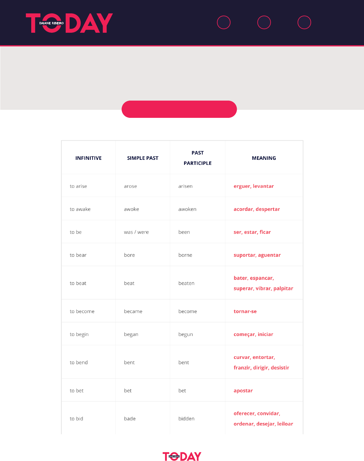 SUPER LISTA DE VERBOS IRREGULARES EM INGLÊS TODAYLEADTODAYLEAD TODAY_LEADINGLÊS DO SEU JEITO PAGE 1TODAYLEAD.COM ARTIGO COMPLETÃO AQUI SE TIVER DÚVIDA VEJA O https://www.todaylead.com/ http://www.todaylead.com/inscreva https://www.facebook.com/todaylead https://www.instagram.com/today_lead/ https://goo.gl/yEiLjf PAGE 2TODAYLEAD.COM PAGE 3TODAYLEAD.COM PAGE 4TODAYLEAD.COM PAGE 5TODAYLEAD.COM PAGE 6TODAYLEAD.COM PAGE 7TODAYLEAD.COM PAGE 8TODAYLEAD.COM PAGE 9TODAYLEAD.COM ESTÁ COM DÚVIDA? FALE COMIGO BABY DAIANE RIBEIRO | COOL TEACHER © C O P Y R I G H T - T O D A Y L E A D - I N G L Ê S D O S E U J E I T O TODAYLEAD TODAYLEAD TODAY_LEAD TODAY_LEAD INSCREVA-SE http://www.todaylead.com/inscreva http://www.todaylead.com/inscreva https://www.facebook.com/todaylead https://www.instagram.com/today_lead/ https://www.twitter.com/today_lead