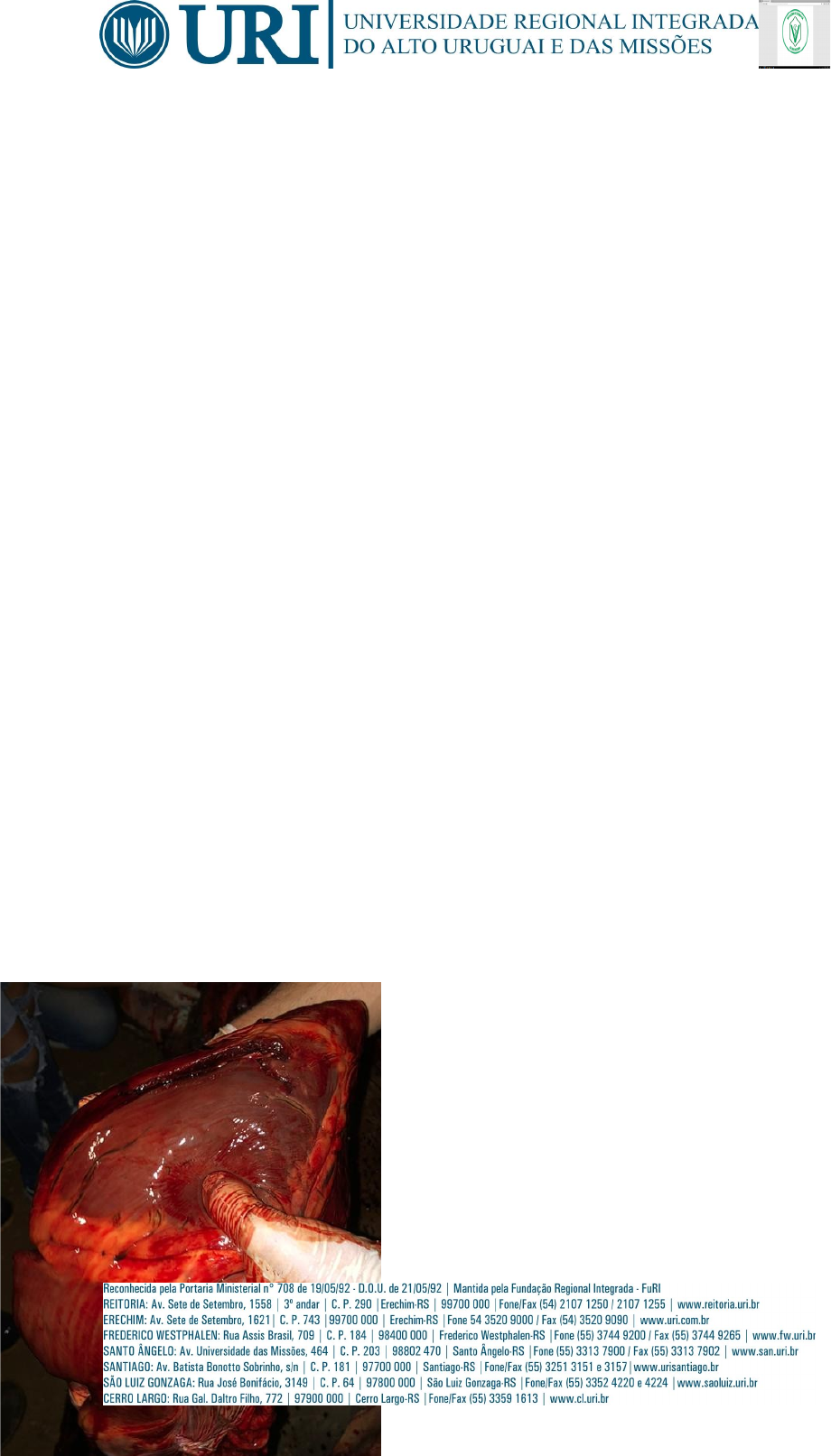 RELATÓRIO DE AULA PRÁTICA Luana Krenczinski e Milena Centenaro TÍTULO Necropsia em equinos Os cavalos são mamíferos quadrúpedes, do gênero Equus, além deles serem animais herbívoros, pois passam até 16 horas se alimentando por dia de capim e ervas. Sendo que eles possuem apenas um estômago (monogástrico ). A técnica da necropsia, serve para observarmos e diagnosticar o animal com sintomas de doenças, para realizarmos a técnica precisamos da autorização do proprietário , anamnese detalhada de como se comportava , e se alimentava este animal . Os rins se situam encostados no diafragma e aos músculos psoas, cada um fechado com cápsula de gordura. O rim direito se encontra as últimas duas ou três costelas e ao primeiro processo lombar transverso, tem o formato de coração em uma carta de baralho, rim esquerdo se situa ventralmente na última costela e aos primeiros dois ou tres processos, e está, portanto, meio rim de comprimento mais caudal do seu par, tem formato mais convencional. Ambos são achatados dorsoventralmente. As cólicas renais são raras em equinos, devido a infecção dos rins,causando desconforto nos animais, alguns sintomas podemos analisar na urina com forte odor, cor mais pálida, leva a perda de apetite, devido ao aumento de resíduos de sangue, a perda de peso também pode ser um sinal de cólica renal. Fomos até uma propriedade do senhor Osmar Poletto, localizado no interior da comunidade do rio tigre (Erechim) , nos informou algumas informações sobre a sua égua que estava com dores de barriga e à 11 dias atrás apresentou sintomas de cólica, ficava sempre deitada,pariu a 4 meses, com 18 anos de idade, sua alimentação segundo o produtor era feno, grama , ração e aveia comia em média 3 kg por dia. Depois de realizarmos a necropsia que analisamos que estava com hemorragia nasal e com líquido vaginal , viramos ela na posição dorso ventral, para fazermos um corte nos membros, para analisar a causa da sua morte ,desarticulando os membros á percebemos que havia lesões no úmeros, aponeurose , sistema tegumentar, omento com uma gordurinha , coração aumentado de tamanho(figura 1),tirado rim também para analisar, possivelmente tenha pus(figura 2 ) bolsa do pericárdio rompida, fígado base da biópsia , diafragma separa torácica e abdominal junto com um nervo vago , qualquer lesão deste nervo vago dá cólica, faz com que o animal pare.diafragma músculo único, estômago não aumentado ( mas com uma compactação mais densa) o ceco aumentado com gás e líquido, músculo interno ,peritônio sem torção, mas com gás. bexiga aderida e dos dois lados do peritônio provavelmente com tumor, retirado fígado, rins e coração. figura 1 : coração aumentado de tamanho Figura 2 : rim com pus, possível causa da morte A perda de função de rim resulta em uma série de problemas, um equino com 19 anos foi encaminhado ao veterinário pois apresentou sintomas de cólica. O veterinário então fez perguntas ao proprietário, durante a anamnese,revelou-se então que o animal não estava urinando, então o equino passou por alguns exames e passou por um tratamento.(CBM,2017).No caso em que presenciamos também foi feita a anamnese, a qual nós ajudou a chegar a possível causa da morte,já que os apresentavam pus. A necropsia nos ajuda a diagnosticar e avaliar todas as partes como músculos e órgãos ,lesões externas e internas dos equinos , portanto o manejo também é muito importante na necropsia , podendo assim informar e diagnosticar as doenças que possivelmente causam a morte. Conclui-se com a aula um possível diagnóstico de morte para o equino, a cólica renal, causada possivelmente pelo manejo incorreto do animal. A aula também não proporcionou um conhecimento prévio sobre uma doença, os órgão e a sua localização dentro do corpo do animal e a técnica da necropsia. Referências bibliográficas: http://nogalope.com.br/cólica-renal-x-cólica-gastrointestinal/.https://www.compre rural.com/regras-de-alimentacao-aparelho-digestivo-e-porque-os-cavalos-devem-comer-25-do-seu-peso-por-dia/.http://www.escoladocavalo.com.br/2015/03/05/insuficiencia-renal-equina/http://www.scielo.br/scielo.php?pid=S0100-736x 1998000300008 Script=sci_arttext&tlng=pt.