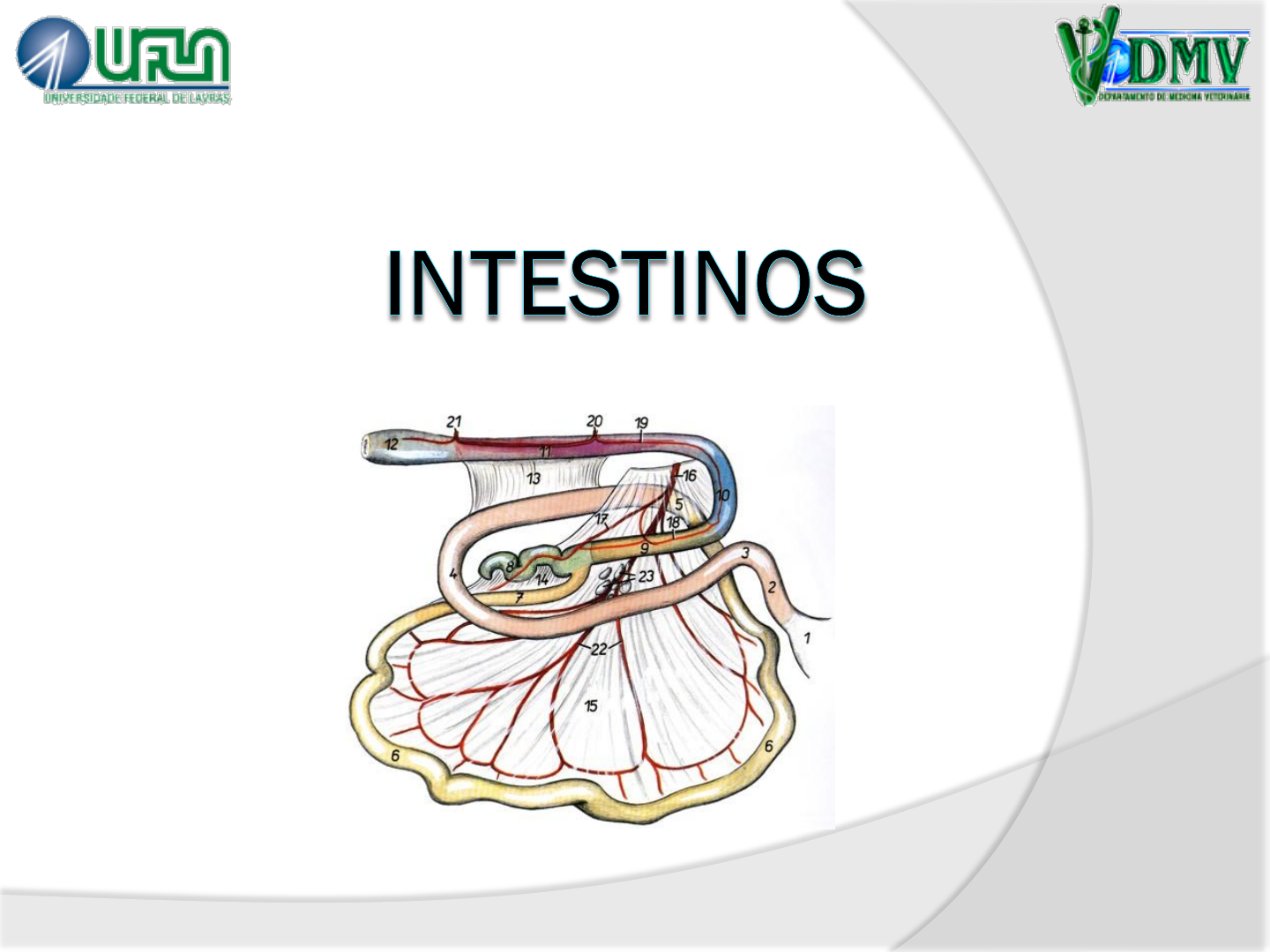 Prof Juliano Vogas Peixoto Lavras UNIVERSIDADE FEDERAL DE LAVRAS Tubo musculomembranáceo que se estende do piloro ao ânus Considerações Gerais Atuam na digestão e absorção de nutrientes (carboidratos, gorduras e proteínas) além de H2O e eletrólitos No intestino delgado ocorre ação enzimática: participam secreções pancreáticas, fígado e gls intestinais Funções Intestino delgado ○ Digestão química e enzimática ○ Absorção de nutrientes Intestino grosso ○ Absorção de H2O e excreção ○ Produção de muco ○ Equi e Sui: digestão bacteriana e absorção AGVs Parte dos nutrientes são obtidos por fermentação Ruminantes: estômago Equinos e suínos: intestino grosso - ceco e cólon (fermentação da celulose) Considerações Gerais Constituição da Parede Túnica serosa Túnica muscular Túnica submucosa Túnica mucosa Divisão Intestinos Delgado Grosso Duodeno Jejuno Íleo Ceco Cólon Reto Intestino delgado Duodeno: porção proximal Segmentos: cranial, descendente e ascendente Papilas duodenais Papila duodenal maior Ducto colédoco e ducto pancreático Papila duodenal menor Ducto pancreático acessório Três flexuras 1. Cranial 2. Caudal 3. Duodenojejunal Papila duodenal maior Papila duodenal menor Estômago equino Intestino delgado Jejuno: porção média Grande número de alças jejunais longas, presas ao mesentério Carnívoros Suínos Ruminantes Equinos Intestino delgado Íleo: porção distal Desemboca no intestino grosso Óstio ileal, na papila ileal Limite jejuno-íleo: inserção da prega íleo-cecal Carnívoros •Óstio ileal: cólon ascendente (óstio ileocólico) Íleo: se projeta para o interior do ceco (papila ileal: óstio ileocecal) → abertura provida de esfíncter (refluxo do bolo alimentar) Suínos Íleo: se abre na transição cecocólica - óstio ileocecocólico Ruminantes Óstio ileocecal Óstio cecocólico Equinos • Ceco: curto e torcido (saca rolha) localizado à direita do plano mediano (ventral ao duodeno) Abre-se no cólon ascendente: óstio ileal (ileocólico) Intestino Grosso Carnívoros • Cólon: ascendente (esquerdo) transverso descendente (direito) • Reto: continuação do cólon descendente - é o mais dorsal das vísceras pélvicas Ceco Base, Corpo e Ápice: curvo como uma vírgula (bem desenvolvido) Localização: à direita do plano mediano → entrada da pelve ao assoalho do abdome próximo ao processo xifóide Tênias (4): dorsal, ventral, direita e esquerda Haustros Equinos Tenia lateral Tênia dorsal Tênia medial Tênia ventral Óstio cecocólico Papila ileal: óstio ileal CVD Tênia lateral Vista Dorsal Vista Ventral Cólon Ascendente Capacidade: mais que o dobro do Ceco Tênias e Haustros: presentes Cólon transverso (curto e estreito) Cólon descendente → sustentado por um mesocólon longo (80 a 90 cm): cólon flutuante → possui 2 tênias e 2 séries de haustros Ceco Suínos Forma: cilíndrica Localização: contra a parede dorsal e cranial do flanco esquerdo estende-se ventral, caudal e medialmente ao cólon Tênias: medial, lateral e ventral Haustros: 3 fileiras Cólon Início: calibre semelhante ao do ceco (torna-se gradativamente menor) Localização: à esquerda do plano mediano e assoalho do abdome Divisão: Ascendente: formato cone em espiral (disposição: dorsoventral) - possui duas tênias e duas fileiras de haustros Transverso Descendente Diâmetro: não superior ao ID em grande parte Haustros e Tênias: ausentes Localização: - antímero direito Ruminantes Ceco - Transição com o cólon ascendente: finalização do íleo (óstio ileal/ileocecocólico) Ruminantes Cólon Ascendente: Forma em espiral: alça proximal - alça espiral (giros centrípetos - flexura central - giros centrífugos) - alça distal Pequenos Ruminantes Giros centrífugos (alça espiral): “colar de pérolas” - fezes Transverso Descendente Sigmóide