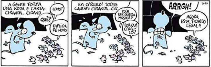 Níquel está diante de alguns filhotes de ratos explicando uma brincadeira. Antes de finalizar, é interrompido. “Como?”, “Que?”, “Explica de novo.” - dizem os filhotes. Irritado, recomeça: “- Em círculo! Todos cantam: Ciranda...Cir.” Outra vez, os filhotes detêm sua explicação. “Pode ser outra música?”, “Por quê círculos?”. - Questionam. “- ARRGH!” - com uma careta, Níquel expressa sua raiva e impaciência. Acreditando ser parte do jogo, os filhotes se empolgam. “Agora está ficando legal!”. Primeiramente, é perceptível a impaciência de ambos. Em compreensão disto, seria viável que os filhotes ouçam a explicação e seguidamente, entrem num consenso que favoreça todos.