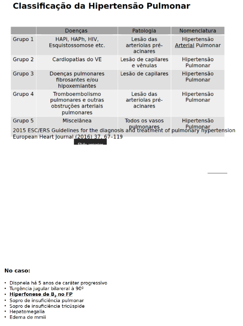 HIPERTENSÃO PULMONAR Classificação Apenas o grupo 1 que chamamos de HIPERTENSÃO ARTERIAL PULMONAR, pois acomete de forma primária. Todos os outros grupos chamamos de HIPERTENSÃO PULMONAR, até mesmo o grupo 4 que tem acometimento de arteríolas pré-acinares, pois não tem lesão na parede. Apresentações clinicas diferentes 1)Paciente com diagnostico estabelecido da doença de base, passa a apresentar manifestações de HP (DISPNEIA e INSUFICIENCIA DE VD) 2)Paciente tem uma esclerose primária, mas não tem nenhum sintoma. Mas sabemos que a esclerose sistêmica pode levar ai aparecimento de sintomas de HP, e assim fazemos o rastreamento para HAP (investigar uma determinada doença antes que apareça os sintomas) 3)Pacientes que tem as manifestações da HP (dispneia e insuficiência de VD), mas não tem nenhum sintoma de outra doença associada. Esse terceiro exemplo foi o caso de RCI. se tem hiperfonese de B2 no foco pulmonar, pode pesquisar HAP. Exames para solicitar na suspeita de HAP Primeiro temos que confirmar que o paciente tem HAP. Depois realizamos o RX de tórax e eletro (são poucos específicos apesar de serem facilmente encontrados). O Ecocardiograma transtorácico traz maiores informações e ele quem diz se o paciente vai precisar ir para o CATE. No ecocardio conseguimos PSAP, mas ela está caindo em desuso. Assim, atualmente estamos usando mais o VRT. é muito especifico, não cai em nenhuma prova. A paciente do caso tinha insuficiência pulmonar. *O que precisamos saber se a probabilidade de ter HAP é leve, intermediaria ou alta. Temos que olhar se o paciente tem os achados lá de cima. Se o paciente tiver apenas um já desconfiar de HAP. Se não tem nenhum não é HAP. Então o que explicaria a dispneia? Não sabemos. Tem que investigar. Se paciente com intermediaria ou alta, temos que obrigatoriamente, os pacientes tem que ser submetidos a cateterismo de câmaras direitas. Aqui, o que interessa agora é a PmAP (pressão média) <20mmmHg, ele não tem HP. Se a pressão media for >20 mmHg ele tem HP. Depois de confirmada temos que ver a PCP (pressão capilar pulmonar). MENOR DO QUE 15: doença está nas arteríolas pré acinares. No caso seria necessário fazer um teste genético. Se o teste é negativo temos que procurar outra coisa, mas não é hereditário. Se for por uso de drogas basta fazer uma anamnese. HIV levando a HAP é meio por cento (0,5%) dos casos. Hipertensão portal qual a tríade que nos remete ao diagnostico: CIRCULAÇÃO COLATERAL, ASCITE, ESPLENOMEGALIA. Esquistossomese leva a baços e fígados muito grandes. Fisiopatogenia da Hipertensão Pulmonar O endotélio vascular libera substancias vasodilatadoras e vasoconstritoras. Também faz a liberação de cels musculares lisas e inibição dessas. Ou seja, ele faz um EQUILIBRIO. Na HAP, esse equilíbrio se perde e a balança tende a tromboxamos, A2, e endotelina, a substâncias vasoconstritoras. é uma artéria. Temos uma camada intima espessada Essa é da paciente. Camada media fibrosada, intima aumentada. E isso tudo devido aumento das células endotelinas. Quando inibimos a fosfodiesterase estamos fazendo vasodilatação. Sildenafila é o viagra.