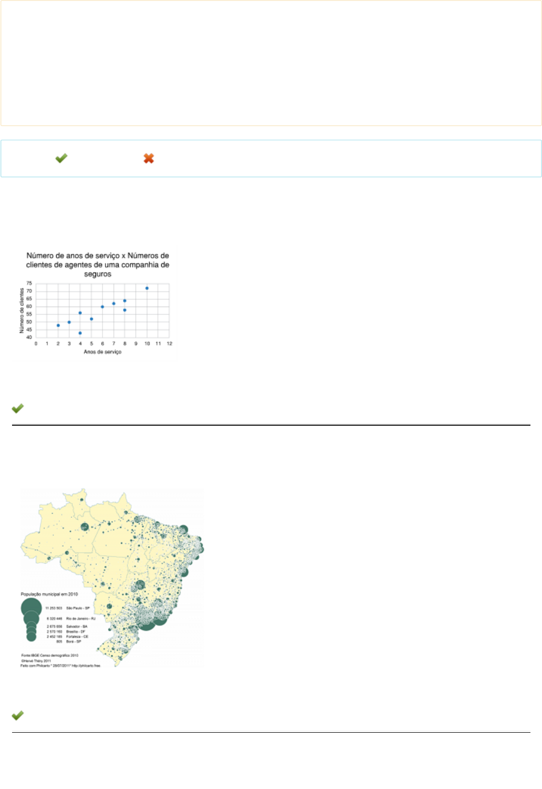 Acadêmico: Rafaela Kriger Lins (841364) Disciplina: Estudo Transversal (17578) Avaliação: Avaliação disciplina on-line ( Cod.:512293) ( peso.:10,00) Prova: 16142217 Nota da Prova: 9,00 Legenda: Resposta Certa Sua Resposta Errada 1. Os gráficos estão presentes em todas as formas de comunicação. São utilizados para demonstrar de forma mais fácil uma situação envolvendo números. Analise o gráfico a seguir e identifique sua classificação: FONTE DA IMAGEM: https://pt.wikipedia.org/wiki/Gr%C3%A1fico_de_dispers%C3%A3o. Acesso em: 20 mar. 2019. a) Gráfico de Linhas. b) Gráfico em Rede. c) Gráfico de Área. d) Gráfico de Dispersão. 2. Os mapas conjugam-se com a prática histórica, podendo revelar diferentes visões do mundo. Apresentam diversas informações sobre diversos temas. Analise o mapa a seguir e identifique qual a sua classificação: FONTE DA IMAGEM: https://journals.openedition.org/confins/7215?lang=pt. Acesso em: 20 mar. 2019. a) Mapa Histórico. b) Mapa Físico. c) Mapa Econômico. d) Mapa Demográfico. 3. Esse tipo de gráfico é muito comum em nosso cotidiano. É indicado para expressar relações de proporcionalidade, sendo que a soma de todos os dados compõe um dado aspecto da realidade. De que gráfico estamos falando? a) Gráfico de Barra. b) Gráfico de Pizza. c) Gráfico de Linhas. d) Gráfico de Coluna. 4. Os mapas registram áreas, demarcações, territórios etc. É uma forma de se ver em escala reduzida informações de uma determinada região ou país. Analise o mapa a seguir e identifique sua classificação: FONTE DA IMAGEM: https://bit.ly/2TEXeEi. Acesso em: 20 mar. 2019. a) Mapa demográfico. b) Mapa histórico. c) Mapa econômico. d) Mapa político. 5. Gráfico é uma forma de se expressar visualmente dados ou valores numéricos, de maneiras diferentes, facilitando a compreensão dos mesmos. Analise o gráfico a seguir e identifique sua classificação: FONTE DA IMAGEM: http://ninjadoexcel.com.br/como-criar-graficos-no-excel/. Acesso em: 20 mar. 2019. a) Gráfico de Área. b) Gráfico de Dispersão. c) Gráfico de Linhas. d) Gráfico de Coluna. 6. Mapas que apresentam uma representação espacial das populações, como os índices populacionais, taxas de analfabetismo e migrações, são denominados por um nome específico. Qual é esse nome? a) Mapas históricos. b) Mapas demográficos. c) Mapas físicos. d) Mapas econômicos. 7. Este tipo de gráfico mostra os dados como uma coleção de pontos. Cada ponto determina o valor de uma varável, bem como sua posição no eixo horizontal junto com outra variável e sua posição no eixo vertical. De que gráfico estamos falando? a) Gráfico de Dispersão. b) Gráfico de Área. c) Gráfico de Barra. d) Gráfico de Linhas. 8. Esse tipo de gráfico utiliza coordenadas cartesianas para exibir valores de um conjunto de dados. Os dados são exibidos como uma coleção de pontos. De que gráfico estamos falando? a) Gráfico em Rede. b) Gráfico de Linhas. c) Gráfico de Dispersão. d) Gráfico de Área. 9. Esse tipo de mapa é utilizado para representar acontecimentos em um determinado período histórico. De que tipo de mapa estamos falando? a) Mapa econômico. b) Mapa político. c) Mapa demográfico. d) Mapa histórico. 10. Mapa é uma representação visual de uma região. Geralmente são representações bidimensionais de um espaço tridimensional. A ciência da concepção e fabricação de mapas designa-se cartografia. Em relação aos tipos de mapa, analise o mapa a seguir. Que tipo de mapa é? FONTE DA IMAGEM: http://m.getulionascimento.com/news/a-formacao-do-territorio-brasileiro/. Acesso em: 20 mar. 2019. a) Mapa econômico. b) Mapa físico. c) Mapa histórico. d) Mapa demográfico. Prova finalizada com 9 acertos e 1 questões erradas.