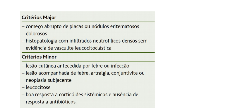 SÍNDROME SWEET Síndrome de Sweet é uma dermatose neutrofílica caracterizada por início súbito de febre, leucocitose e lesões cutâneas eritemato-violáceas. Há um predomínio desta patologia no sexo feminino. A sua origem permanece incógnita mas pensa-se que resulta de uma reação de hipersensibilidade a um antigénio de origem tumoral, bacteriano ou viral. Em 50% dos casos, associa-se a outras patologias como doenças infeciosas, inflamatórias, autoimunes e principalmente neoplásicas (Silva, Antunes, & Silva, 2014). CRITÉRIOS DE DIAGNÓSTICOFigura 1 - Retirado de Um caso típico de Síndrome de Sweet (Ramos, Santiago, & Tomé,2018) Para o diagnóstico de Síndrome de Sweet são necessários dois critérios major e dois minor. MANIFESTAÇÕES/SINAIS DE ALERTA As manifestações clínicas principais do síndrome que são: erupção cutânea, infiltrado neutrofílico dérmico sem atingimento vascular (verificado na biópsia), febre e neutrofilia periférica (Ramos, Santiago, & Tomé, 2018). CARACTERISTÍCAS DAS LESÕES CUTÂNEAS As lesões cutâneas são normalmente sinais da doença e consistem em pápulas ou placas eritematosas de coloração vermelho ou violeta com uma superfície irregular pseudovesicular e uma descoloração central, amarelada. As placas podem causar dor e/ou sensação de queimadura, mas não são pruriginosas. São mais frequentemente encontradas na face, pescoço e extremidades superiores, especialmente no dorso das mãos (Silva et al., 2014). TRATAMENTO Sem tratamento a síndrome pode persistir para semanas ou meses, porém mesmo com tratamento ocorre recidivas, os principais fármacos utilizados no tratamento da síndrome são os corticosteroides sistêmicos (prednisona) e tópicos, os anti-inflamatórios não esteroidais (indometacina), iodeto de potássio, ciclosporinas, doxiciclina, dapsona, colchicina, clofazamina e pentoxifilina (Ramos et al., 2018). CUIDADOS DE ENFERMAGEM · Explicar ao utente em que consiste a patologia; · Explicar sintomatologia da patologia; · Explicar os cuidados a ter com a patologia; · Explicar o regime terapêutico; · Administrar terapêutica; · Dar suporte emocional ao utente e família; · Alertar o médico. BIBLIOGRAFIA 1. Ramos, M. L., Santiago, L. M., & Tomé, T. (2018). Um caso típico de Síndrome de Sweet. Revista Portuguesa de Clínica Geral, 29(3), 186–190. https://doi.org/10.32385/rpmgf.v29i3.11072 2. Silva, E. P., Antunes, F. T. T., & Silva, M. G. da. (2014). Síndromede Sweet (Dermatoseneutrofílica Febril Aguda): Uma Síndrome Rara a Ser Considerada Emsaúde Pública. Revista cientifica do ITPAC, 7(2), 1–12.