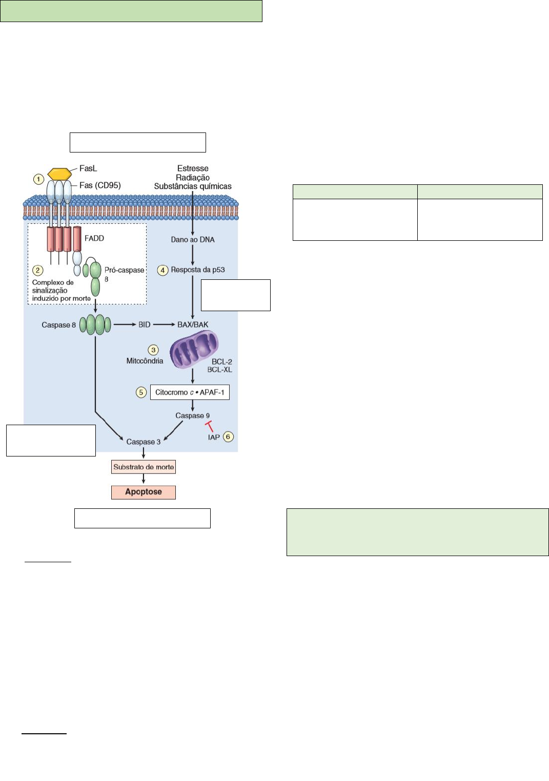Mecanismo de evasão a apoptose - No câncer, ocorrem mutações nos genes que regulam a apoptose, pois, neste cenário, a apoptose é uma barreira que deve ser sobreposta. - Vias da apoptose: extrínseca (por meio do receptor FAS) e intrínseca (por meio do dano ao DNA). 1- Extrínseca: Fas se liga ao FasL, levando à trimerização do receptor e de seus domínios de morte citoplasmáticos, que atraem a proteína adaptadora intracelular FADD. Essa proteína recruta a pró-caspase 8 para formar o complexo de sinalização indutor de morte. A pró-caspase 8 é ativada pela clivagem em subunidades menores, gerando a caspase 8. A caspase 8 então ativa as caspases efetoras, como a caspase 3, que cliva o DNA para causar a morte celular. Além disso, a caspase 8 cliva/ativa a BID, ativando também a via intrínseca. 2- Intrínseca: retirada de fatores de sobrevivência, estresse e injúria levam a permeabilização da membrana mitocondrial externa, resultando em liberação do citocromo c, que se liga ao APAF1, ativando a caspase 9, que cliva/ativa as caspases efetoras. A integridade da membrana mitocondrial externa é regulada por membros pró e anti- apoptóticos da família BCL2 de proteínas. As proteínas pró-apoptóticas BAX e BAK promovem diretamente a permeabilização da membrana. Sua ação é inibida pelas proteínas anti-apoptóticas BCL2 e BCL-XL. - As caspases podem ser inibidas por Inibidores de Proteínas da Apoptose (IAP). Alguns tumores evitam a apoptose por meio do aumento da regulação dessas proteínas. Anti-apoptóticos Pró-apoptóticos BCL-2 BCL-XL IAP BH123 (BAX, BAK) BH3 Anti-IAP - As células tumorais conseguem evadir o mecanismo da apoptose através da mutação, amplificação e alteração na expressão desses genes. - As mutações que levam a evasão da apoptose são: → Redução da expressão de Fas. → Aumento de FLIP (proteína que se liga ao complexo de sinalização indutor de morte e evitar a ativação da caspase 8). → Superexpressão da proteína BCL2/BCL-XL. → Deleção de p53 (p53 é um importante gene pró- apoptótico que induz a apoptose em células que não são capazes de reparar o dano ao DNA). A p53 promove transcrição de BAX (proteína pró- apoptotica). → Perda de função de BAX e BAK. 1- Qual processo está relacionado a proteína FAS? Qual a implicação da redução da sua expressão para o tumor? - A proteína Fas liga no ligante de Fas (FasL) que é expresso pelas células T CD8 e isso faz com que seja ativada a via extrínseca da apoptose. Se a célula tumoral reduz a expressão dessa proteína, ela sobrevive e escapa dos mecanismos de apoptose. Portanto, este é um dos mecanismos de evasão da apoptose. - Quando pensamos em uma célula tumoral, pensamos em uma célula que prolifera muito e não morre por conseguir escapar dos mecanismos de morte. Então, um desses mecanismos é a redução da expressão de Fas e, com isso, o bloqueio da apoptose pela via extrínseca. Iniciadoras: Caspases 2, 8, 9, 10. Executoras: Caspases 3, 6, 7. Via extrínseca: Pró-caspases 8, 10. Via intrínseca: Caspases 2, 9. 2- Qual a função da proteína BCL2? Qual relação entre a amplificação e o desenvolvimento tumoral? - A família do BCL2 tem proteínas que são pró e que são anti-apoptóticas. - As pró-apoptóticas são BAX e BAK e as anti- apoptóticas são as proteínas BCL2 e BCL-XL. - Como a proteína BCL2 é anti-apoptótica e está amplificada, o desenvolvimento tumoral está aumentado, e isso, consequentemente, inibe BAX e BAK, favorecendo o lado anti-apoptótico. - Esse é outro mecanismo de evasão do mecanismo de apoptose importante para as células tumorais. 3- Como as células tumorais são reconhecidas pelo sistema imune? - Célula tumoral: é uma célula própria que sofreu alterações genéticas e, perdeu o controle do ciclo, evadiu o sistema imune e tem todas as características Hallmarks. - Em tese, não se reconheceria essas células, por serem células do próprio organismo. No entanto, esse reconhecimento ocorre em consequência a formação de antígenos tumorais, gerando um infiltrado inflamatório nos tumores e, consequentemente, a resposta imune. Esses antígenos tumorais podem ser: - Produtos de genes mutados: a mutação gera proteínas alteradas que representam antígenos que nunca foram vistos pelo sistema imunológico e, assim, podem ser reconhecidos como sendo não próprios. P. ex. BCR-ABL (presente em alguns tipos de leucemias, gerada quando temos fusão de 2 genes que codificam essa proteína). Reconhecidos pelos LTCD8 e LTCD4 (fagocitose - MHCII). - Antígenos de vírus oncogênicos: quando temos um vírus levando ao desenvolvimento da célula tumoral (p. ex. HPV), nosso organismo consegue identificar, nas células tumorais, proteínas virais que facilitam o reconhecimento e a morte dessa célula (antígenos E6 e E7 no HPV). - Proteína anormalmente expressa: antígenos que são produzidos em níveis baixos nas células normais e estão superexpressados nas células tumorais. P. ex. a tirosinase, enzima envolvida na biossíntese de melanina, que é expressa somente nos melanócitos normais e em grande quantidade nos melanomas. Pode ser surpreendente que esses pacientes sejam capazes de responder a um antígeno próprio normal. A explicação provável é que a tirosinase normalmente é produzida em quantidades tão pequenas e em tão poucas células que não é reconhecida pelo sistema imunológico e não é capaz de induzir tolerância. - Antígenos oncofetais: são proteínas expressas em altos níveis nas células cancerosas e nos tecidos normais em desenvolvimento (fetais), mas não nos tecidos adultos. Alguns tumores, por alterações genéticas e epigenéticas, voltam a expressar esses genes e, não temos tolerância contra essas proteínas oncofetais, então nosso sistema imune reage contra elas, que são potentes antígenos tumorais também. P. ex. antígeno carcinoembrionico (CEA) e a α- f