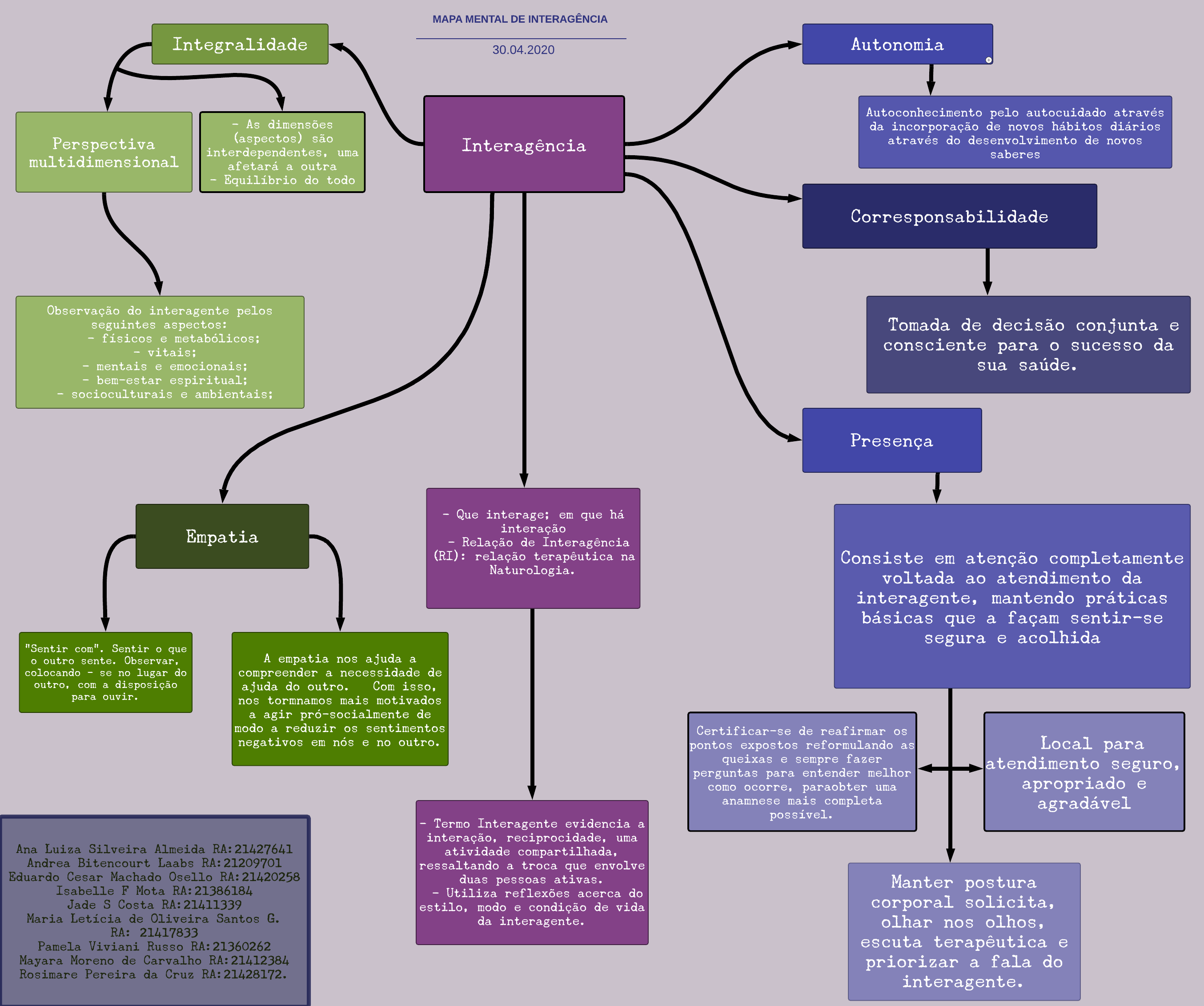MAPA MENTAL DE INTERAGÊNCIA 30.04.2020 I nt er agênci a I nt egr al i dade - Que i nt er age; em que há i nt er ação · - Rel ação de I nt er agênci a ( RI ) : r el ação t er apêut i ca na Nat ur ol ogi a. · Empat i a Pr esença Aut onomi a Cor r esponsabi l i dade - Ter mo I nt er agent e evi denci a a i nt er ação, r eci pr oci dade, uma at i vi dade compar t i l hada, r essal t ando a t r oca que envol ve duas pessoas at i vas. · - Ut i l i za r ef l exões acer ca do est i l o, modo e condi ção de vi da da i nt er agent e. Aut oconheci ment o pel o aut ocui dado at r avés da i ncor por ação de novos hábi t os di ár i os at r avés do desenvol vi ment o de novos saber es Tomada de deci são conj unt a e consci ent e par a o sucesso da sua saúde. Per spect i va mul t i di mensi onal Obser vação do i nt er agent e pel os segui nt es aspect os: - -- f í si cos e met aból i cos; - - vi t ai s; - - ment ai s e emoci onai s; - - bem- est ar espi r i t ual ; - - soci ocul t ur ai s e ambi ent ai s; Consi st e em at enção compl et ament e vol t ada ao at endi ment o da i nt er agent e, mant endo pr át i cas bási cas que a f açam sent i r - se segur a e acol hi da - Local par a at endi ment o segur o, apr opr i ado e agr adável Mant er post ur a cor por al sol i ci t a, ol har nos ol hos, escut a t er apêut i ca e pr i or i zar a f al a do i nt er agent e. Cer t i f i car - se de r eaf i r mar os pont os expost os r ef or mul ando as quei xas e sempr e f azer per gunt as par a ent ender mel hor como ocor r e, par aobt er uma anamnese mai s compl et a possí vel . - As di mensões ( aspect os) são i nt er dependent es, uma af et ar á a out r a - Equi l í br i o do t odo Ana Lui za Si l vei r a Al mei da RA: 21427641 Andr ea Bi t encour t Laabs RA: 21209701 Eduar do Cesar Machado Osel l o RA: 21420258 I sabel l e F Mot a RA: 21386184 Jade S Cost a RA: 21411339 Mar i a Let í ci a de Ol i vei r a Sant os G. RA: 21417833 Pamel a Vi vi ani Russo RA: 21360262 Mayar a Mor eno de Car val ho RA: 21412384 Rosi mar e Per ei r a da Cr uz RA: 21428172. A empat i a nos aj uda a compr eender a necessi dade de aj uda do out r o. Com i sso, nos t or mnamos mai s mot i vados a agi r pr ó- soci al ment e de modo a r eduzi r os sent i ment os negat i vos em nós e no out r o. " Sent i r com" . Sent i r o que o out r o sent e. Obser var , col ocando - se no l ugar do out r o, com a di sposi ção par a ouvi r . MAPA MENTAL INTERANGENCIA Mapa mental em branco