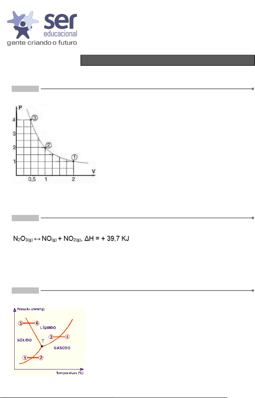Página 1 de 2 GRADUAÇÃO EAD AV2 2019.1A 30/03/2019 QUESTÃO 1. Considere o grá́fico a seguir: O grá́fico acima representa um comportamento típico de um gás submetido à que lei: R: Lei de Boyle. QUESTÃO 2. No equilíbrio indique o sentido do deslocamento quando ocorrer. I. Adic ̧ão de N2O3(g). II. Aumento da temperatura do sistema. III. Aumento da pressão no sistema. R: I direita, II direita, III esquerda. QUESTÃO 3. Considere o diagrama que representa o equilíbrio entre fases da água pura. A linha que representa o fenômeno da formação de chuva é: R: (4) – (3). FISICO-QUÍMICA Página 2 de 2 QUESTÃO 4. Numa transformação isobárica, um gás realiza o trabalho de 250 J, quando recebe do meio externo 500 J. Qual a variação de energia interna do gás nessa transformação ? R: 250 J QUESTÃO 5. Um balão de borracha, desses usados em aniversários, cheio de ar, murcha após algum tempo. O fenômeno pode-se explicar pela: R: Efusão do gás contido no balão para o meio externo. QUESTÃO 6. Uma reação química atinge o equilíbrio químico quando: R: as velocidades das reações direta e inversa são iguais. QUESTÃO 7. Quando um sistema está em equilíbrio e seu volume é diminuído, gerando aumento na pressão total, o Princípio de Le Châtelier indicará que o sistema responderá deslocando sua posição de equilíbrio para: R: Diminuir a pressão. QUESTÃO 8. O HCl quando diluído em água, aumenta a concentração do ions H+ do meio aquoso. A que se deve essa propriedade? R: O HCl é uma ácido, e de acordo com o conceito de Arrhenius, libera os íons H+ em meio aquoso. QUESTÃO 9. Temos uma solução de partes iguais de água, éter etílico e etanol (álcool comum) em um recipiente fechado. As pressões parciais dos vapores dos líquidos estão na seguinte ordem crescente: R: água, etanol, éter. QUESTÃO 10. A presença de um soluto não-volátil dissolvido em um solvente volátil líquido altera o comportamento deste solvente volátil na sua pressão de vapor que (x), no seu ponto de ebulição que (y) e no seu ponto de solidificação que (z). Respectivamente, podemos substituir x , y e z por: R: Diminui, aumenta e diminui.