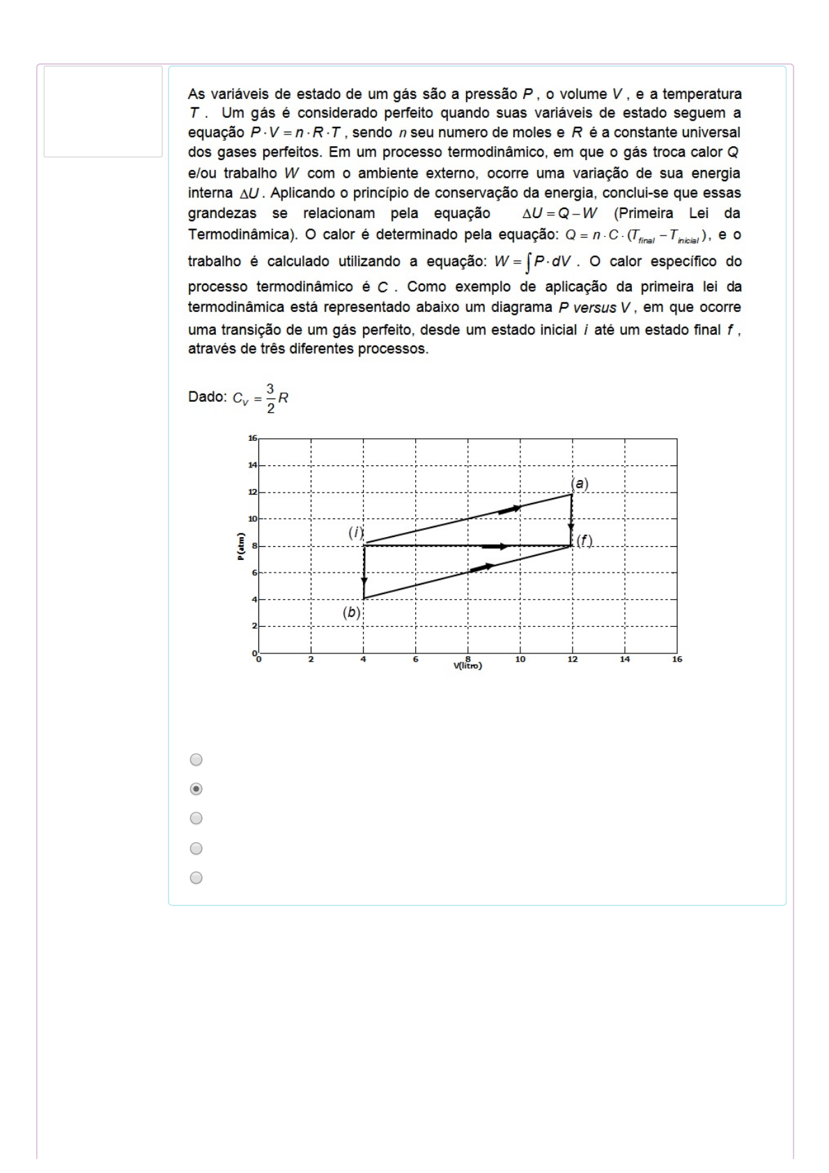 / Página inicial ► Minhas disciplinas ► S6-B0411 ► Unidade 1 ► Questionário Online Questão 1 Resposta salva Vale 2,00 ponto(s). A variação de energia interna que o gás sofre no processo (ibf) vale: Escolha uma: a. -48 atm•ℓ b. 96 atm•ℓ c. 180 atm•ℓ d. 0 e. 120 atm•ℓ http://www.unipvirtual.com.br/avaunip/ http://www.unipvirtual.com.br/avaunip/course/view.php?id=2280 http://www.unipvirtual.com.br/avaunip/course/view.php?id=2280#section-1 http://www.unipvirtual.com.br/avaunip/mod/quiz/view.php?id=49405 / Questão 2 Resposta salva Vale 2,00 ponto(s). E a massa restante de gelo? Escolha uma: a. 11,29 g b. 3,71 g c. 21,05 g d. 0 e. 1,00 g / Questão 3 Resposta salva Vale 2,00 ponto(s). O trabalho trocado pelo gás no ciclo vale: Escolha uma: a. 0 b. +1800 J c. -837 J d. -2637 J e. +400 J / Questão 4 Resposta salva Vale 2,00 ponto(s). O calor trocado na transformação (2 → 3) vale: Escolha uma: a. 1800 J b. +3000 J c. -300 J d. -900 e. 0 / Questão 5 Resposta salva Vale 2,00 ponto(s). Adicionando-se à mistura anterior outro pedaço de gelo, de massa 15 g, à temperatura -26ºC, qual será a temperatura de equilíbrio térmico dessa nova mistura? Escolha uma: a. -1,25ºC b. -40,24ºC c. 10,52ºC d. 0ºC e. 4,25ºC