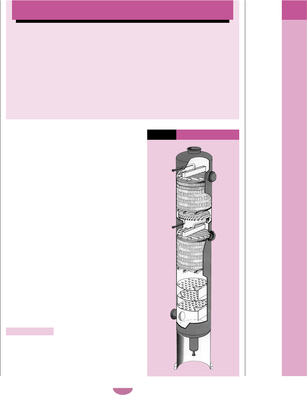 S ENA I – P E T R O B RA S .................... M o n i t o r a m e n t o e c o n t r o l e d e p r o c e s s o s TorresTorres s torres, também denominadas “colu- nas”, servem para realizar destilação, ab- sorção e retificação, extração, reações etc. Construção São compostas de um casco cilíndrico ver- tical, fechado nas extremidades superior e inferior por dois tampos, normalmente elipsoidais ou torrisféricos, formando um vaso de pressão vertical, e por seus diver- sos acessórios, denominados “internos”. Ver foto ao lado. A altura e o diâmetro da torre são de- terminados em função do volume dos va- pores e líquidos. Para um melhor entendi- mento do seu funcionamento e da função dos internos, as torres podem ser divididas em três seções distintas: Por onde saem os produtos leves (gases e vapores). Comporta o bocal de saída de vapor, bocal de entrada de refluxo e seu distribuidor, demisters, entre outros. Unidade 1 FIGURA 25 TORRESAA SEÇÃO DE TOPO 1 S ENA I – P E T R O B RA S .................... Por onde entra a carga e, conforme o caso, por onde são retirados os pro- dutos intermediários e refluxos. Comporta os bocais de entrada de carga e seu distribuidor, bocais de retiradas intermediárias, panelas de retirada total ou parcial, entre outros. Por onde saem os produtos pesados. Comporta o volume de controle, bo- cais de saída para os refervedores e o retorno, bocais de saída de fundo, de entrada de vapor, entre outros. Classificação quanto ao tipo e à descrição Além de sua finalidade, os tipos de torres são definidos pelos diferentes “internos”. Os mais importantes referem-se aos elementos responsáveis pela destilação, absorção etc. Estes promovem da maneira mais eficiente possível o contato entre o líquido que desce e o vapor que sobe, por toda a extensão da coluna. Logo, temos três classes principais: Torres de pratos ou bandejas Torres recheadas Torres mistas ou combinadas Torres SEÇÃO INTERMEDIÁRIA SEÇÃO DE FUNDO S ENA I – P E T R O B RA S .................... 1 M o n i t o r a m e n t o e c o n t r o l e d e p r o c e s s o s No interior da torre são montadas as bandejas ou pratos em número varia- do e com um espaçamento determinado, de acordo com a função da torre. Os pratos possuem vertedores com as funções de formar um nível de lí- quido sobre o prato e direcionar o líquido que transborda para o prato abaixo. Na superfície do prato existem dispositivos de passagem para o vapor. Formam-se assim uma corrente descendente de líquido e outra corrente ascendente de vapor e gases que se cruzam perpendicularmente. O va- por borbulha no meio do líquido, na superfície do prato, promovendo o arraste pelo líquido de substâncias mais pesadas que se condensam. Pratos ou bandejas Com o gradiente de temperatura na torre, indo do fundo quente até o topo mais frio, o contato entre gás e líquido em seqüência nos diversos pratos faz com que as frações de hidrocarbonetos mais pesados se conden- sem nas bandejas do fundo, enquanto as frações mais leves se condensam nas bandejas do topo. Há diversos tipos de pratos ou bandejas, classificados quanto ao princípio de funcionamento dos dispositivos, que proporcionam o contato entre vapor e líquido: TORRES DE PRATOS PERFURADOS Consistem basicamente em uma chapa com furos. Atualmente não são mais usadas, estando presentes apenas em equipamentos muito antigos. TORRES DE PRATOS OU BANDEJAS 1 S ENA I – P E T R O B RA S .................... TORRES DE PRATOS COM BORBULHADORES Consistem basicamente em uma chapa com furos, sobre os quais são montados os borbulhadores circulares ou retangulares (caps), como peque- nas chaminés cobertas. Atualmente não são mais indicadas, estando pre- sentes apenas em equipamentos antigos e reaproveitados. TORRES DE PRATOS VALVULADOS Contêm furos nos quais são montadas as válvulas (chapas com batentes que guiam e limitam sua abertura e outros), cuja abertura varia com o fluxo de vapor, de maneira a não permitir vazamentos de líquidos. Seu uso é difundido devido a seu baixo custo e alto rendimento. TORRES DE BANDEJAS GRADEADAS São encontradas nas torres de extração líquido-líquido em contracorren- te. Extração líquido-líquido é a denominação empregada para qualquer operação em que um composto, dissolvido em uma fase líquida, é trans- ferido para outra fase líquida. As bandejas gradeadas, constituídas por células de formato hexagonal, são arranjadas de modo a proporcionar o máximo contato entre a carga e o solvente. São torres que contêm, ao invés de bandejas, seções preenchidas com ele- mentos diversos, por isso denominados recheios, cuja finalidade é prover uma enorme superfície de contato líquido-vapor. Com o desenvolvimento da tecnologia dos recheios, nos últimos anos as refinarias vêm substituindo seções com bandejas por leitos recheados, com a finalidade de reduzir a queda de pressão e aumentar o rendimento do processo. RecheiosRecheiosRecheiosRecheiosRecheios (packing) Um bom recheio deve possuir as seguintes características: Apresentar grande superfície de interface entre líquido e vapor Ser quimicamente inerte para os fluidos processados Possuir boa resistência mecânica, a fim de evitar quebras Ser de baixo custo TORRES RECHEADAS S ENA I – P E T R O B RA S .................... 1 M o n i t o r a m e n t o e c o n t r o l e d e p r o c e s s o s FIGURA 26 RECHEIOS ESTRUTURADOS Os recheios são divididos em dois grupos: estruturados e randômicos (aleatórios). Recheios estruturados São montados no interior da coluna em blocos, formados por estruturas de chapas, às vezes corrugadas e perfura- das, dobradas e montadas, encaixadas em diferentes ge- ometrias complexas. Podem ser encontrados em diversos materiais metálicos e não- metálicos. Veja a Figura 26. Recheios randômicos São peças de diversas geome- trias, das mais simples até as mais complexas, como as em forma