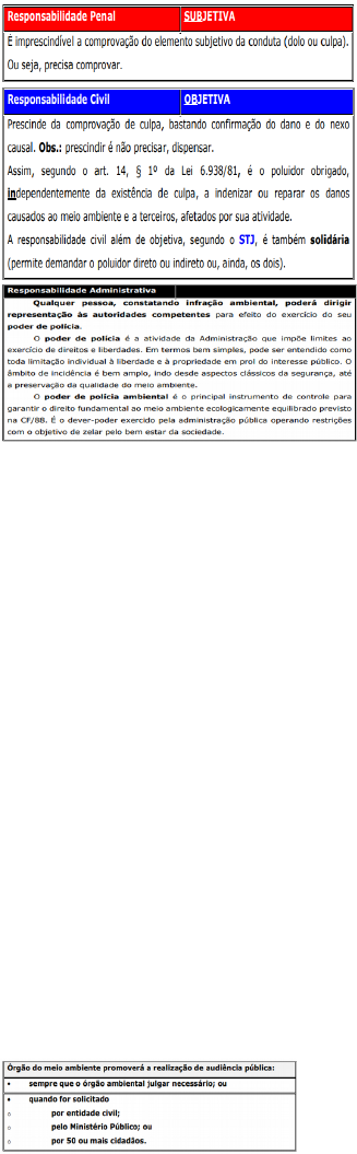 EXPLIQUE EM QUE TERMOS SE DÁ A RESPONSABILIDADE CIVIL, ADMINISTRATIVA E PENAL. R: As condutas e atividades consideradas lesivas ao meio ambiente sujeitarão os infratores, pessoas físicas ou jurídicas, a sanções penais e administrativas.A responsabilidade civil do infrator independe da existência de culpa, ficando obrigado a indenizar ou reparar os danos causados ao meio ambiente e a terceiros. A responsabilidade civil é objetiva (em relação aos infratores), no entanto, subjetiva em relação ao Poder Publico quando este se omite no dever de fiscalizar o meio ambiente. O QUE SIGNIFICA DUPLA IMUTAÇÃO? QUAL A TEORIA ADOTADA PELO STF E STJ? R: A teoria da dupla imputação diz que para que exista responsabilidade penal da pessoa jurídica, é necessário que também exista a imputação da pessoa física responsável pelo ato lesivo.Essa teoria já foi adotada pelo STJ, no entanto, atualmente, o STJ aderiu ao mesmo entendimento do STF que desconsidera a necessidade de dupla imputação em crimes ambientais praticados por pessoas jurídicas. QUAIS OS TIPOS DE SANÇÕES PENAIS APLICÁVEIS A PESSOA JURIDICA?R: De acordo com a LEI 9605/98 em seu artigo 21, as penas aplicáveis isolada, cumulativa ou alternativamente as pessoas jurídicas são: multa, restritivas de direito e prestação de serviços a comunidade. O QUE É LICENCIAMENTO AMBIENTAL? R: O licenciamento ambiental é o processo administrativo por meio do qual o poder publico procura controlar as atividades humanas potencialmente poluidoras. Tem caráter preventivo com o objetivo de evitar a degradação ambiental. QUAIS AS ETAPAS DO LICENCIAMENTO AMBIENTAL? R: O processo de licenciamento ambiental obedece as seguintes etapas:Definição pelo órgão ambiental competente dos documentos, projetos e estudos ambientais necessários ao início do processo; Requerimento da licença ambiental pelo empreendedor, acompanhado dos documentos, projetos e estudos ambientais pertinentes; Análise pelo órgão ambiental competente dos documentos, projetos e estudos ambientais apresentados; Solicitação de esclarecimentos e complementações pelo órgão ambiental competente;Audiência pública, quando couber; Solicitação de esclarecimentos e complementações pelo órgão ambiental competente, decorrentes de audiências públicas; Emissão de parecer técnico conclusivo e, quando couber, parecer jurídico;Deferimento ou indeferimento do pedido de licença, dando-se a devida publicidade.O procedimento poderá ser simplificado nos casos de atividades com pequeno potencial de impacto ambiental. É OBRIGATÓRIA A AUDIENCIA PUBLICA PARA PROMOVER O LICENCIMENTO AMBIENTAL?R: Regulado pelo CONAMA a audiência publica nem sempre é obrigatória no processo do licenciamento ambiental. O órgão do meio ambiente promoverá a sua realização quando julgar ser necessário. Ela poderá ser requerida pelo MP, por órgão ambiental, solicitada por entidade civil ou por 50 ou mais cidadãos. O QUE É EIA? R: O Estudo de Impacto Ambiental é o estudo multidisciplinar obrigatório para as atividades capazes de causar degradação ambiental. Deve ser realizado antes do inicio do procedimento de licenciamento ambiental. QUAIS OS TIPOS DE LICENÇA AMBIENTAL? EXPLIQUE. R: São três os tipos de licença ambiental: Licença Prévia (LP) – é a primeira etapa, necessária para dar inicio a uma atividade. É concedida na etapa de planejamento do empreendimento. O órgão licenciador avalia a localização e a concepção do negócio, atestando a sua viabilidade ambiental. Alguns estudos ambientais podem ser requeridos nesta etapa tal como o EIA/RIMA, se for julgado necessário. O prazo máximo é de até 5 anos. Licença de Instalação (LI) – é concedida após a aprovação do projeto inicial. A concessão da LI funciona como uma autorização do inicio da construção do empreendimento e de instalação dos equipamentos do ponto de vista ambiental.O prazo máximo é de até 6 anos. Licença de Operação (LO) – é necessária para o funcionamento do empreendimento. Dever ser requerida quando a empresa estiver edificada. A LO é concedida após a verificação do comprimento dos requisitos pelo órgão responsável. Nesta licença são determinados os métodos do controle e as condições de operação. O prazo pode ser de 4 a 10 anos. O QUE É COMPENSAÇÃO AMBIENTAL? R: A compensação ambiental é um mecanismo legal para que as empresas retornem e minimizem os impactos que podem ser causados ao ambiente a partir de atividades utilizadoras de recursos ambientais, considerados efetiva, potencialmente poluidores ou que podem causar degradação ambiental. É uma espécie de indenização pela degradação, na qual os custos sociais e ambientais identificados no processo de licenciamento são incorporados aos custos globais do empreendedor.