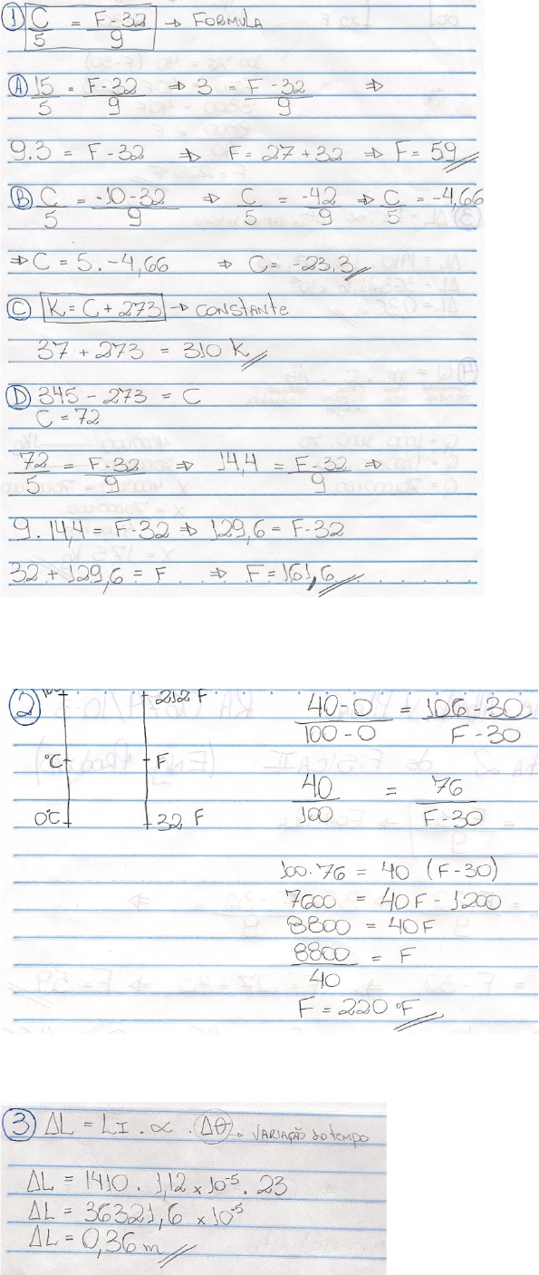 1. Transforme: a) 15oC para graus Fahrenheit c) 37oC para Kelvin (P2 Fisica 2) b) -10oF para graus Celsius d) 345 K para graus Fahrenheit 2. Um pesquisador dispõe de um termômetro C, de alta precisão, calibrado na escala Celsius, e um termômetro F, defeituoso, calibrado na escala Fahrenheit. Para o ponto do gelo, o termômetro F assinala 30oF, e, quando o termômetro C indica 40oC, o F indica 106oF. Determine a indicação do termômetro F correspondente ao ponto de vapor. Resp: 220OF. 3. A ponte Humber, na Inglaterra, cujo comprimento é de 1410 m, possui o maior vão sem apoio do mundo. Calcule a variação do comprimento da base de aço do vão, quando a temperatura aumenta de -5oC até 18OC. Resp: 0,39 m. 4. Um tanque cuja capacidade é de 1000 litros está cheio de água e é aquecido de 5 oC até 75 oC, empregando-se como combustível carvão de poder calorífico 8000 kcal/kg. Supondo que somente se aproveita 50% do calor liberado, determinar a quantidade de carvão necessária. Resp.: 17,5 kg. 5. Determinar a temperatura de equilíbrio térmico da mistura de 1 kg de gelo a 0 oC com 9 kg de água a 50 oC. Resp. 37 oC. 6. Calcule: a) Um estudante típico, assistindo a uma aula de física com atenção, produz calor a uma taxa de 100 W. Qual a quantidade de calor produzida por uma turma de 90 alunos, em um anfiteatro, durante 50 minutos de aula? Resp: 2,7.107 J b) Suponha que todo calor calculado no item (a) seja transferido para 3200 m3 de ar do anfiteatro. A densidade do ar é igual a 1,20 kg/m3 e o seu calor específico, 1020 J/kg oC (=0,24 cal/g oC). Sabendo que não ocorre nenhuma perda de calor e o condicionador de ar está desligado, qual é o aumento da temperatura do ar do anfiteatro, durante os 50 minutos de aula? Resp: 6,89 K 7. Enche-se um frasco de vidro de volume 200 cm3 com mercúrio a 20 oC. Que volume de mercúrio transborda quando a temperatura do conjunto aumenta para 100 oC ? O coeficiente de dilatação volumétrica do vidro é 1,2x10-5 oC‑1 e do mercúrio, 18x10-5 oC-1. Resp: 2,7 cm3 8. Uma certa quantidade de calor é fornecida a uma massa de alumínio (c=0,21 cal/g 0C), e sua temperatura aumenta 57 0C. Suponha que a mesma quantidade de calor seja fornecida a uma massa igual de cobre (c=0,093 cal/g 0C). De quanto aumentará a temperatura do cobre ? Resp: 128,7oC 9. Uma barra de aço de 10 cm de comprimento está soldada por sua extremidade a uma barra de cobre de 20 cm de comprimento. Cada barra tem uma seção transversal quadrada de 2 cm de lado. O lado livre da barra de aço está em contato com vapor a 100 oC e o lado livre do cobre, com gelo a 0 oC. Determinar a temperatura na junção das duas barras e o fluxo de calor, quando o sistema estiver em estado estacionário. (kaço=0,12 cal.s-1.cm-1.(oC)-1 e kcobre=0,92 cal.s-1.cm-1.(oC)-1) Resp: 20,7oC; 3,8 cal/s 10. Um teto de madeira, de resistência térmica R1 é coberto com uma camada de isolante, com resistência térmica R2. Prove que a resistência térmica resultante desta combinação é dada por R = R1+ R2. Determinar a temperatura de equilíbrio térmico da mistura de 1 kg de gelo a 0 oC com 9 kg de água a 50 oC. Resp. 37 oC. 11. Uma janela dupla consiste em duas lâminas de vidro de 3 mm de espessura, separadas por uma camada de ar de 12 mm. Determine o fluxo de calor por metro quadrado através dessa janela, se a diferença de temperatura entre os ambientes interno e externo é de 20oC. Despreze a convecção. (condutividade térmica do vidro = 1 W/moC; condutividade térmica do ar = 0,02 W/moC) 12. Um sistema para aquecer água usando energia solar é instalado em uma casa para fornecer 300 l de água quente a 55oC durante um dia (consumo médio de uma família com 4 pessoas). Calcule a área da superfície dos painéis necessária, supondo que a água seja fornecida para a casa a 15oC, que a potência média por unidade de área dos raios solares seja de 130 W/m2 (valor típico para a extremidade sul do Brasil) e que os painéis solares possuem uma eficiência de 60%. 13. Uma usina termelétrica no Tennessee, Estados Unidos, possui uma capacidade geradora igual a 1,3 GW de potência elétrica. A usina queima 46200 toneladas de carvão por dia, cujo calor de combustão é 6,2.106 J/kg. Qual a eficiência da usina? (%) 100 x consumida energia útil energia e = 14. Uma casa sem isolamento tem um fluxo de calor de 400 W/m2 por unidade de área no teto, quando a diferença de temperatura entre o interior e o exterior é de 25oC. Mantendo a mesma diferença de temperatura, qual a espessura do isolamento de fibra de vidro (k=0,04 W/moC) que deve ser adicionado ao teto a fim de reduzir para 40 W/m2 o fluxo de calor por unidade de área ? 15. Um carpinteiro constrói a parede externa de uma casa com uma camada de madeira, com espessura de 3 cm, na parte externa e uma camada de isopor, com espessura de 2,2 cm, como a superfície interna da parede. A madeira possui k=0,080 W/moC e o isopor k=0,010W/moC. A temperatura da superfície interna da parede é igual a 19oC e a temperatura da superfície externa é igual a -10oC. a) Qual a temperatura na superfície da junção entre a madeira e o isopor? b) Qual é a taxa de fluxo de calor por metro quadrado através da parede? c) Qual o valor da resistência térmica da camada de isopor? 16. A equação de conversão de uma escala X para a escala Celsius é dada pela equação 14 T 5 4 T X C + = , onde TX é a temperatura em graus X e TC a temperatura em graus Celsius. Determine as temperaturas na escala X correspondentes à fusão do gelo e à ebulição da água. _1354010513.unknown _1354010514.unknown