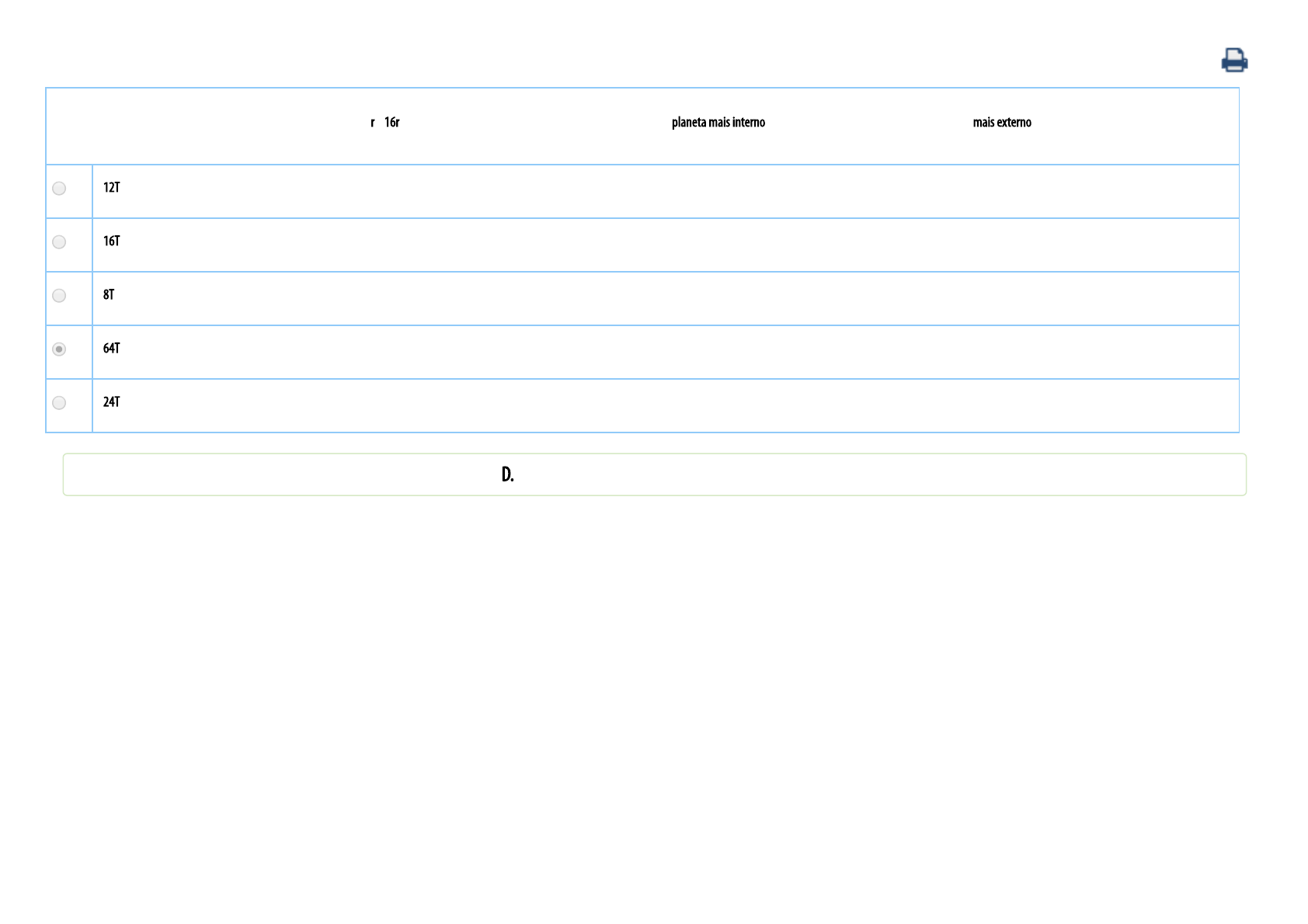 17/03/2020 Universidade Paulista - UNIP : Disciplina On-line. https://www.unip.br/presencial/central/Interna.aspx 1/1 Considere dois planetas hipotéticos cujas órbitas circulares têm raio r e 16r, em torno de um mesmo "Sol". Sendo T a duração do ano do planeta mais interno, podemos a�rmar corretamente que o ano do mais externo vale: A 12T B 16T C 8T D 64T E 24T Você já respondeu e acertou esse exercício. A resposta correta é: D.
