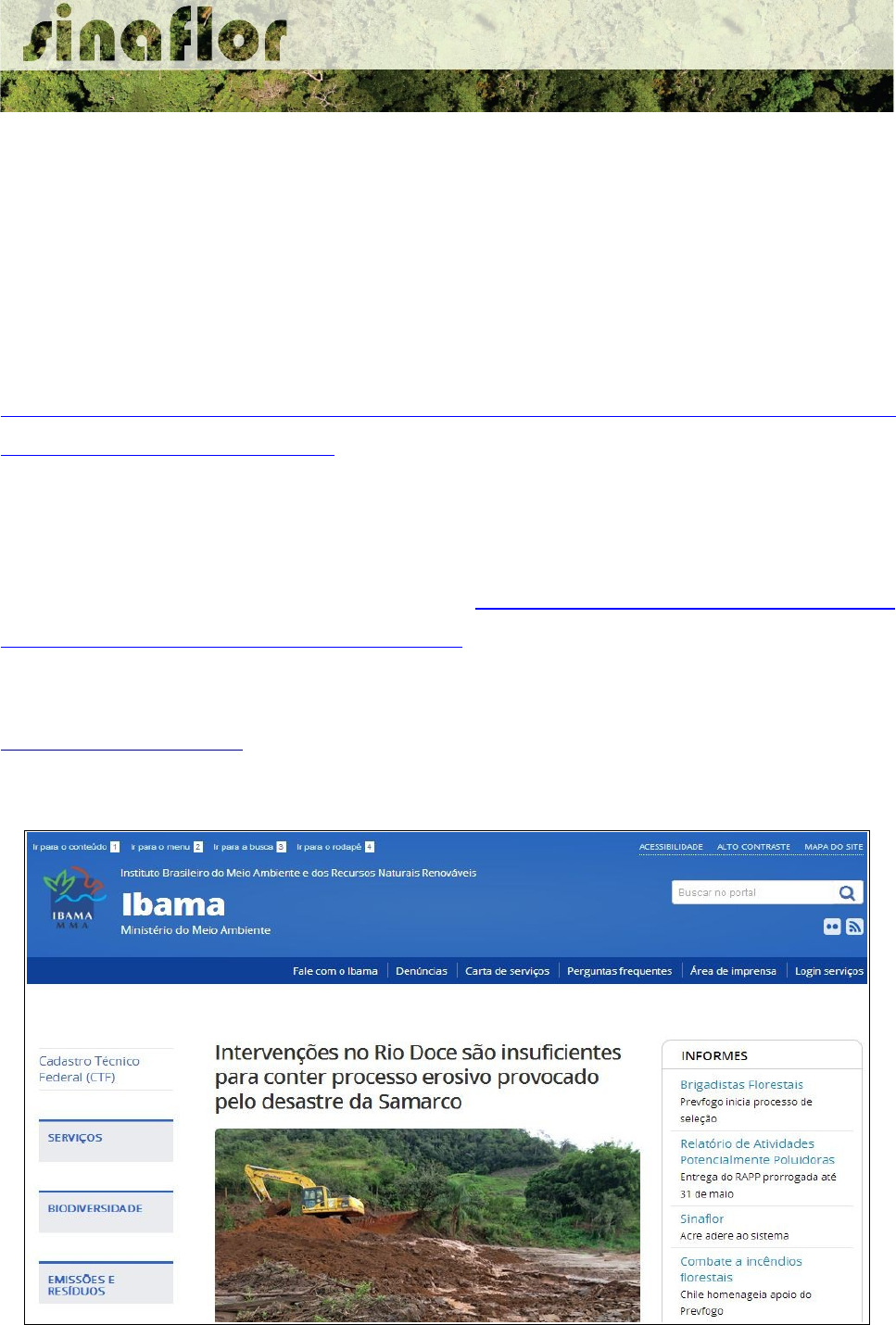 1. Acesso ao SINAFLOR – Usuário Externo O Sistema SINAFLOR apresenta módulos para acesso específico destinado aos produtores rurais/empreendedores e ainda módulo destinado aos consultores responsáveis pela elaboração e condução dos projetos florestais. O usuário, enquanto produtor rural/empreendedor, deve estar cadastrado no Cadastro Técnico Federal de Atividades Potencialmente Poluidoras e/ou Utilizadoras de Recursos Ambientais (CTF/APP), em qualquer atividade que esteja relacionada as categorias “Indústria de Madeira” ou “Uso de Recursos Naturais”. É importante ainda que este usuário esteja em dias com o Comprovante de Registro e o Certificado de Regularidade. Para o Responsável Técnico acessar o Sinaflor ele deverá exercer como pessoa física atividades sujeitas à inscrição no Cadastro Técnico Federal de Atividades e Instrumentos de Defesa Ambiental (CTF/AIDA). O acesso ao sistema SINAFLOR ocorrerá pela página do IBAMA http://www.ibama.gov.br/, devendo em seguida o usuário acessar a opção “Login Serviços” http://www.ibama.gov.br/ O usuário deverá então efetuar o login na página de serviços do IBAMA. IMPORTANTE: Todos os usuários deverão acessar o Sinaflor mediante uso de certificado digital do tipo A3. Para os usurários do sistema SINAFLOR, o Certificado Digital é uma credencial que atesta a identidade de uma pessoa física ou jurídica, com objetivo principal de garantir que as transações eletrônicas dos produtos e subprodutos florestais sejam efetuadas com segurança, mantendo a integridade e a confidencialidade dos documentos e dados da transação, reduzindo os riscos de furtos de senha e movimentações fraudulentas de créditos florestais. Após autenticação, é apresentada lista dos Serviços disponíveis para o usuário nos sistemas do Ibama, devendo então ser selecionada a opção: Sinaflor - Sistema Nacional de Controle da Origem dos Produtos Florestais. Uma vez que o sistema está sendo lançado gradativamente em todos os estado brasileiros, é gerada mensagem para que o usuário observe se a implantação do sistema SINAFLOR já ocorreu devidamente em seu estado. Em caso afirmativo, clique em prosseguir e logo em seguida já estará disponível a tela de acesso ao sistema SINAFLOR. No caso do Responsável Técnico, o qual está vinculado ao Cadastro Técnico Federal de Atividades e Instrumentos de Defesa Ambiental (CTF/AIDA), este deverá também efetuar o login na página dos Serviços do Ibama . Após autenticação, será apresentada mensagem para seleção de sistemas que deseja acessar: “Serviços Ibama” ou “Serviços CTF/AIDA”. O RT deve clicar na opção “Serviços Ibama” . https://servicos.ibama.gov.br/ctf/sistema.php https://servicos.ibama.gov.br/ctf/sistema.php Realizado o login na página de “Serviços Ibama”, deve então o Responsável Técnico selecionar a opção “SINAFLOR – Sistema Nacional de Controle da Origem dos Produtos Florestais” Estará então disponível a página de acesso ao SINAFLOR. Importante ressaltar que os próximos passos para o efetivo acesso ao SINAFLOR devem ocorrer com o “Cadastro do Empreendimento” e “Cadastro do Responsável Técnico”.