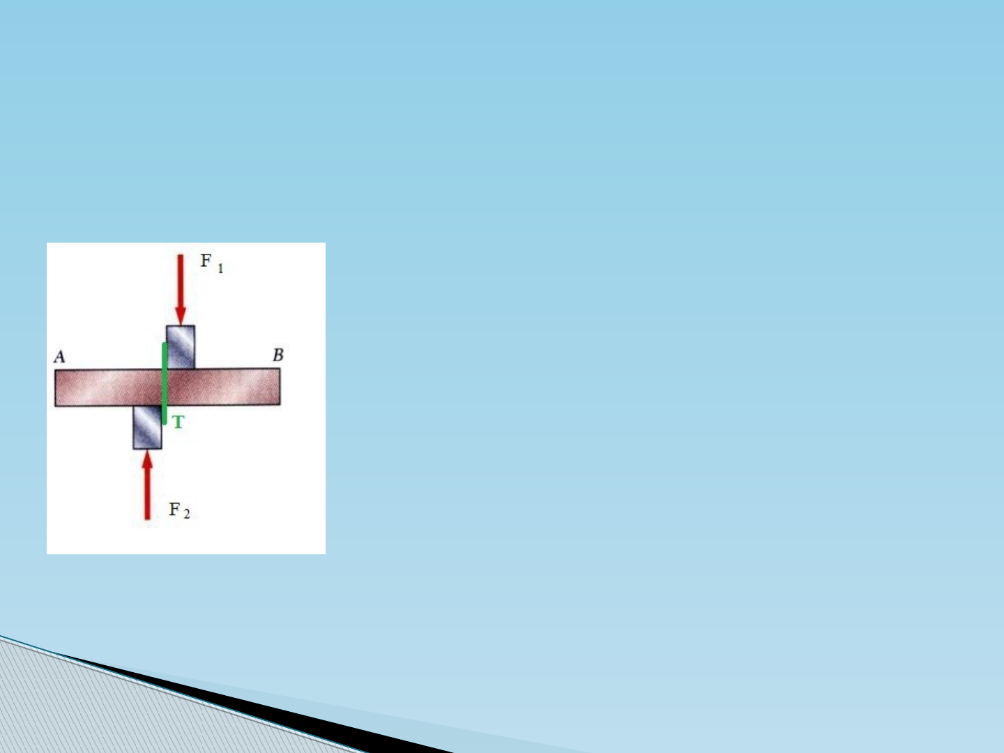 Equipe: Bruno Alves Eiko Dutra João Roberto Marcos Aurelio CISALHAMENTO A tensão que nos referimos ao estudar a resistência dos materiais é a tensão mecânica. A tensão de cisalhamento ou tensão tangencial é um tipo de tensão gerada por forças aplicadas em sentidos opostos, porém em direções semelhantes no material analisado. O que é TENSÃO DE CISALHAMENTO? Observe a imagem ao lado: Neste caso surgem forças internas atuando na seção T chamadas forças cortantes. A distribuição das tensões de cisalhamento não pode ser assumida como uniforme já que esta distribuição varia de zero na superfície da barra até um valor máximo no centro do corpo. Podemos realizar o corte por cisalhamento colocando uma chapa ou material a ser cortado entre duas facas de corte. A faca inferior é fixa e a superior é dotada de movimento ascendente/descendente. O esforço cortante é produzido pelo movimento descendente da faca superior que, ao penetrar no material a ser cortado, cria uma zona de deformação e o corte por cisalhamento. Corte de materiais por cisalhamento: Sim, a tesoura é um aparelho que utiliza a tensão de cisalhamento para realizar o corte: De acordo com a explicação sobre corte você lembrou-se de algum objeto que utilizamos no dia-a-dia? A tesoura é constituída por duas lâminas articuladas. As lâminas, que podem ou não ser muito afiadas, cortam o material através da ação de tensão de cisalhamento, aplicadas utilizando o principio de alavanca. Sendo assim, a tesoura é tanto mais eficaz quanto mais próximo o objeto a ser cortado estiver da articulação.