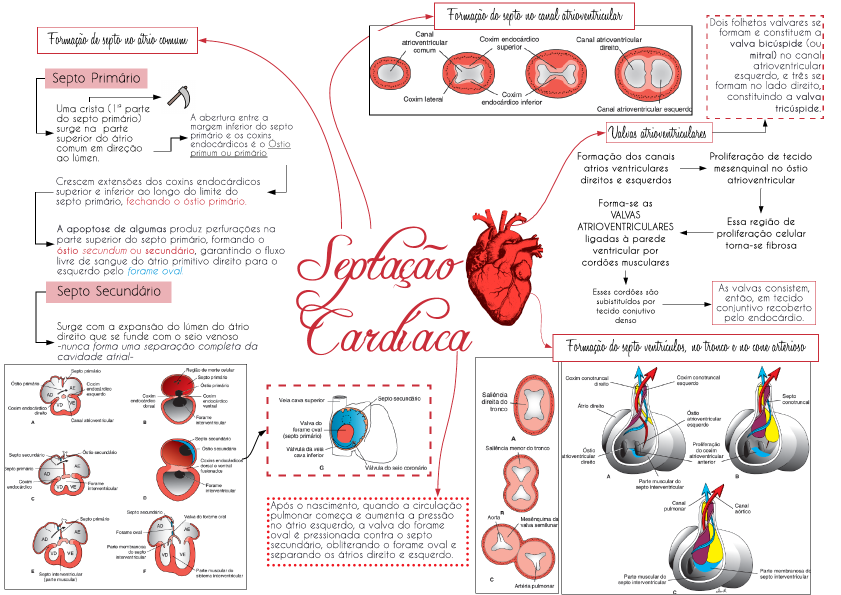 Septação Cardíaca Formação de septo no átrio comum Septo Prim ário Uma crista (1ª parte do septo primário) surge na parte superior do átrio comum em direção ao lúmen. A abertura entre a margem inferior do septo primário e os coxins endocárd icos é o Ó stio primum ou primário Crescem extensões dos coxins endocárd icos superior e inferior ao longo do limite do septo primário, fechando o óstio primário. A apoptose de algumas produz perfurações na parte superior do septo primário, formando o óstio secundum ou secundário, garantindo o fluxo livre de sangue do átrio primitivo d ireito para o esquerdo pelo forame oval. Septo Secundário Surge com a expansão do lúmen do átrio d ireito que se funde com o seio venoso -nunca forma uma separação completa da cavidade atrial- Após o nascimento, quando a circulação pulmonar começa e aumenta a pressão no átrio esquerdo, a va lva do forame oval é pressionada contra o septo secundário, obliterando o forame oval e separando os átrios d ireito e esquerdo. Formação do septo no canal atrioventricular Valvas atrioventriculares Formação dos canais atrios ventriculares direitos e esquerdos Proliferação de tecido mesenquinal no óstio atrioventricular Essa região de proliferação celular torna-se fibrosa Forma-se as VALVAS ATRIOVENTRICULARES ligadas à parede ventricular por cordões musculares Esses cordões são subistituídos por tecido conjutivo denso As valvas consistem, então, em tecido conjuntivo recoberto pelo endocárd io. Dois folhetos valvares se formam e constituem a valva bicúspide (ou mitral) no canal atrioventricular esquerdo, e três se formam no lado d ireito, constituindo a valva tricúspide. Formação do septo ventrículos, no tronco e no cone arterioso Embriologia do Sistema Cardiovascular 2 - Juliana Raizel Página 1