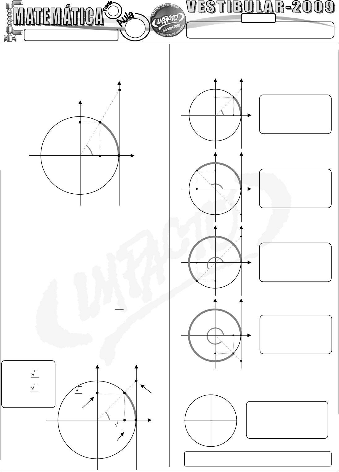 JACKY25/03/08 Relações Trigonométricas Fundamentais no Círculo FAÇO IMPACTO - A CERTEZA DE VENCER!!! PROFº: GEORGE CHRIST Fa le c on os co w w w .p or ta lim pa ct o. co m .b r VE ST IB UL AR – 2 00 9 CONTEÚDO A Certeza de Vencer 06 2 1. SENO, COSSENO E TANGENTE DE UM ARCO NO CICLO TRIGONOMÉTRICO. Para determinarmos o seno, cosseno e tangente de um arco x no ciclo trigonométrico é necessário conhecer os seguintes eixos: O eixo dos senos é o eixo vertical que passa pelo centro O da circunferência trigonométrica e o eixo dos cossenos é o eixo horizontal que passa pelo mesmo ponto. O eixo das tangentes também é vertical, porém passa pelo ponto A da circunferência, isto é, o eixo é tangente à circunferência no ponto A. Onde: • x é um arco cuja origem é o ponto A e a extremidade é o ponto P; • A abscissa do ponto P é chamada cosseno de x e é indicada por cos x; • A ordenada do ponto P é chamada seno de x e é indicada por sen x; • Prolongando-se o segmento OP obtém-se a tangente de x, indicada por tg x. Exemplo: 01. Represente no ciclo trigonométrico o seno, cosseno e tangente de 45º. Resolução: 2. CRITÉRIOS DE POSITIVIDADE. Analisaremos os sinais do seno, cosseno e tangente de arcos nos quatro quadrantes do ciclo trigonométrico em busca de critérios de positividade. A análise acima pode ser resumida no seguinte esquema: x A 1 1 P – 1 – 1 tg sen cos cos x sen x tg x x O x A 1 1 P – 1 – 1 tg sen cos cos 45º sen 45º tg 45º x O 2 0,7 2 ≅ 2 0,7 2 ≅ 1 Lembre-se que: 2sen 45º 0,7 2 2cos 45º 0,7 2 tg 45º 1 = = = = = Grave a Frase: USA SEMPRE A TUA CABEÇA U: todos são positivos; S: o seno é positivo; T: a tangente é positiva; C: o cosseno é positivo. US CT x A P cos(+) x O sen(+) tg(+) x A P cos(–) x O sen(+) tg(–) x A P cos(–) x O sen(–) tg(+) x A P cos(+) x O sen(–) tg(–) 1º QUADRANTE ( ) sen x 0 (positivo) cos x 0 (positivo) tg x 0 positiva > > > 2º QUADRANTE ( ) sen x 0 (positivo) cos x 0 (negativo) tg x 0 negativa > < < 3º QUADRANTE ( ) sen x 0 (negativo) cos x 0 (negativo) tg x 0 positiva < < > 4º QUADRANTE ( ) sen x 0 (negativo) cos x 0 (positivo) tg x 0 negativa < > < FAÇO IMPACTO – A CERTEZA DE VENCER!!! Fa le c on os co w w w .p or ta lim pa ct o. co m .b r VE ST IB UL AR – 20 09 3. VALORES MÁXIMOS E MÍNIMOS. Seja x um arco qualquer. Os valores de seno e cosseno de x são no mínimo 1− e no máximo 1. A tangente de x pode assumir qualquer valor real, porém não existem as tangentes de 90º, 270º e seus côngruos. A tangente de um arco x existe para todo x diferente de 90º, de 270º e de seus côngruos. Em símbolos: tg x, x | x k . , k 2 π∃ ∀ ∈ ≠ + π ∈� � Observe a tabela de valores a seguir: 0º 90º 180º 270º 360º sen 0 1 0 – 1 0 cos 1 0 – 1 0 1 tg 0 não existe 0 não existe 0 4. EXERCÍCIOS (DESTRUIÇÃO TOTAL). 01. (MACK) I) cos 225º cos 215º< II) 5 5tg sen 12 12 π π> III) sen 160º sen 172º> Das afirmações acima: a) Todas são verdadeiras b) Todas são falsas c) II e III são verdadeiras d) II é verdadeira e) I e II são verdadeiras 02. (FATEC) Sobre as sentenças I) sen 40º sen 50º< II) cos 190º cos 200º> III) tg 60º tg 240º= É correto afirmar que somente: a) I é verdadeira b) II é verdadeira c) III é verdadeira d) I e II são verdadeiras e) I e III são verdadeiras 03. (UFRS) Se 85ºθ = , então: a) tg cos senθ < θ < θ d) sen tg cosθ < θ < θ b) sen cos tgθ < θ < θ e) cos tg senθ < θ < θ c) cos sen tgθ < θ < θ 04. (VUNESP) Se x é a medida de um ângulo em radianos e 3x 2 4 π π< < , então: a) cos x 0> c) tg x 0> e) sen 2x 0> b) cos 2x 0< d) sen x 0< 05. (UNIFOR) A sentença cos x 2m 1= − é verdadeira para todo número real x se, e somente se, m pertence ao conjunto: a) 0,+ ∞⎡ ⎡⎣ ⎣ b) 0,1⎡ ⎤⎣ ⎦ c) � d) +� e) 1,1−⎡ ⎤⎣ ⎦ 06. (UFRS) Sendo x um número real, o menor e o maior valor possíveis da expressão ( ) 42 5 2 sen 10x− são, respectivamente: a) 6 e 14 c) 14 5 − e 42 25 e) – 14 e – 6 b) – 21 e 42 5 d) – 42 e 42 07. (MACK) A soma dos valores máximo e mínimo de 222 cos x 3 + é: a) 8 3 b) 10 3 c) 4 d) 14 3 e) 16 3 08. (FUVEST) Qual das afirmativas a seguir é verdadeira? a) sen 210º cos 210º tg 210º< < b) cos 210º sen 210º tg 210º< < c) tg 210º sen 210º cos 210º< < d) tg 210º cos 210º sen 210º< < e) sen 210º tg 210º cos 210º< < 09. (IBMEC) O Valor monetário de uma ação é dado por ( )V(t) 120 80.cos t= + , onde t é um número real positivo. De acordo com este modelo, o valor monetário máximo que essa ação pode assumir é: a) 120 b) 200 c) 880 d) 40 e) 240 10. (FUVEST) Em cada um dos itens a seguir, qual dos números é maior? a) sen 830º ou sen 1195º b) ( )cos 535º− ou cos 190º GABARITO 01 02 03 04 05 06 07 08 09 10 C E C B B A D B B a) sen 830º b) cos 190º 1 sen x 1− ≤ ≤ 1 cos x 1− ≤ ≤ tg x ∈ � 90º A P 90º O tg 270º A P 270º O tg