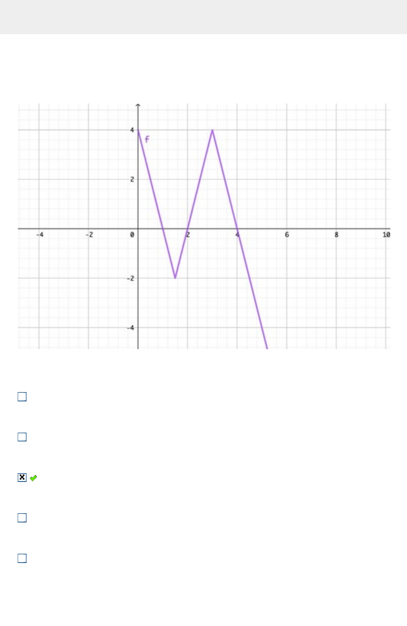 5a Questão Acerto: 1,0 / 1,0 Seja f:R→R, dada pelo gráfico a seguir: É correto afirmar que: f é sobrejetora e não injetora. f é periódica de período 1. O conjunto imagem de f é (-∞,4]. f é crescente para todo x>0. f é bijetora. Respondido em 12/05/2020 13:55:47