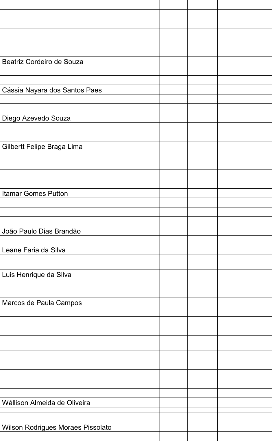 Alunos Introd Fis NA P1 P2 SAEC MF Sub Alexandre Magno de Souza 3,0 2,0 4,7 2,8 P2 Alexsandro Rodolfo Barnuevo 3,0 4,4 9,3 4,5 P1 Alinne Lennore Alves Miguel 1,5 2,4 4,7 2,4 P1 Allaink Breno Rodrigues Aguiar 3,5 5,2 6,0 4,6 P1 Ana Caroline Borlotti 1,5 2,4 2,7 2,1 P1 Beatriz Cordeiro de Souza 6,0 5,7 5,3 5,8 Ap Bruna Junqueira Júlio 1,5 6,0 2,7 3,6 P1 Carlos Umberto Alves Campos Júnior 3,5 4,4 8,7 4,7 P1 Cássia Nayara dos Santos Paes 10,0 7,6 7,3 8,6 Ap Cleishteffania de Oliveira Viana 1,5 2,4 6,7 2,7 P1 Daniel Cáceres Paes 2,5 2,8 6,0 3,2 P1 Diego Azevedo Souza 10,0 8,8 7,3 9,1 Ap Eliene Aparecida Narcizo 5,5 2,4 4,7 4,1 P2 Francisco Batista Pereira 3,5 0,4 3,3 2,2 P2 Gilbertt Felipe Braga Lima 7,0 8,8 8,0 7,9 Ap Giovana Figueiredo Grecco dos Santos 3,0 1,2 4,7 2,5 P2 Guilherme Luis Ferreira dos Santos 2,5 6,0 8,0 4,8 P1 Guilherme Torres Avelino 4,0 2,4 7,3 3,8 P2 Ítalo Lobo de Freitas 0,0 0,0 4,7 0,7 Itamar Gomes Putton 8,5 3,3 5,3 5,8 Ap Jackson Joel Lacerda Gravino 9,0 1,6 6,0 5,4 P2 Jam Karla Alves de Lima 2,0 2,8 6,7 3,0 P1 João Paulo de Lima Odinino 6,0 4,0 8,6 5,5 P2 João Paulo Dias Brandão 8,0 8,4 5,3 7,8 Ap Layra Nunes Araújo 6,0 0,4 3,3 3,2 P2 Leane Faria da Silva 3,5 7,6 8,0 5,9 Ap Lenner Salvador Schervinski Pereira Letícia Pazini do Nascimento 1,5 0,4 0,8 P2 Luis Henrique da Silva 8,5 4,4 5,3 6,3 Ap Luís Henrique Ortiz Boeira 5,6 7,3 3,5 P1 Luiz Antonio Orzari Filho 2,0 2,4 5,3 2,7 P1 Marcos de Paula Campos 9,5 3,6 8,0 6,8 Ap Miguel Lito da Cunha Moraes Junior 1,5 2,0 4,0 2,1 P1 Moacyr José Marcos Soares 1,5 2,0 3,3 2,0 P1 Rafael Dias Moura 6,5 2,8 2,0 4,3 P2 Rayssa Thaynara Botechia Renan Gabriel Siqueira Bragagnolle 2,0 0,4 8,0 2,2 P2 Renato Gazio Neto 3,0 0,0 5,3 2,1 P2 Ricardo Leivas Teixeira 2,5 2,8 10,0 3,8 P1 Richard Wésley de Almeida 5,0 5,2 5,3 5,1 P1 Rodrigo Correa de Oliveira 8,5 5,2 9,3 7,2 Ap Vítor Adélio Valim 1,5 0,4 6,0 1,7 P2 Wállison Almeida de Oliveira 8,0 6,8 6,3 Ap Wanderson Coelho da Silva Wellington Daniel Elias da Silva 7,5 3,7 6,7 5,8 Ap Wilson Rodrigues Moraes Pissolato 10,0 4,0 8,0 7,2 Ap Yuri Klissman Angelo Barbosa 1,5 0,4 8,0 2,0 P2 Wállison Highlight Wállison Highlight Wállison Highlight Wállison Highlight Wállison Highlight Wállison Highlight Wállison Highlight Wállison Highlight Wállison Highlight Wállison Highlight Wállison Highlight Wállison Highlight