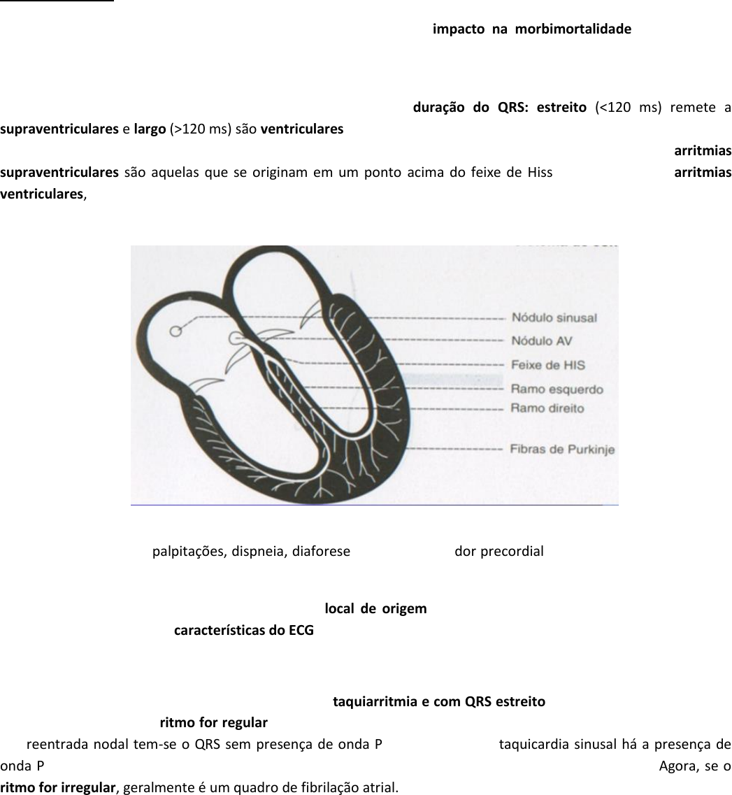 FPM – CARDIO – TAQUIARRITMIAS Referência: slides do professor e áudio da aula TAQUIARRITMIAS São responsáveis por inúmeras admissões hospitalares com real impacto na morbimortalidade. A abordagem adequada necessita de: abordagem clínica, avaliação dos mecanismos arritmogênicos, elaboração dos diagnósticos diferenciais. Um ponto fundamental na avaliação das taquiarritmias é a duração do QRS: estreito (<120 ms) remete a supraventriculares e largo (>120 ms) são ventriculares geralmente (existem algumas taquicardias supraventriculares que apresentam uma aberrância de condução tendo o QRS alargado, são casos particulares) . As arritmias supraventriculares são aquelas que se originam em um ponto acima do feixe de Hiss e ao se referir as arritmias ventriculares, pensa-se sempre em arritmias que estão abaixo do feixe de Hiss (seu fator deflagrador está em alguma estrutura do eixo de condução abaixo do feixe de Hiss). Manifestações clínicas: palpitações, dispneia, diaforese (sudorese fria), dor precordial, em alguns casos há também quadro de síncope e pré-síncope. Pode se classificar as taquiarritmias segundo seu local de origem (taquicardias supraventriculares e taquicardias ventriculares) e segundo as características do ECG (duração do QRS e ritmo do traçado). # Taquiarritmias Supraventriculares – QRS estreito Sempre que houver uma admissão de paciente com taquiarritmia e com QRS estreito, o próximo passo é realizar a avaliação do ritmo. Se o ritmo for regular, em seguida procura-se a presença de onda P; no quadro de taquicardia por reentrada nodal tem-se o QRS sem presença de onda P; já no quadro de taquicardia sinusal há a presença de onda P, que é o contrário da bradicardia sinusal, pois é um ritmo sinusal normal, porém taquicárdico. Agora, se o ritmo for irregular, geralmente é um quadro de fibrilação atrial. Fernando Carli Realce Fernando Carli Realce Fernando Carli Realce Fernando Carli Realce Fernando Carli Realce Fernando Carli Realce Fernando Carli Realce Fernando Carli Realce Fernando Carli Realce Fernando Carli Realce Fernando Carli Realce Fernando Carli Realce Fernando Carli Realce Fernando Carli Realce Taquicardia sinusal Pode ocorrer em resposta a um estímulo fisiológico (exercício, estresse emocional) e como consequência de um estímulo excessivo (hipertireoidismo, uso de medicações adrenérgicas atropina ou aminofilina). Por definição, é uma FC acima de 100 bpm e onda P com morfologia igual a sinusal. Fernando Carli Realce Fernando Carli Realce Fernando Carli Realce Nesse ECG nota-se ritmo sinusal (presença de onda P enlaçada com o QRS nas derivações D1, D2 e AvF), FC por volta de 140 bpm (taquicardia). Taquicardia atrial Frequentemente benigna, com a possível exceção das formas incessantes que podem levar à taquicardiomiopatia (cardiopatia dilatada que surge a partir de uma frequência cardíaca frequentemente mantida elevada). A onda P pode possuir uma morfologia distinta da sinusal, com frequência atrial de 100 a 250 bpm. Quando se tem uma taquicardia atrial, ela é avaliada em relação as ondas P e não em relação aos RR, pois os ventrículos podem estar batendo com sua frequência normal, porém o átrio fazendo sua contração repetidas vezes por estímulo; por isso que quando se fala em taquicardia atrial avalia-se a onda P, que nada mais é do que a representação gráfica da despolarização/contração atrial. Muitas vezes, para cada condução de um QRS têm-se duas ou até três despolarizações do átrio. Durante a arritmia, uma linha isoelétrica está usualmente presente entre as ondas P, podendo distinguir a taquicardia atrial do flutter atrial. Há duas formas de taquicardia atrial. A forma unifocal: na qual as ondas P possuem um ritmo regular com a mesma morfologia (são iguais). Já a na forma multifocal: a onda P tem pelo menos 3 morfologias distintas, o segmento PR possui variações mínimas e toda onda P é seguida por um QRS. Nesse ECG acima, no traçado superior nota-se a ausência de onda P. Em algumas situações, têm-se taquicardias supraventriculares com o QRS estreito e ausência de onda P. Na imagem debaixo desse ECG, onde há um zoom em outro traçado, percebe-se que entre um QRS há a presença de várias ondas P, o ventrículo está batendo com muitos estímulos atriais; se diferenciando de um BAVT porque terá uma FC normal ou aumentada, enquanto no BAVT a FC está diminuída. Fernando Carli Realce Fernando Carli Realce Fernando Carli Realce Fernando Carli Realce Fernando Carli Realce Fernando Carli Realce Fernando Carli Realce Fernando Carli Realce Nesse outro ECG acima, percebe-se a presença de onda P, porém com morfologias diferentes da onda P sinusal. A FC atrial está em torno de 140 bpm; em um ritmo sinusal, a frequência atrial é igual a frequência ventricular porque a cada contração do átrio há um estímulo para a contração do ventrículo. Na taquicardia atrial, o átrio conduz e muitas vezes essa condução não leva a um mecanismo de contração ventricular. Sempre ao se deparar com uma taquicardia com o QRS estreito e ritmo regular, em seguida avaliar a presença da onda P, caso exista a onda P avaliar a frequência dessa onda P, se essa frequência estiver acima de 100 bpm classifica-se esse caso como taquicardia atrial. Na taquicardia atrial, o estímulo não sai apenas do nó sinusal, ele pode ter outras origens o que altera a morfologia da onda P. Em alguns ECG terá ondas P positivas ao mesmo tempo outras negativas, tendo outros pontos dentro do átrio que estão lançando batimento/cargas fazendo o átrio contrair. Nesse ECG acima ocorre ritmo atrial ectópico (forma multifocal), nota-se diferentes morfologias da onda P (positivas e negativas). Essa imagem é a demonstração eletrocardiográfica de estímulos cardíacos saindo de outros pontos do átrio que não o nó sinusal; a essa alteração damos o nome de ritmo atrial ect