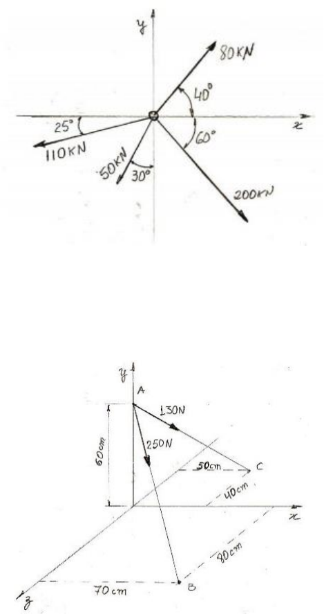 Atividade Avaliativa A1 – Mecânica dos Sólidos 1. Um anel está sujeito às forças indicadas na figura. Determine a resultante das forças aplicadas no respectivo objeto. R: 214,7 kN 2. Determinar o vetor cartesiano, o módulo e os ângulos diretores da resultante das forças 130N e 250N mostradas na figura abaixo: R: Vetor cartesiano = (217,3i – 211,6 j + 104,7k); Módulo = 320,9N x = 47,4°; y = 131,3°; z = 70,9° 3. Na figura abaixo, vemos dois corpos 1 e 2, de massas m1= 2,0 kg e m2 = 4,0 kg, respectivamente, ligados por um fio que passa por uma roldana. O bloco 2 está apoiado no solo. Supondo a inexistência de atritos e g = 10 m/s², indique quais são os módulos da força de tração no fio e da força que o bloco 2 aplica no solo. R: T = 20N; N = 20N 4. Um bloco, de peso igual a 30N, está em equilíbrio, suspenso por fios, conforme a figura abaixo. Sendo adotados sen 37° = 0,6 e cos 37° = 0,8, estime o módulo de F. R: 22,5N 5. O Snoopy, de massa m = 4 kg, está sentado no meio de uma barra de 6m de comprimento. Considerando o peso da barra desprezível, calcule a reação dos apoios A e B. R: NA = NB = 20N 6. Determinar as forças que atuam nas barras AB e AC da figura abaixo. R: AB = 357,53N; AC = 466,72N 7. Determinar todas as reações de apoio do corpo representado na figura abaixo. R: FAx = zero N; FBx = 20N; FAy = -1,66 N; FBy = 21,66N 8. Determinar as reações de apoio da seguinte estrutura: R: FAx = zero N; FBx = - 30 kN; FAy = 22,5 kN; FBy = -7,5 kN 9. Determinar as reações de apoio Ax, Ay e Bx da seguinte estrutura: R: FAx = 108,2 kN; FBx = - 123,67 kN; FAy = 55,55 kN; FBy = zero N 10. Determinar as reações de apoio da seguinte estrutura: R: FAx = zero N; FBx = zero N; FAy = -55 kN; FBy = 1515 kN 11. O momento torsor M de intensidade 18 N.m é aplicado no cabo de uma chave de fenda para apertar um parafuso em um bloco de madeira. Determine os módulos das duas menores forças horizontais que são equivalentes a M se estas forem aplicadas (a) nos cantos A e D; (b) nos cantos B e C; e (c) em qualquer lugar do bloco. R: FAD = 75 N; FBC = 71,2 N; Fmin = 45 N 12. Um letreiro da Universidade São Judas é pendurado por duas correntes no mastro AB na Rua Marechal Deodoro. O mastro é articulado em mastro é articulado em A e é sustentado pelo cabo e é sustentado pelo cabo BC. Sabendo que os pesos do mastro e do letreiro são 1000 N e 800 N, respectivamente, determine a tração no cabo BC e a reação na articulação em A. R: FAx = 3184 N; FAy = 1306,9 N; TBC = 3222,7 N 13. Determine as reações de apoio sobre o membro da figura abaixo. O colar em A é fixo no membro e pode deslizar livremente ao longo da barra vertical. R: FA = zero N; FBx = zero N; FBy = 900 N; MA = -1,49 kNm 14. A barra ilustrada abaixo é usada para sustentar o vaso de 375 N. Determine intensidade da força de tração nos cabos AB e AC. R: FAB = FAC = 437,5 N 15. A alavanca ABC é sustentada por um pino em A e conectada a uma ligação curta BD, como mostra a figura abaixo. Se o peso dos membros é desprezado, determine a força do pino sobre a alavanca em A. R: FA = 1,1 kN 16. O porta malas de um carro é sustentado por um amortecedor hidráulico BC. Se a haste do respectivo amortecedor exerce uma força de 556 N dirigida ao longo da sua linha de centro sobre a rótula em B, determine o momento da força em relação a A. R: MA = 136,85 Nm 17. Uma força de 200 N é aplicada em um suporte ABC, conforme mostrado na figura abaixo. Determine o momento da força sobre A. R: MA = (7,50i - 6,00j - 10,39 k)Nm 18. Uma antena é ancorada por três cabos como mostra a figura abaixo. Sabendo-se que a força de tração exercida no cabo AB é 1,28 kN, substitua a força exercida em A pelo cabo AB por um sistema força-binário equivalente, com centro em O na base da antena. R: F = (-568,8i – 1137,6j + 142,2k) N M = (5,46i + 21,84k) kN 19. A engrenagem C está firmemente ligada ao braço AB. Se as forças e o binário mostrados abaixo podem ser reduzidos a uma força única equivalente em A, determine a força equivalente e a intensidade do binário M. R: FA = 321,05 N MA = 276,98 Nm 20. Uma jardineira utiliza um carrinho de mão de 60 N para transportar um saco de fertilizante. Qual a força que ela deve exercer em cada barra do carrinho? R: F = 42N