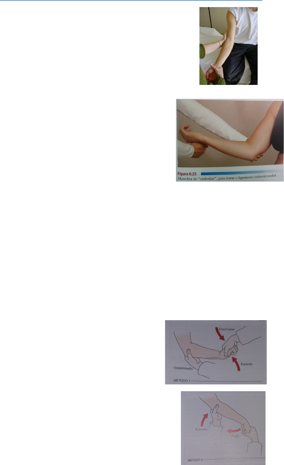 TESTE DE FORÇA MUSCULAR DO COTOVELO 1. Instabilidade ligamentar em Valgo: · Mão na altura do cotovelo (estabiliza o MS) a outra acima do punho · Forçar uma abdução valgizante na região distal · Ligamento colateral medial · Positivo: dor, frouxidão, instabilidade. 2. Manobra de Ordenhar: · Paciente sentado, cotovelo flexionado a 90°, antebraço supinado. · Examinador segura o polegar sobre o antebraço e traciona o membro provocando um estresse valgizante. · Lig. Colateral medial · Positivo: reprodução dos sintomas 3. Teste de levantar: · Sentado em uma cadeira sem braços, apoiar as mãos ao lado e apoiar para levantar o corpo · lig. Colateral medial · Positivo: sintomas reproduzidos 4. Instabilidade ligamentar em Varo: · Cotovelo flexionado 20-30°, mão sobre o cotovelo e outra distalmente · Forçar uma adução varizante · Lig. Colateral lateral · Positivo: instabilidade, dor e frouxidão 5. Teste para epicondilite lateral (cotovelo de tenista ou de COZEN) Método 1: · Estabilizar o cotovelo com o polegar sobre o epicôndilo lateral · Paciente fecha o punho, prona o antebraço, com desvio radial e extensão de punho · Colocar resistência ao movimento · Positivo: dor intensa na região de epicôndilo lateral 6. Teste para epicondilite lateral (cotovelo de tenista ou de MILL): Método 2: · Estabilizar o cotovelo com o polegar palpando o epicôndilo lateral · Examinador faz uma pronação passiva, flexão total de punho extensão de cotovelo · Positivo: dor na região · Também causa tensão e compressão do nervo radial (sintomas semelhantes) 7. Teste para epicondilite lateral (cotovelo de tenista): Método 3: · Aplicar uma resistência contra a extensão do terceiro metacarpo (distalmente) – estresse sobre o extensor do dedo · Positivo: dor na região de epicôndilo lateral 8. Teste para epicondilite medial (cotovelo de golfista): · Palpar epicôndilo medial, fazer uma supinação passiva e estender o cotovelo e o punho · Positivo: dor na região 9. Teste para disfunção umerorradial: · Colocar a articulação do cotovelo na posição que sente dor e fazer um desvio radial · Positivo: piora da dor 10. Teste para disfunção umeroulnar: · Colocar a articulação do cotovelo na posição que sente dor e fazer um desvio ulnar · Positivo: piora da dor 11. Sinal de Tinel no cotovelo: · Percutir o nervo ulnar no sulco entre o olecrano e o epicôndilo medial · Verifica lesão nervosa (disfunção neurológica) · Positivo: sensação de formigamento na distribuição do nervo. 12. Sinal de Wartenberg: · Paciente sentado com os braços apoiados na mesa, afastar os dedos passivamente e solicitar que os aproxime novamente. · Verifica lesão nervosa (disfunção neurológica) · Positivo: não consegue aproximar o dedo mínimo (neuropatia ulnar) 13.Teste da flexão do cotovelo: · Flexionar o cotovelo completamente, com extensão de punho, abdução e depressão da cintura escapular. Manter de 3-5 min · Verifica lesão nervosa (disfunção neurológica) · Positivo: sensação de formigamento ou parestesia na distribuição do nervo ulnar (síndrome do túnel cubital) 14. Teste para síndrome do pronador redondo: · Flexionar o cotovelo a 90°, o examinador aplica uma resistência contra a pronação e extensão do cotovelo. · Verifica lesão nervosa (disfunção neurológica) · Positivo: sensação de formigamento ou parestesia na distribuição do mediano.