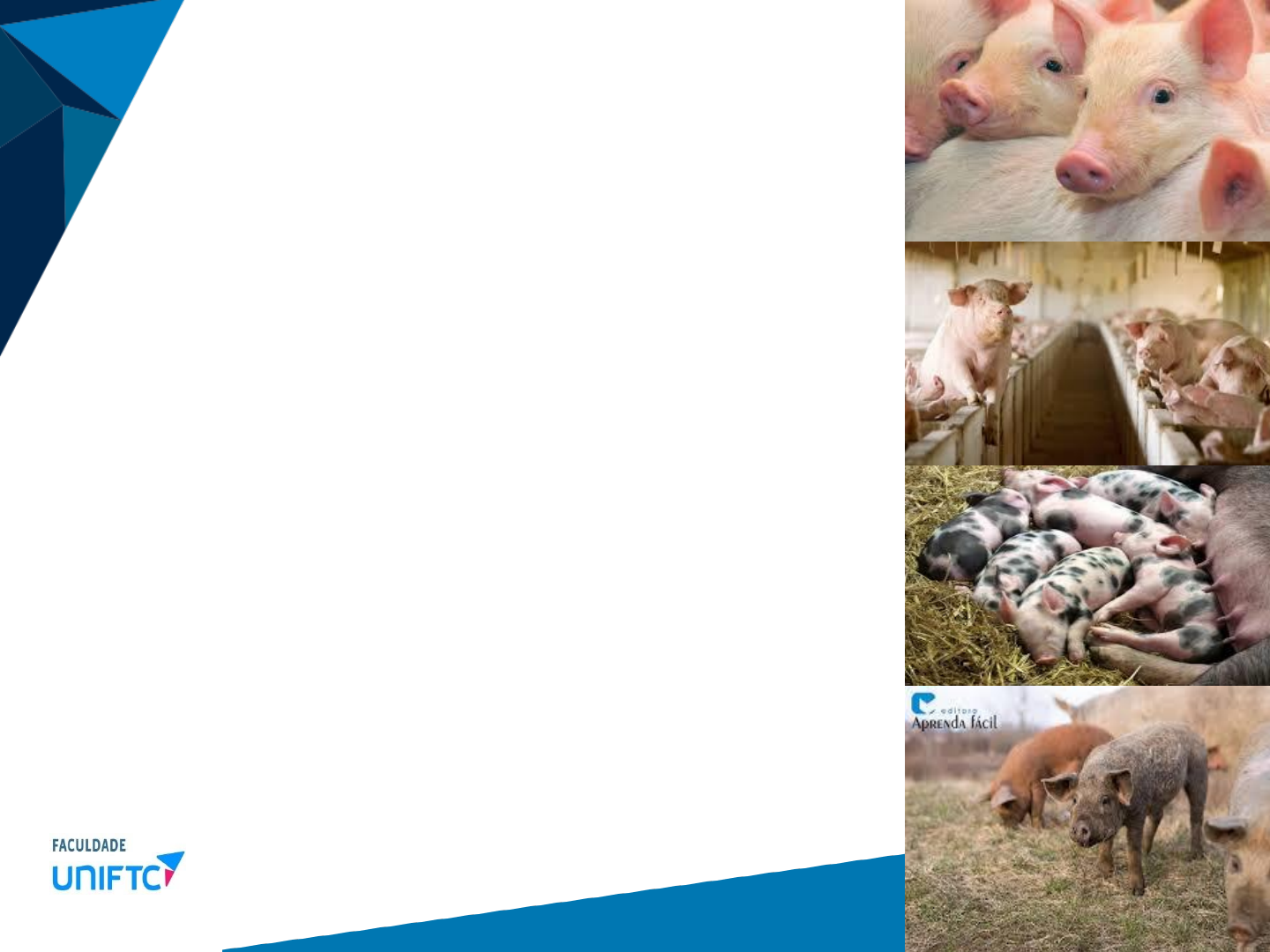SUÍNOS Curso de Medicina Veterinária Disciplina: Introdução a Veterinária Profa. Msc. Louise Santos INTRODUÇÃO • Está associada a3 espécies de javalis: – Sus scrofa scrofa –> Europa e norte da África; – Sus scrofa vittatus –> Indonésia, Japão e China; – Sus scrofa cristatus –> Índia. • Pinturas rupestres – Altamira; • 15.000 anos. INTRODUÇÃO • Javali: – Sus scrofa linnaes; – Mamíferos onívaros; – Entelodontidae; – Antecedentes mais antigos. DOMESTICAÇÃO • Sus scrofa domesticus; • 9.000 anos a.C. – Grécia e Turquia; • 6.000 anos a.C. – China e Egito; • 4.000 anos – Europa central. • Período neolítico; • Agricultura e criação de animais; DOMESTICAÇÃO • Modificação de características externas: – Tamanho do corpo e cérebro diminuiu; – Dentes menores; – Focinho menor; – Orelhas caídas; – Tamanho, densidade e coloração dos pêlos. PORCO CHINÊS • 3.500 a.C.; • Dinastia Han (202 a.C. até 220 d.C.); • Escultura de porcos em sepulturas humanas; • Riqueza e fartura; • China é o maior produtor mundial de suínos; • 480 milhões de cabeças; • 50% do rebanho mundial. PORCO NO ANTIGO EGITO • 4.000 anos; • Mesopotâmia e Turquia; • Usados para puxar o arado; • “Garis” da Babilônia; • Considerados impuros; • Pessoas que manejavam estes porcos não podiam frequentar lugares sagrados. PORCO NA BÍBLIA • Sugerem o não consumo da carne suína; • Velho testamento – 3º livro de Moisés; • Tênias entre outros parasitas; • Carne suína mal cozida; • Banho de lama: – Regulação térmica; – Limite territorial e sexual. PORCO NA BÍBLIA ..." também os porcos, porque as unhas são fendidas e as fendas das unhas divididas em duas, ... estes vos serão imundos. "(Lev. 11,7). "... Não dêem aos cães coisas santas, nem deites vossas pérolas aos porcos,pois voltando-se, eles as pisarão com os pés e as despedaçarão". (Mt, 7,6). PORCO NA GRÉCIA ANTIGA • Aristóteles: – “A História dos Animais”; – “Obras completas”; • Comportamento, preferências e hábitos; • Hipócrates: – Alto teor de gordura; – Preservação do tônus muscular. • Pinturas de vasos, moedas, oferenda aos Deuses. ANTIGUIDADE LATINA • Fonte de alimento e fartura; • Primeiras granjas –> Roma; • Uso de dejetos. CELTAS E POVOS GERMÂNICOS • Fonte de alimento; • Domesticação diminui caça ao Javali; • Símbolos de força física, vitalidade e virilidade; • Moccus – deus porco; • Prosperidade, riqueza e fartura. OUTROS POVOS • Idade Média: – 1500 – regulamentação da criação de porcos; – 24 leitões por cidadão; • América Latina: – Trazidos por Colombo; – Guerra do Paraguai (1864-1870); – Porcos se espalharam e se adaptaram ao ambiente selvagem. PORCOS NO BRASIL • 1532 – Martin Afonso de Souza; • Javalis europeus e Indianos; • Adaptação ao clima tropical; • Desenvolvimento de raças próprias; • Século XX – sistema extensivo: – Rusticidade; – Facilidade de adaptação; – Grande resistência à doenças. PORCOS NO BRASIL • Importação de raças estrangeiras; • 3º maior rebanho do mundo: • 33 milhões de cabeça; • 3,5 da população mundial de suínos. RAÇAS BRASILEIRAS Empresa Brasileira de Pesquisa Agropecuária (EMBRAPA) Recursos Genéticos e Biotecnologia: • Canastrão; • Zabumba; • Canastra; • Nilo; • Nilo Canastra; • Cabano; • Vermelho; • Meia Perna; • Mexabomba; • Tatu; • Canastrinho; • Macau; • Perna Curta; • Baé; • Caruncho; • Piau; • Pequeno; • Caruncho; • Vermelho; • Tatu Canastra; • Pirapetinga; • Junqueira; • Junqueira; • Pereira; • Tatuí; • Sorocaba; • Piau de São Carlos; • Piau de Uberaba; • Piau Carioca; • Canastrão Preto; • Caruncho Malhado; • Carunchinho Pintado; • Simetral; • Moura; • Casco de Burro. RAÇAS ESTRANGEIRAS • Plantel composto por raças: – Landrace – Dinamarca; – Large White – Inglaterra; – Duroc – Estados Unidos; – Pietran – Bélgica; – Hampshire – Estados Unidos; – Wessex – Inglaterra. • Animais híbridos. REBANHO BRASILEIRO • Santa Catarina: – Formação histórica, cultural e social; – ECONOMIA; – 200 mil empregos diretos; – Imigrantes Italianos; – 60% dos abates; – Primeiras agroindústrias – década de 40; – Maior rebanho do país 5.775.890 cabeças; – 17,5% da produção nacional. INDICES ZOOTÉCNICOS • MATRIZ: – Idade à primeira cria 324 a 354 dias; – Intervalo entre desmama 5 a 10 dias; – Intervalo entre partos 150 dias; – Período de gestação 114 dias; INDICES ZOOTÉCNICOS • VARRÃO: – 1ª cobertura 220 dias; – Peso na 1ª cobertura 120 a 10 kg. INDICES ZOOTÉCNICOS • LEITÃO: – Mais de 11 nascidos vivos; – Mais de 10 desmamados; – 1,4 kg ao nascer. • Seis meses 70 e 90 kg; • 270 kg machos; • 220 kg fêmea; • Reprodutores 300/350 kg; • Castrados 500 kg.