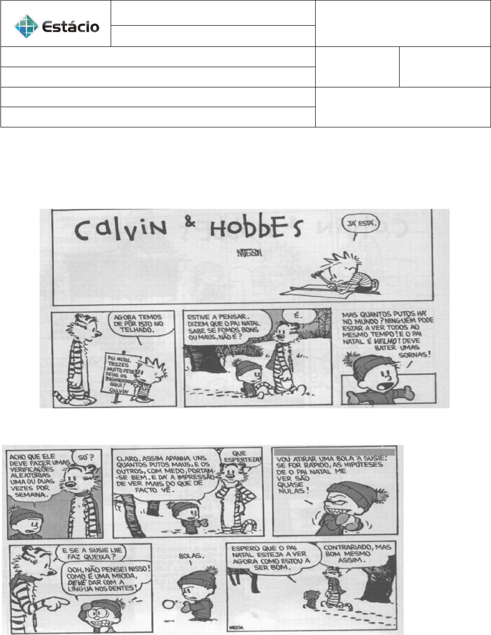 Data: 14/05/2020 Rubrica da Professora: Prova: AV1 Curso: Psicologia Turma:3001 Valor da Prova: 4,0 Disciplina:Filosofia e Ética Professora: Suelen Carvalho Mota Grau Obtido: Aluno(a): Daisy dos Anjos Alfaia Sousa AVALIAÇÃO 1) Segundo as ações morais de Kant por dever ou ao dever, análise a charge de Calvin e Hobbes e responda: A ação de Calvin foi por dever ou ao dever? Justifique. R: A ação de Calvin foi ao dever sua intenção era que pai natal tivessem uma impressão boa de seu comportamento com objetivo de ganhar presente, e para Kant essa conduta não tem valor moral. 2) (UFU-2006) Leia com atenção o texto abaixo. Para responder as questões A e B. Um menino, a pedido de sua mãe, foi de manhã à padaria para comprar pães de queijo. Como estivesse em dificuldades financeiras, o comerciante cobrou-lhe trinta centavos a mais pela mercadoria, considerando que este dinheiro por certo não faria falta a uma criança da aparência tão saudável. No início da noite, o pai do menino voltou à padaria para comprar leite, e equivocou-se ao pagar o comerciante, dando-lhe cinquenta centavos a mais. O comerciante, no entanto, prontamente, restituiu ao freguês os cinquenta centavos pagos a mais, considerando que o pai do menino era fiscal da prefeitura e que, em qualquer caso, seria conveniente manter boas relações com as autoridades locais. Em conformidade com o pensamento kantiano (imperativo categórico), responda as duas questões que se seguem. A) Por que a primeira atitude do comerciante (em relação ao menino) é contrária ao dever e imoral? R: Porque para Kant age como se a máxima de tua ação devesse servir de lei universal para todos os seres racionais, neste caso o comerciante não agiu corretamente com menino ele cobrou trinta centavos a mais, ou seja, essa atitude não é aceitável para sociedade. B) Por que a segunda atitude do comerciante (em relação ao pai do menino) é conforme ao dever, mas mesmo assim imoral? R: Porque o comerciante visou um interesse pessoal, devido o pai do menino ser fiscal e mante boas relações era conveniente, ou seja, suas intenções não foram genuinamente verdadeiras e para Kant “Uma ação só pode ser considerada moral quando seu resultado vier do esforço em superar-se a si mesmo” 3) Com base nos princípios da ética utilitarista, analise o problema ético da falta de equipamentos e leito para suprir a demanda de atendimentos aos pacientes com COVID 19 procurando responder à seguinte questão: se forem consideradas a escolha da equipe médica de quem pode ser entubado e os critérios da ética utilitarista para o estabelecimento de normas, a escolha de quem ou não deve ser entubado poderia ser considerada uma prática correta? R:Sim, porque ética utilitarista visa o bem-estar máximo que precisa ser garantido o máximo de pessoas vivas independente de idade, raça ou etnia, desde que o indivíduo tenha chances de sobrevivência desta forma ser imparcial na escolha assim valorizando todos os grupos sociais. 4) Qual o princípio básico do utilitarismo? R: São o princípio do bem-estar que tem o objetivo da ação moral deve ser o bem-estar em todos os níveis. Consequencialíssimo a moralidade das ações é julgada mediante as consequências por elas geradas Princípio da agregação leva em consideração a maioria dos indivíduos, descartando ou sacrificando as minorias que não se beneficiaram da mesma forma que a maioria Princípio de otimização a maximização do bem-estar é interpretada como um dever Imparcialidade e universalismo não fazem distinção entre o sofrimento ou felicidade todos são iguais perante o utilitarismo. “Duas coisas me deixam maravilhado, o céu estrelado acima de mim e a lei moral dentro de mim”. (Immanuel Kant)