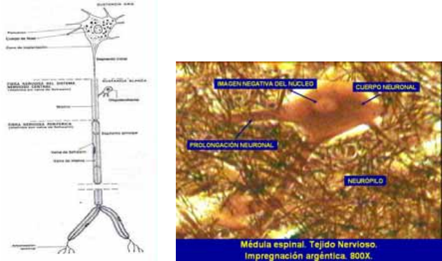 TEJIDO NERVIOSO. MSc. Belén Z. Iglesias Ramírez Dr. Andrés Dovale Borjas El tejido nervioso, al igual que los demás tejidos básicos, está compuesto por células, sustancia intercelular y líquido tisular. Los elementos celulares que lo integran son: neuronas y neuroglias. Las neuronas se distinguen por su aspecto morfológico, presentan un soma o cuerpo y prolongaciones citoplasmáticas que se denominan axón y dendrita A B Fig. 1. A. Esquema de una neurona multipolar . B . Beurona multipolar de la médula espinal. Impregnación argéntica. La función de las neuronas está basada en el desarrollo de dos propiedades fundamentales del protoplasma, excitabilidad y conductividad. Las neuronas son las encargadas de recibir los estímulos del medio, transformarlos en excitaciones nerviosas y trasmitirlos a los centros nerviosos, en los que se organizan para dar una respuesta. Por su parte, las neuroglias cumplen funciones nutritivas, aislantes, de sostén y defensa. Las prolongaciones largas del cuerpo de la neurona (axón) constituyen la parte fundamental de las fibras nerviosas, las que se entremezclan en la mayor parte de los órganos del sistema nervioso, con dendritas y con prolongaciones de las neuroglias. Este conjunto de fibras entrecruzadas constituyen el neurópilo. El tejido nervioso es el componente fundamental de una serie de órganos, cuyo conjunto se denomina sistema nervioso. El sistema nervioso está compuesto por el sistema nervioso central (SNC), que incluye el encéfalo y la médula espinal, y el sistema nervioso periférico (SNP) formado por los nervios craneales, los nervios raquídeos, los ganglios nerviosos y las terminaciones nerviosas. Neuronas Están constituidas por un cuerpo celular o soma y las prolongaciones, algunas de más de un metro de largo. Entre dichas prolongaciones se distinguen el: axón (transmisor del impulso nervioso), que es uno solo para cada neurona; y las dendritas (receptoras del impulso nervioso), generalmente múltiples. El tamaño del cuerpo o soma de las neuronas varía desde muy pequeño, de 4 a 6 µm, en las llamadas células granulosas o granos del cerebelo, hasta de 150 µm en las células piramidales gigantes de Betz del área motora de la corteza cerebral. A B Fig. 2. A. Esquema del cuerpo de una neurona multipolar. B, Microfotografía de una neurona multipolar. Cresil violeta. Se observa el nucleolo y los cuerpos de Nissl. La forma de las neuronas también es variada, debido principalmente al número y la disposición de sus prolongaciones. Las neuronas pueden ser estrelladas, fusiformes, piramidales, esféricas, etc. DISTRIBUCIÓN. En el SNC los cuerpos neuronales se agrupan en la corteza cerebral, corteza cerebelosa y en los núcleos grises. Estas zonas en estado fresco presentan un color grisáceo dada la abundancia de cuerpos neuronales y poca presencia de fibras nerviosas mielínicas, a estas zonas se le denomina sustancia gris. En la sustancia gris, además de los somas neuronales y sus prolongaciones, se encuentran gran número de células de neuroglia y capilares sanguíneos. Las zonas del SNC donde predominan las fibras nerviosas mielínicas (axones revestidos de mielina) se les denomina sustancia blanca, ya que por el alto contenido en lípidos de la mielina estas zonas presentan color blanco. En el SNP los cuerpos neuronales se agrupan en los ganglios nerviosos del Sistema Nervioso Autónomo. CLASIFICACIÓN MORFOLÓGICA DE LAS NEURONAS De acuerdo al número de prolongaciones dendriticas las neuronas se clasifican en: • Unipolares • Seudounipolares • Bipolares • Multipolares Fig. 3 Clasificación de las neuronas según el número de dendritas. Unipolares: Son las que poseen una sola prolongación que parte del cuerpo neuronal. Las neuronas unipolares son muy raras en el humano, pueden verse durante el desarrollo embrionario (neuroblastos unipolares) y en la retina las células amacrinas. Pseudounipolares: Las que se encuentran en los ganglios sensitivos de la raíz dorsal de los nervios espinales y en los ganglios sensitivos de varios nervios craneales. Estas células derivan de neuroblastos bipolares y durante su desarrollo, las prolongaciones se fusionan en su parte proximal por lo que la neurona queda con una sólo prolongación que se bifurca a cierta distancia del cuerpo neuronal. Los procesos resultantes, por su estructura y su capacidad para conducir los impulsos nerviosos, son axones por lo que las neuronas pseudounipolares no poseen dendritas. (fig. 9.2). Las neuronas bipolares poseen una dendrita y un axón que se localizan en polos opuestos de la célula. La dendrita puede estar o no ramificada y el axón puede ser corto o largo. Este tipo de neuronas se puede encontrar en la retina y en los ganglios vestibulares y cocleares del oído interno (fig. 9.2). Por la forma de huso del soma celular estas células son fusiformes. Las neuronas multipolares son las más abundantes del sistema nervioso; en ellas el soma celular presenta más de una prolongación dendrítica. Presentan un solo axón (fig. 9.2) El soma de estas neuronas puede ser estrellado, piramidal, piriforme, etc. Fig. 4. Diferentes formas de neuronas multipolares El histólogo italiano Camilo Golgi, clasificó las neuronas según la longitud del axón en: • Axón largo, o Golgi tipo I; • Axón corto, o Golgi tipo II. Las neuronas Golgi tipo I poseen axones largos que salen de la región donde se encuentra el soma celular y terminan lejos de su origen, en otra parte del sistema nervioso o en otro tejido, tal como la piel o los músculos. Las neuronas tipo II poseen axones cortos que se ramifican localmente en la región donde se sitúa el soma neuronal (figura 9.3). CARACTERÏSTICAS MORFOFUNCIONALES DE LAS NEURONAS: CUERPO O SOMA NEURONAL. El cuerpo de la neurona constituye el centro trófico o nutricio de la célula y proporciona una gran área de superficie de membrana para recibir los impulsos nerviosos. Los dos componentes del soma n