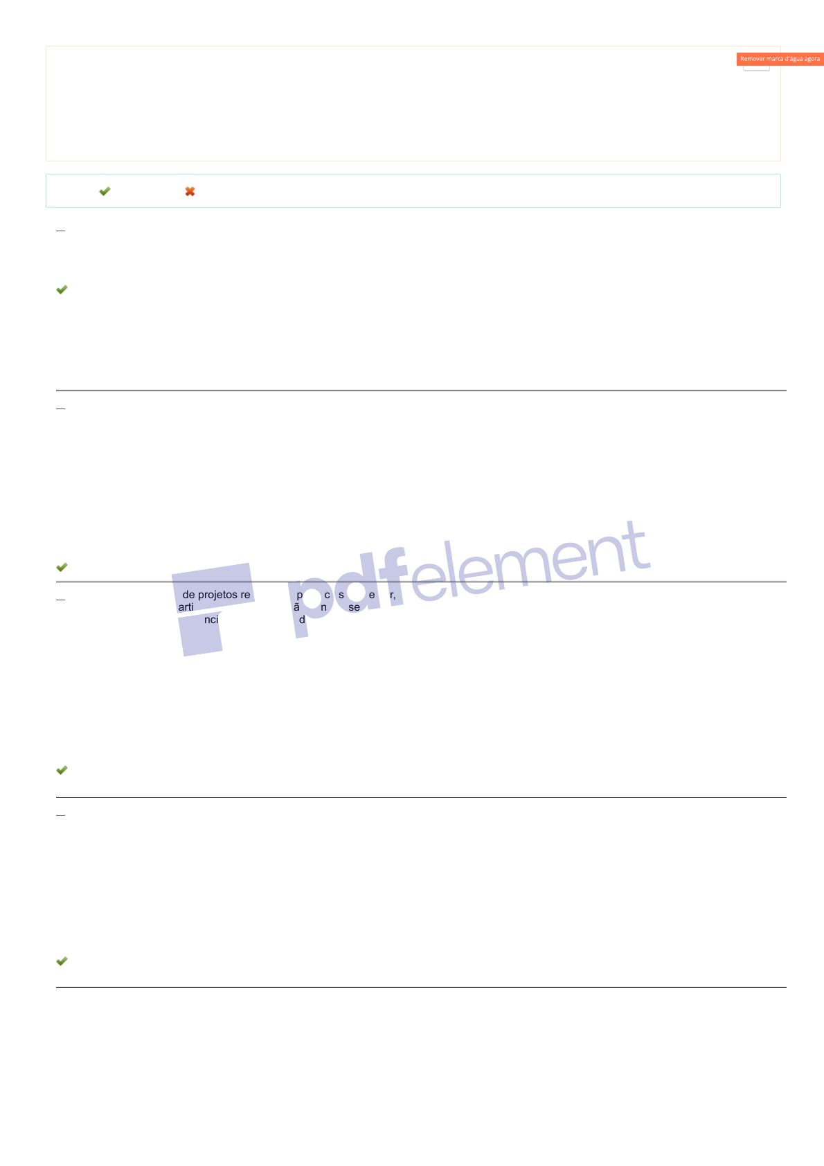 14/05/2020 UNIASSELVI - Centro Universitário Leonardo Da Vinci - Portal do Aluno - Portal do Aluno - Grupo UNIASSELVI https://portaldoalunoead.uniasselvi.com.br/ava/avaliacao/avaliacao_lista.php 1/2 Disciplina: Projetos Empresariais (REC10) Avaliação: Avaliação I - Individual Semipresencial ( Cod.:637238) ( peso.:1,50) Prova: 18041022 Nota da Prova: 10,00 Legenda: Resposta Certa Sua Resposta Errada 1. Os projetos possuem ciclos de atividades visando atingir seus objetivos dentro de prazos previamente definidos. Assim, em função desses objetiv particularidades cada projeto possui seu próprio ciclo de atividades e prazos, por isso cada projeto é diferente. Para conseguir os objetivos e praz previamente estabelecidos os projetos possuem fases dinâmicas, as quais podem ser classificadas em quatro grupos: a ideia (ou descoberta do q precisa desenvolver), a visualização do que é necessário fazer (ou a concepção), a estratégia e desenho dos processos, a execução (desenvolvim finalmente a entrega. Sobre os momentos dos projetos, assinale a alternativa CORRETA: a) No momento que a ideia, ou descoberta, se converte em um produto que seja "viável" de desenvolver, é quando fica definido o começo do des projeto, se iniciando a geração de detalhes e processos, e se gerando o marco (escopo) do que pode ser entregável. b) No momento que a ideia, ou descoberta, se converte em um produto que seja "viável" de desenvolver, é quando fica definido o começo do des projeto, se iniciando a geração de detalhes e processos para serem executados na concepção e nos processos operacionais. c) A fase do desenvolvimento deve considerar o mesmo processo do desenho do que será feito nos diversos ciclos e atividades do projeto, se ge processos gradativos, desenvolvimento do desenho em si, execução de tarefas e adiantamento da fase operativa. d) As atividades ao serem dinâmicas devem ser definidas exatamente quando cada uma delas irá acontecer, caso contrário haverá o risco de atra processo inicial do desenho do projeto e demais processos de execução durante a fase de desenvolvimento das atividades. 2. Existem quatro categorias de profissionais que, costumeiramente, estão envolvidas em um projeto empresarial desde seu início. Esses profissiona gerente geral, o gerente de projeto, o gerente funcional e os especialistas. A respeito das funções exercidas por esses profissionais, classifique V sentenças verdadeiras e F para as falsas: ( ) O gerente geral não está tão intimamente ligado ao projeto, mas exerce um papel de moderador da estrutura matricial. ( ) O gerente funcional é considerado o sponsor, ou seja, o patrocinador do projeto. ( ) Aos especialistas cabe a distribuição dos recursos para o projeto aos seus subordinados. ( ) O gerente de projeto é responsável, principalmente, pela integração das atividades do projeto e pelo cumprimento dos prazos e do orçamento Agora, assinale a alternativa que apresenta a sequência CORRETA: a) F - V - F - F. b) F - F - V - V. c) V - V - V - F. d) V - F - F - V. 3. Gerenciar uma equipe de projetos requer competências ao gestor, de modo que as pessoas possam realmente estar envolvidas com o projeto. Ca pouco interesse dos participantes, o projeto não atingirá seu objetivo, podendo até ser cancelado, gerando despesas para o patrocinador e desmo stakeholders. Tais competências são classificadas em técnicas, contextuais e comportamentais. Sendo assim, classifique V para as sentenças ve F para as falsas: ( ) Competências comportamentais referem-se às atitudes como liderança, engajamento e motivação, capacidade de argumentação, criatividade éticos. ( ) Competências contextuais referem-se à capacidade de orientação ao projeto e ao cronograma e à organização permanente. ( ) Competência técnica: podemos citar conhecimento dos requisitos e objetivos do projeto. ( ) Competências comportamentais referem-se à capacidade de orientação ao projeto e aos requisitos e objetivos do projeto. Agora, assinale a alternativa que apresenta a sequência CORRETA: a) F - V - F - F. b) F - F - V - F. c) V - V - V - F. d) V - V - F - V. 4. As empresas executam diversas atividades. Estas atividades podem ser de cunho rotineiro (ou também conhecidas como dirigidas por processos cunho inovador (ou também conhecidas como dirigidas por projetos). Quanto a estes dois tipos básicos de atividades executadas por uma empres classifique V para as sentenças verdadeiras e F para as falsas: ( ) As atividades de cunho inovador são as atividades funcionais de curta duração. ( ) As atividades de cunho rotineiro possuem uma cronologia bem definida e específica. ( ) As atividades de cunho rotineiro são as atividades funcionais da empresa. ( ) As atividades de cunho rotineiro exigem mobilização específica para serem realizadas. Agora, assinale a alternativa que apresenta a sequência CORRETA: a) F - V - F - F. b) V - F - V - V. c) F - F - V - F. d) V - V - F - V. https://portaldoalunoead.uniasselvi.com.br/ava/notas/request_gabarito_n2.php?action1=QURHMDc5OQ==&action2=UkVDMTA=&action3=NjM3MjM4&action4=MjAyMC8x&prova=MTgwNDEwMjI=#questao_1%20aria-label= https://portaldoalunoead.uniasselvi.com.br/ava/notas/request_gabarito_n2.php?action1=QURHMDc5OQ==&action2=UkVDMTA=&action3=NjM3MjM4&action4=MjAyMC8x&prova=MTgwNDEwMjI=#questao_2%20aria-label= https://portaldoalunoead.uniasselvi.com.br/ava/notas/request_gabarito_n2.php?action1=QURHMDc5OQ==&action2=UkVDMTA=&action3=NjM3MjM4&action4=MjAyMC8x&prova=MTgwNDEwMjI=#questao_3%20aria-label= https://portaldoalunoead.uniasselvi.com.br/ava/notas/request_gabarito_n2.php?action1=QURHMDc5OQ==&action2=UkVDMTA=&action3=NjM3MjM4&action4=MjAyMC8x&prova=MTgwNDEwMjI=#questao_4%20aria-label= http://cbs.wondershare.com/go.php?pid=5484&m=db 14/05/2020 UNIASSELVI - Centro Universitário Leonardo Da Vinci - Portal do Aluno - Portal do Aluno - Grupo UNIASSELVI https://portaldoalunoead.uniasselvi.com.br/ava/avaliacao/av