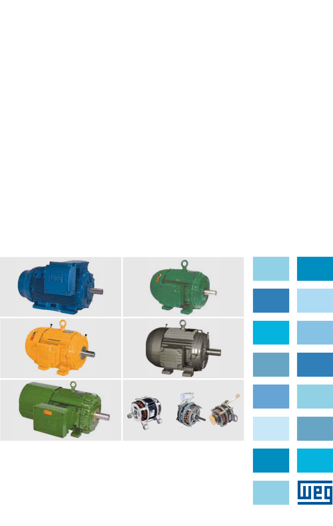 Motores | Energia | Automação | Tintas Motores Motores Elétricos O motor elétrico tornou-se um dos mais notórios inventos do homem ao longo de seu desenvolvimento tecnológico. Máquina de construção simples, custo reduzido, versátil e não poluente, seus princípios de funcionamento, construção e seleção necessitam ser conhecidos para que ele desempenhe seu papel relevante no mundo de hoje. Através de uma linguagem simples e objetiva, este manual visa facilitar o trabalho de quem especifica, compra e vende motores elétricos. Este material abrange todos os motores de baixa, média e alta tensão – síncronos de ímãs permanentes e assíncronos de indução, monofásicos e trifásicos, com rotor de gaiola – produzidos pela WEG, a maior fabricante de motores elétricos da América Latina e uma das maiores do mundo. Introdução www.weg.net A ne l v ´ri ng C ar ca ça C ha ve ta T am pa d ia nt ei ra A ne l v ´ri ng T am pa d efl et or a V en til ad or R ol am en to D re no E st at or b ob in ad o C ai xa d e lig aç ão T am pa d a C ai xa d e lig aç ão R ot or A ne l d e fix aç ão R ol am en to A lto R en di m en to P lu s www.weg.net Linhas de produtos W21 Alto Rendimento Plus............................................... ............... A-2 W21................................... ............................................................. A-2 Wmagnet (Extra Alto Rendimento) ............................................. A-3 WELL (Alto Rendimento Plus) .................................................... A-3 Wmining (Alto Rendimento Plus) ................................................ A-4 Wwash (Alto Rendimento Plus) .................................................. A-4 Roller Table (Alto Rendimento Plus) ........................................... A-5 WDIP (Alto Rendimento Plus) ..................................................... A-5 Motofreio à prova de Explosão .................................................. A-6 Motor à Prova de Explosão ........................................................ A-6 Não Acendível ....................... ....................................................... A-7 Motor para Bomba de Combustível ........................................... A-7 Motor para Bomba Monobloco .................................................. A-8 Motor tipo Motofreio................................................................... A-8 Motor Motosserra.... ................................................................... A-9 W21 Dahlander IP55 .................................................................. A-9 HGF................................ ..............................................................A-10 Motor NEMA 56...................... .....................................................A-10 Motor Jet Pump.............. ............................................................A-11 Motor para Redutor - Tipo 1 .....................................................A-11 Motofreio para Redutor - Tipo 1 ................................................A-12 Motor com Capacitor Permanente ............................................A-12 Motor IP55 – Uso Rural .............................................................A-13 Motor Jet Pump com flange incorporada ..................................A-13 Motor Jet Pump Split-phase .....................................................A-14 Motor Jet Pump Capacitor de Partida.......................................A-14 Motores NEMA 48 e 56 .............................................................A-15 Motor para lavadora automáticas e semi-automáticas ..............A-15 Motor para Condicionadores de Ar ...........................................A-16 Mini-motor para Movimentação de Ar .......................................A-16 Características elétricas W21........................... ............. .................................................B-2-B-3 W21 Alto Rendimento Plus .................................................B-4-B-5 Wmagnet (Extra Alto Rendimento) .............................................B-6 WELL (Alto Rendimento Plus) .............................................B-6-B-7 Wmining (Alto Rendimento Plus) .........................................B-8-B-9 Wwash (Alto Rendimento Plus) .................................................B-10 WDIP (Alto Rendimento Plus ............................................. B-11-B12 Motofreio à prova de Explosão .................................................B-13 Motor à Prova de Explosão .......................................................B-14 Não Acendível ...................... ..............................................B-16-B-17 Motor para Bomba de Combustível ..........................................B-18 Motor para Bomba Monobloco .................................................B-18 Motor tipo Motofreio..................................................................B-19 Motor tipo Motosserra.............................................................. B-20 W21 Dahlander IP55............ ............................................ B-21-B-22 Motor NEMA 56......................................................................... B-23 Motor Jet Pump.......... .............................................................. B-23 Motor para Redutor - Tipo 1 .................................................... B-24 Motofreio para Redutor - Tipo 1 ............................................... B-24 Motor com Capacitor Permanente ........................................... B-25 Motor IP55 – Uso Rural ............................................................ B-25 Motor Jet Pump com flange incorporada ................................. B-26 Motor Jet Pump Split-phase .................................................... B-26 Motor Jet Pump Capacitor de Partida...................................... B-27 Motor NEMA 48 e 56 ............................................................... B-27 Mini-motor para Movime