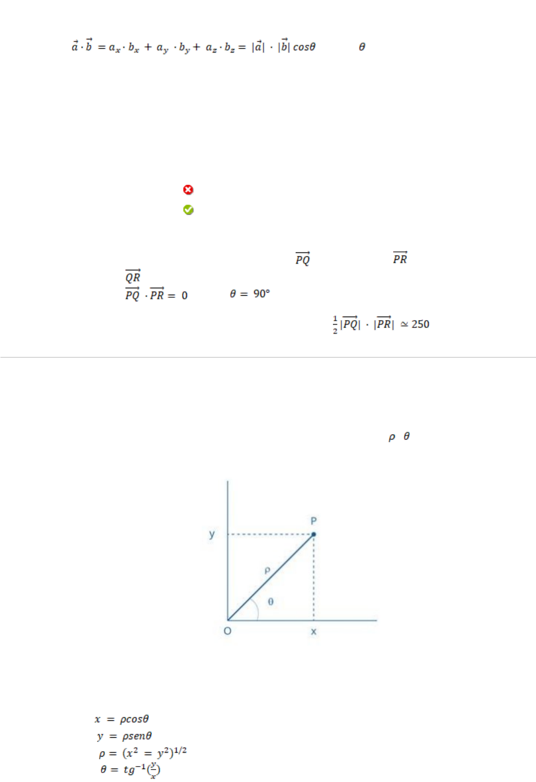 Pergunta 1 Resposta Selecionada: Resposta Correta: Feedback da resposta: Dados dois vetores, e, o produto escalar entre eles é representado e definido por , em que é o ângulo subentendido entre eles. Suponha os pontos de coordenadas P(10k, 10, 0), Q(10k -1, 20K, 20) e R(10, 30, -10) em um sistema de eixos cartesianos. Com base no exposto, analise as afirmativas a seguir e assinale V para a(s) verdadeira(s) e F para a(s) falsa(s). I. ( ) Os pontos P, Q e R são distintos para qualquer k. II. ( ) Os pontos P, Q e R definem um triângulo. III. ( ) Se k = 1, o triângulo é retângulo no vértice P. IV. ( ) Se k = 1, a área do triângulo é aproximadamente 500 u.a. A seguir, assinale a alternativa que apresenta a sequência correta. F, V, V, V. V, V, V, F. Sua resposta está incorreta. Justificativa: Três pontos distintos no espaço R 3 sempre definem um triângulo no espaço tridimensional. Dados os pontos P, Q e R, as arestas do triângulo identificam-se com os vetores = (-1, 20k-10, 20), = (10 – 10k, 20, -10) e = (11 – 10k, 30 – 20k, -30). Para que o triângulo seja retângulo em P, então, , para que entre eles, ou seja, (-1) ⋅ (10-10k) + (20k-10) ⋅ (20) + (20) ⋅ (-10) = 0 ⇒ k = 1. Se k = 1, o triângulo é retângulo em P e Área = u.a. Pergunta 2 Em um plano, a posição de um ponto P pode ser definida por meio de um par ordenado de valores do tipo (x, y) em um sistema de coordenadas cartesianas. Outra possibilidade é determinar a posição do ponto P pela distância r em relação à origem O e pelo ângulo que a reta que une a origem O ao ponto P define com um dos eixos cartesianos. Essa representação, expressa ( , ), é denominada coordenadas polares. Fonte: Elaborada pelo autor. A partir das descrições apresentadas, analise as afirmativas a seguir e assinale V para a(s) verdadeiras e F para a(s) falsa(s). I. ( ) . II. ( ) . III. ( ) . IV. ( ) . 0 em 1 pontos 0 em 1 pontos Resposta Selecionada: Resposta Correta: Feedback da resposta: A seguir, assinale a alternativa que apresenta a sequência correta. V, V, F, F. V, V, V, V. Sua resposta está incorreta. Justificativa: As relações de conversão entre as coordenadas cartesianas e polares podem ser definidas trigonometricamente a partir do triângulo de vértices OxP. Assim, , , e . Pergunta 3 Resposta Selecionada: Resposta Correta: Feedback da resposta: Um campo de forças, ou campo vetorial, é uma função que associa um vetor a cada ponto de coordenadas (x, y, z). Quando os valores são somente numéricos, o campo é denominado escalar. Seja, então, um campo de forças F: definido por . Considere as figuras a seguir: Fonte: Elaborada pelo autor. Qual delas representa o campo vetorial F? IV. IV. Resposta correta. Justificativa: O módulo da função vetorial F decai segundo o inverso da distância em relação à origem do sistema de coordenadas, ou seja, pois = , em que d é o valor da distância do ponto (x, y), em relação ao ponto (0, 0). Como o vetor F é anti-horário para qualquer coordenada (x, y), a orientação do campo de forças F é anti-horário. 1 em 1 pontos Pergunta 4 Resposta Selecionada: Resposta Correta: Feedback da resposta: Suponha que o vetor posição de uma partícula P em movimento no espaço ℝ 3 seja dado, em função do tempo, pela expressão . Os vetores , e possuem módulo unitário e estão alinhados, respectivamente, aos eixos x, y ou z de um sistema cartesiano de coordenadas. A partir do exposto, analise as afirmativas a seguir e assinale V para a(s) verdadeira(s) e F para a(s) falsa(s). I. O componente z da aceleração vetorial é zero. II. A velocidade vetorial é . III. A posição inicial da partícula é . IV. A trajetória da partícula é helicoidal. A seguir, assinale a alternativa que apresenta a sequência correta. V, V, V, V. V, V, V, V. Resposta correta. Justificativa: . ⇒ . . Na direção z, o movimento é uniforme enquanto as coordenadas x e y possuem variações cossenoidais ou senoidais. Portanto, a partícula desenvolve trajetória helicoidal, ascendente, a partir do plano XY. Pergunta 5 Resposta Selecionada: Resposta Correta: Seja dado um triângulo de vértices A, B e C. Considere que o ponto médio do segmento é o ponto M e que N é o ponto médio do segmento . As propriedades da geometria euclidiana podem, também, ser definidas em termos da notação vetorial. Fonte: Elaborada pelo autor. Assim, analise as asserções a seguir e a relação proposta entre elas. I. é paralelo a . PORQUE II. . A seguir, assinale a alternativa correta. As asserções I e II são proposições verdadeiras, e a II é uma justificativa correta da I. As asserções I e II são proposições verdadeiras, e a II é uma justificativa correta da I. 1 em 1 pontos 1 em 1 pontos Feedback da resposta: Resposta correta. Justificativa: . Portanto, . Se dois vetores são proporcionais entre si é porque possuem a mesma direção. Então, por isso, os segmentos e são paralelos entre si. Pergunta 6 Resposta Selecionada: Resposta Correta: Feedback da resposta: Nos estudos da Física, algumas grandezas necessitam que lhes sejam atribuídas uma direção e um sentido. Não é suficiente especificarmos somente o valor numérico e uma unidade). Essas grandezas são denominadas vetoriais. Muitas vezes, operações matemáticas simples, aplicadas sobre grandezas vetoriais, não são possíveis de serem realizadas pelo uso direto de uma calculadora. A seguir, assinale a alternativa que lista grandezas cujas somas podem ser realizadas somente pelo uso direto de uma calculadora. Massa, potência, resistência elétrica. Massa, potência, resistência elétrica. Resposta correta. Justificativa: Grandezas como massa, potência e resistência elétrica são denominadas escalares. Para defini-las completamente, basta conhecermos os valores numéricos e as unidades. O resultado da soma de várias massas, por exemplo, pode ser conhecido aplicando-se os valores individuais diretamente em uma cal