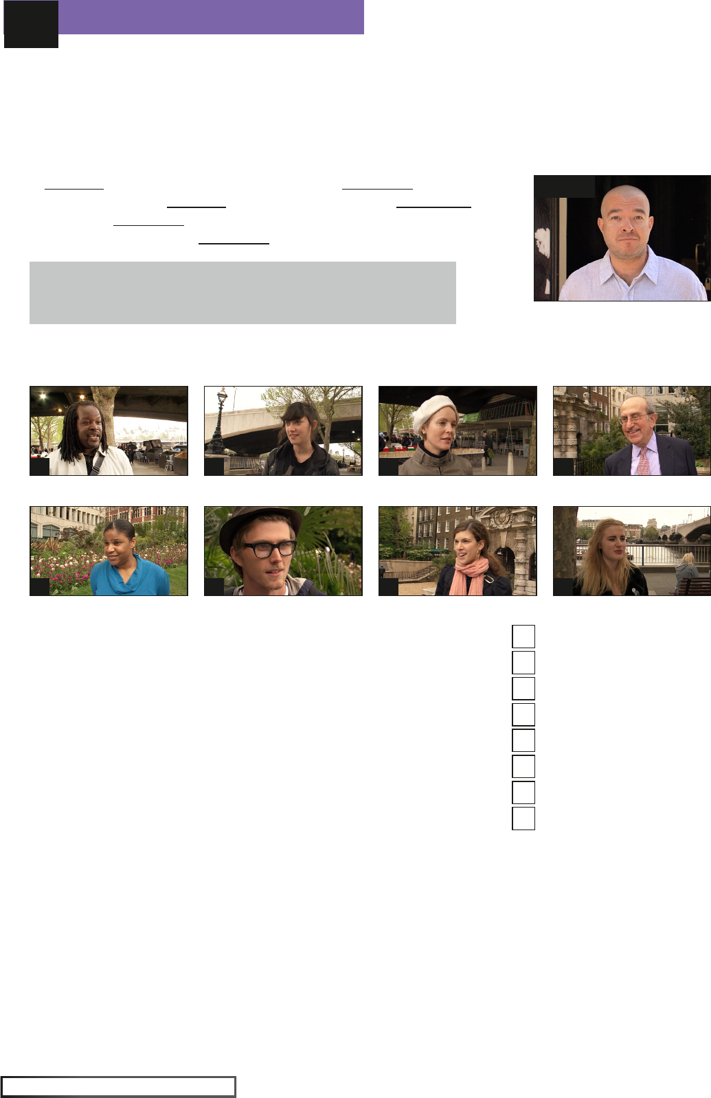 DOWNTIME 3 speakout Upper Intermediate UNIT 3 page 1© Pearson Education Limited 2011 Overview Watch the video podcast. Do you spend your free time doing similar things to Pasha? 1 Read the paragraph below about what Pasha likes to do in his free time. Then watch the video podcast from 0:12-0:27 and complete the text. I 1 doing a lot of different things in my 2 time. Most of them are to do with 3 : I DJ both in London and 4 and I try to go to 5 and festivals whenever I can. How about you? How do you spend your 6 time? Glossary: downtime = (informal) a period of time when you have finished what you were doing, and you can relax or do something that you had not originally planned to do 2 Look at the people below and read about how they spend their free time 1-8. Then watch the video podcast from 0:28-1:28 and match the people to the correct activity/activities. 1 I play football. I play table tennis. I go bowling. F 2 I spend a lot of time walking, running and boxing. 3 I go out with my friends. 4 playing golf 5 I like to watch films. 6 I like to read a lot and I like to draw and make clothes. 7 I run an amateur opera company. 8 going to exhibitions, travelling, going to the theatre Pasha D Nick C Rachel B Dee A Winston H Tracey G Elena F Charlie E Florence DOWNTIME 3 speakout Upper Intermediate UNIT 3 page 2© Pearson Education Limited 2011 3 How would you spend your free time differently if you had more time, more money or more opportunity? Watch the video podcast from 1:35-3:24 and write true (T) or false (F) next to each statement. 4 What are the benefits to society of giving people more downtime or more holidays? Watch the video podcast from 2:21-3:24 and tick (✓) the things the speakers mention. 1 people would learn more about themselves ✓ 2 it would reduce stress and pressure on people 3 people could travel more 4 people would be able to spend more time with their families 5 people would be healthier because they would do more exercise and sport 6 people would become more educated, more intelligent 7 people could learn to become more creative 8 people would be able to develop new interests 9 people would have more friends She would go to more concerts. She would see more of the world. Rachel Florence D E She would go out to more parties. Elena E He would learn a new sport. She would become more creative. He would learn about his family and its history. Winston Tracey Charlie A B C DOWNTIME 3 speakout Upper Intermediate UNIT 3 page 3© Pearson Education Limited 2011 The way we speak 5 The people below talk about things they like doing in their free time. Read the sentences and fill in the gaps with words and phrases from the podcast that mean the same as the phrases in the brackets. Then watch the video podcast from 0:27-1:55 and check your answers. 5 I spend most of my free time with my friends, just _____________ (meeting up) and watching films, listening to music. 4 During my free time I read, _____________ . (I watch the news on my computer) Elena Tracey 1 I discovered golf eight years ago and I’m _____________ . (I want to play golf all the time because I like it so much) 2 I like to watch films; _____________ music. (I like music very, very much). 3 I _____________ . (I do a lot of physical exercise) Winston Dee Florence DOWNTIME 3 speakout Upper Intermediate UNIT 3 page 4© Pearson Education Limited 2011 Personalisation 6 Write your answers to the questions. 1 How do you spend your free time? ______________________________________________________________________ ______________________________________________________________________ 2 How would you spend your free time differently if you had more time, money or opportunity? ______________________________________________________________________ ______________________________________________________________________ 3 In your opinion, what are the benefits to society of giving people more free time or more holidays? ______________________________________________________________________ ______________________________________________________________________ A study suggests that British housewives spend more of their leisure time on the internet than any other nationality. http://news.bbc.co.uk/1/hi/technology/7789494.stm BBC LINK