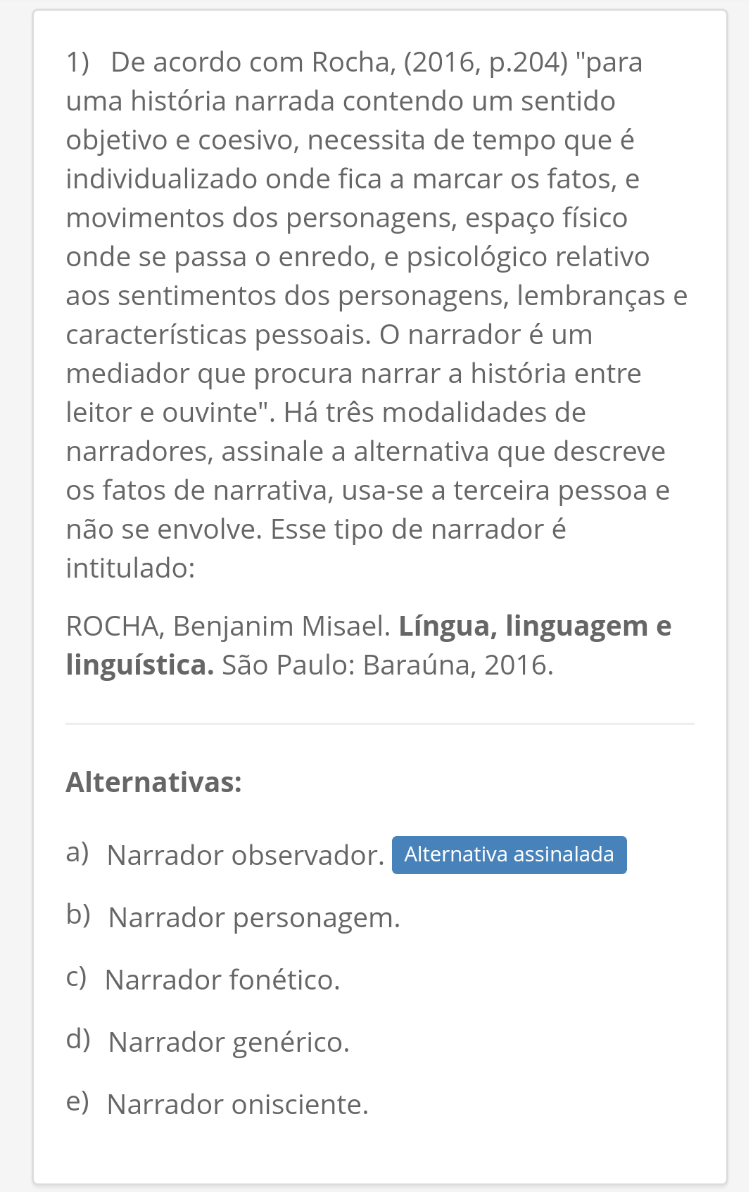 De acordo com Rocha, (2016, p.204) "para uma historia narrada contendo um sentido objetivo e coesivo, necessita de tempo que individualizado onde fica a marcar OS fatos, e movimentos dos personagens, espaco fisico onde se passa O enredo, e psicologico relativo aos sentimentos dos personagens, lembrancas e caracteristicas pessoais. O narrador e um mediador que procura narrar a historia entre leitor e ouvinte". Ha tres modalidades de narradores, assinale a alternativa que descreve fatos de narrativa, usa-se a terceira pessoa e nao se envolve. Esse tipo de narrador e intitulado: a) Narrador observador Alternativa assinalada b) Narrador personagem c) Narrador fonetico. d) Narrador generico. e) Narrador onisciente.