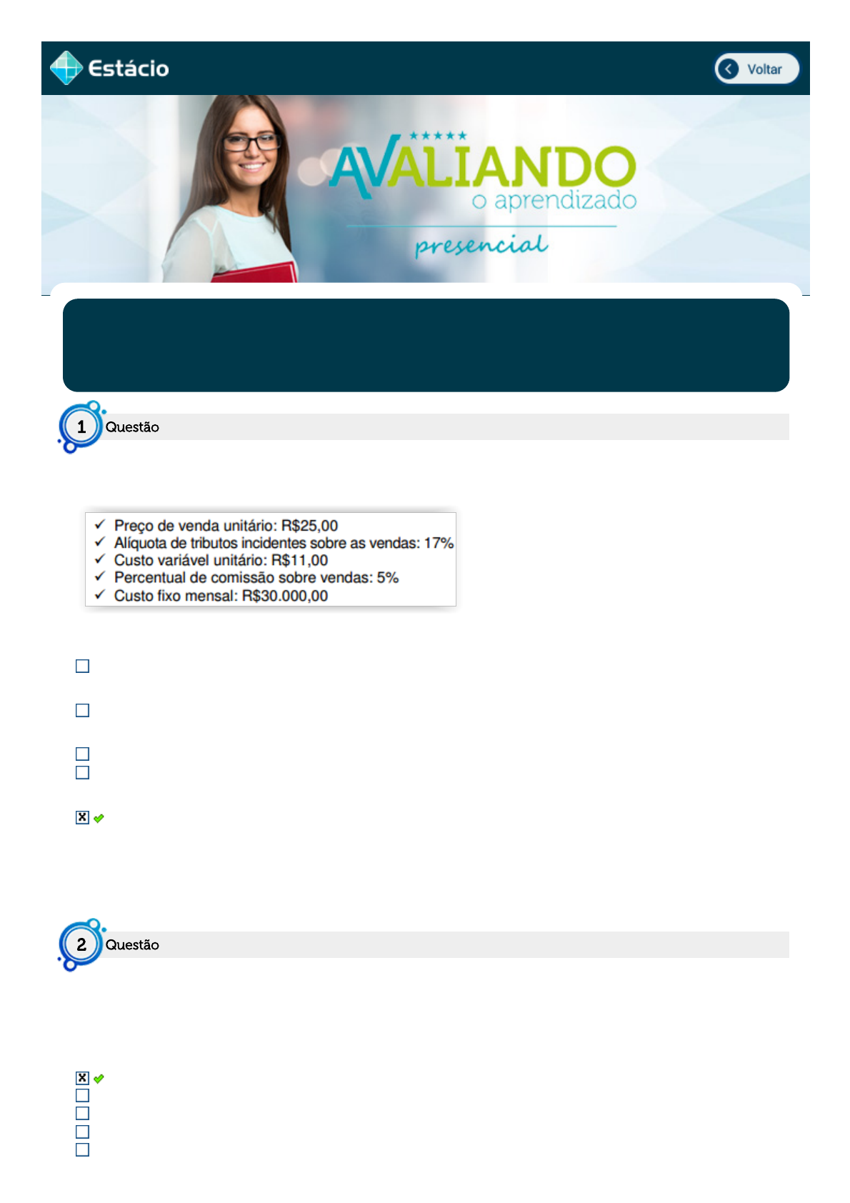 unitário: R$25,00 ; Alíquota de tributos incidentes sobre as vendas: 17% ; Custo variável unitário: R$11,00 ;