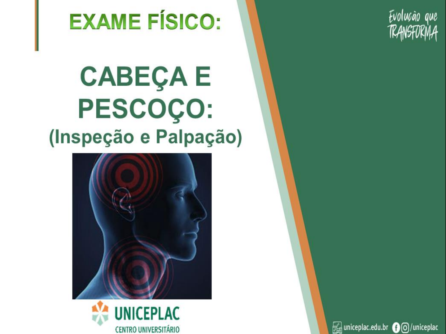 AVALIAR: a) Crânio, couro cabeludo e cabelos; b) Face; c) Sobrancelhas, pálpebras, cílios e olhos (conjuntivas, escleras, córneas, íris , pupilas e globo ocular); d) Pavilhão auricular e ouvido; e) Nariz e seios paranasais; f) Lábios, cavidade bucal – gengivas, dentes, palatos e língua; g) Pescoço; *Uso dos EPI’s, ambiente adequado e paciente disponível. a) CRÂNIO - Inspeção: TAMANHO: • Normocefálico: Normal • Macrocefálico: Grande • Microcefálico: Pequeno FORMA: • Normocefalia: Crânio mediano • Escafocefalia: Crânio estreito e longo • Braquicefalia: Largura maior em relação ao comprimento • Plagiocefalia: Assimetria - achatamento (um dos lados) • Trigonocefalia: Formato triangular da parte frontal do crânio • Turricefalia (acrocefalia): Excesso na altura do crânio (forma de torre) FORMAS: TRIGONOCEFALIA TURRICEFALIA • POSIÇÃO: Simétrica (centralizada na linha média) ou Assimétrica. • MOVIMENTAÇÃO: Preservada ou Alterada (movimentos de flexão, extensão, inclinação lateral e rotação) A) COURO CABELUDO e CABELOS: • Inspecionar: - Pele: coloração, íntegra ou com alterações – hematomas, escoriações, nódulos, cistos, lesões, cicatrizes, manchas, carcinoma e edema. Cisto pilar Psoríase Nódulo eritematoso Carcinoma triquilemal • Limpeza (boa higienização ou alterações – oleosidade, caspa, seborreia, lêndea, pediculose); - Dispositivos. - Quantidade, aspecto e distribuição dos fios; • Palpar: Buscar nódulos, abaulamentos, depressões e algia, assim como a textura dos fios. FACE: Inspeção • Pele (coloração - corada, ictérica, pálida ou cianótica); • Manchas – localização e tipo; • Expressão facial; • Dispositivos; • Palpar buscando algia; B) SOBRANCELHAS, PÁLPEBRAS, CÍLIOS E OLHOS: • Sobrancelhas: Inspecionar simetria, presença de descamações ou lesões, distribuição dos fios. • Palpar buscando algia • Pálpebras: Inspecionar fechamento e abertura, lesões e alterações: edema, xantelasma, ptose palpebral, blefarite, lagoftalmia, ectrópio, entrópio, calázio, hordéolo e carninoma. • Palpar para detecção de nódulos , saída de secreção e algia. Carcinoma • Cílios: Inspecionar a quantidade e distribuição dos fios. • Olhos: Conjuntivas: Inspecionar a coloração (adequadas – róseas; pálidas – anemia; amareladas – icterícia e hiperemiadas na conjuntivite) hidratação*, alterações: presença de secreção, melanoma e edema (quemose) Melanoma Quemose * TESTE DE SCHIRMER Tempo: 5 min. Extensão da umidade: - 10 a 30 mm: normalidade - Igual ou menor que 10 mm: baixa produção lacrimal – risco de lesão em córnea Escleróticas: Inspecionar a coloração (adequadas – brancas; amareladas – icterícia; hiperemiada – conjuntivite e hemorragia) Arco senil Pterígio Córnea: Inspecionar coloração e uniformidade (adequada – clara - transparente; alteração – opacidade). - Oftalmoscópio: uso quando disponível. Pterígio Irís: Inspecionar simetria, formato (adequada – circular) e coloração (adequada - uniforme em ambos os olhos). Heterocromia: coloração diferente. Coloboma Pupila: Inspecionar coloração (negra), forma (arredondadas/esféricas), localização (centrais) , tamanho (isocórias – tamanho iguais e anisocórias – tamanhos diferentes) e testar o reflexo fotomotor ( dilatadas – midríase e contraídas – miose). Globo ocular: Inspecionar - Exoftalmia: Protrusão do globo ocular - Enoftalmia: Globo ocular deslocado para dentro de sua órbita - Desvios: Estrabismos -Movimentos involuntários: oscilações rápidas e curtas - nistagmo - Acuidade visual - Quadro de Snellen (Letra E), Movimentação Ocular e curativo. C) NARIZ: Inspecionar: - Forma, tamanho, simetria, deformidades e pele (íntegra ou lesões); - Mucosa: Coloração (rósea) lesões, umidade, corrimento, sangramento e higienização; - Desvio de septo; - Vibrissas; - Acuidade olfatória - Dispositivos • Palpar: - Seios frontais e maxilares: Realizar a palpação a fim de identificar locais com algia. D) PAVILHÃO AURICULAR E OUVIDO: • Pavilhão auricular: - Inspeção: Avaliar simetria, forma, tamanho, higiene, nódulo e pele (íntegra ou lesões, Ex: escoriação, inflamação); - Dispositivo: Ex curativo. * Saída de secreção: coloração e odor. - Palpação: Buscar pontos dolorosos e avaliar a mobilidade (boa ou pouca) • Ouvido: Utilizar otoscópio. - Inspeção: Avaliar cerume, sangue, secreção purulenta, coloração, integridade/rotura, forma do tímpano (adequado é translúcido, brilhante e na cor cinza-perolado sendo plano ) - Avaliar a acuidade auditiva e otalgia. E) LÁBIOS, CAVIDADE BUCAL – GENGIVAS, DENTES, LÍNGUA e PALATO: • Lábios: Inspecionar a simetria, coloração (rósea – adequada - cianose e palidez), hidratação e lesões – Ex: afta, herpes, câncer Deformidades congênitas (ex: lábio leporino), cicatrizes e e dispositivos (ex: Tubo orotraqueal) • Cavidade Bucal: Inspecionar a coloração (róseo-avermelhada - adequada), hidratação e lesões (ex: estomatite, afta e câncer). • Gengivas: Inspecionar a coloração (adequada- róseo-avermelhada ou amarronzada), lesão (gengivite) e sangramento. • Palpar: Avaliando a consistência (adequadas – firmes ou alteradas – amolecidas), algia e sangramento. • Dentes: Inspecionar a integridade, implantação, número, alterações (cáries e bruxismo) e utilização de próteses. • Língua: Inspecionar: - Tamanho (adequada – normoglossite; pequena – microglossite e grande macroglossite); - Tipo (saburrosa, seca, lisa, framboesa, geográfica e fissurada); - Coloração (rósea - adequada) e umidade (preservada ou xerostomia e sialorréia) ; - Integridade (Ex: processo inflamatório – glossite, aftas); - Simetria e desvio; - Mobilidade e tremor; • Palpar buscando: lesões, nódulos e algia. Tamanho: Não consegue colocar a língua para fora – puxar delicad