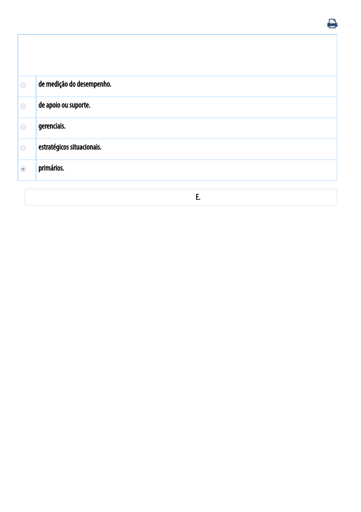 21/05/2020 Universidade Paulista - UNIP : Disciplina On-line. https://www.unip.br/presencial/central/Interna.aspx 1/1 Na análise e modelagem de processos de negócios, os processos que afetam positiva ou negativamente a relação com os clientes denominam-se processos A de medição do desempenho. B de apoio ou suporte. C gerenciais. D estratégicos situacionais. E primários. Você já respondeu e acertou esse exercício. A resposta correta é: E.