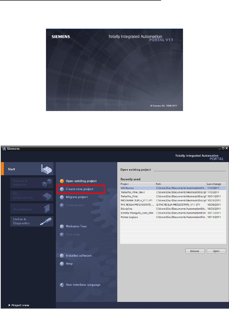 Tutorial: Programação do CLP Siemens S7-1200 Ambiente do software TIA Portal V11 da Siemens Criando um novo projeto 1 – Abrir o software TIA Portal V11. Iniciar - > Programas - > TIA Portal V11 2 – Clique em “Create new project”, para criação de um novo projeto. 3 – Preencha “Project Name”, “Path” (local onde irá criar o arquivo) e “Author” (isso sairá no relatório automático do TIA Portal) . 4- Clique em “Create”. O projeto foi criado. Configurando o hardware do projeto Neste momento iremos configurar o hardware a ser utilizado no projeto. 1 – Clique em “Configure a device”. 2 – Clique em “Add new device”, e depois selecione a CPU do S7-1200 da Siemens. 3 - Escolha CPU 1214C DC/DC/DC -> 6ES7 214-1AE30-0XB0 (Primeira opção) 4 - Escolha a versão 2.0. 5 – Clique no botão “Add”. O software irá alterar o modo de visualização para “Project View”. 6 – Clique em “Save Project” O software irá alterar o modo de visualização para “Project View”. Veja que é apresentado o hardware selecionado, e caso necessário adicionar módulos de expansão (entradas e saídas digitais e analógicas, módulos de comunicação entre outros, é possível efetuar nesta tela. 1- Menus e barra de ferramentas 2- Navegador de projeto 3- Área de trabalho 4-Cartões de tarefas 5-Janela de Inspeção 6-Alterar para modo Portal View 7-Barra de edição 1 3 2 4 6 7 5 5 – Clique em “Save Project” . Definindo as TAGs do PLC Para definir os nomes de entradas e saídas do PLC, e também de espaços da memória, vamos elaborar uma tabela de TAGs. 1 – Clique em “PLC_1”, depois em “PLC tags” e finalmente um duplo clique em “Default tag table”, conforme mostra a figura abaixo. 2 – Considere o mapa de entradas e saídas já definido no roteiro. 3 – Clique em “Save Project”. Criando o programa em Ladder Para criação do programa do CLP em ladder, deve ser utilizado o editor “Program Blocks”. O programa principal será gerado da seguinte forma. 1 – Clique em “PLC_1”, depois em “Program Blocks” e finalmente um duplo clique em “Main[OB1]”, conforme mostra a figura abaixo. 2- Clique em para criar um contato normalmente aberto (NA) para a entrada “Botão_1”. 3 – Clique ao lado direito do bloco inserido e depois em para abrir braço, adicione outro contato NA para a entrada “Botão_2”, e em seguida no botão para fechar braço. 4 – Clique no botão para criar um contato normalmente fechado (NF) para a saída “Prensa”. 5 – Clique ao lado direito em “ Basic instructions” => “ Comparator operations”, em seguida escolha entre dois blocos de comparação ou o bloco “IN_Range” e adicione na linha de energização. 6 – Coloque os valores ou variáveis de máximo e mínimo e à variável que será comparada ao meio do bloco. 9 – Caso necessário, clique no botão para inserir nova Network. 10 – Caso seja necessário, faça a conversão de variável analógica. Quando um valor de entrada analógica estiver disponível com o valor digitalizado, geralmente ele ainda precisa ser normalizado para que os valores numéricos correspondam às variáveis físicas do processo. Da mesma forma, geralmente a saída analógica realiza-se na palavra de saída periférica somente após a normalização do valor de saída. O programa STEP7 faz uso de operações de cálculo para a normalização. Para que isto possa se realizar com a máxima precisão, os valores para normalização devem ser convertidos para o tipo de dados REAL para que os erros de arredondamento sejam mínimos. Assim, As faixas de valor digitalizadas apresentam o seguinte aspecto: Use o bloco “Norm x” , dentro dele, escolha de int para real. Após isso, faça uma nova conversão de real para real, de modo a colocar a saída anterior dentro da faixa que irá operar. Obs.: Dúvidas com blocos funcionais, basta selecionar o bloco desejado e apertar a tecla F1. 11 – Para verificar os endereços das variáveis de Entrada e de Saída dos módulos inseridos, clique em PLC -> Device Configuration e Device Overview. Na tabela que se apresenta, estão as faixas de endereços onde se encontrarão as variáveis: Compilando e descarregando o programa no CLP Antes de fazer download do programa no PLC, vamos configurar seu IP. 1 – Clique no opção “Device configuration” do PLC_1. 2 – Clique na opção “Ethernet addresses”, configurando o protocolo IP com: IP adress: 10.235.10.20 Subnet mask: 255.255.254.0 Para compilar o programa editado no TIA Portal V11, siga conforme abaixo. 3 – Clique no botão “Compile” para compilar o programa. A seguinte tela deverá ser exibida. 4 – Clique no botão “Download to device” . 5 – Clique no botão “Load”. 6 – Clique em “Load” novamente. 7 – Clique no botão “Finish”. O download para o CLP foi realizado com sucesso. Utilize as chaves do botão 1 e botão 2 nas entradas do PLC para testar o software, verificando o resultado na saída Prensa. Verificar o projeto Para verificar o funcionamento do programa em ladder, podemos utilizar a ferramenta “Monitoring”, conforme segue abaixo. 1- Clique em “Program blocks” e logo depois um duplo clique em “Main [OB1]”. 2- Clique em “Monitoring on/off” . Também é possível utilizar o botão “Go online” . Desta maneira é possível monitorar o status de entradas, saídas, espaço de memória, fluxo de programa, status do CLP, entre outras. 4 – Clique no botão “Save Project”. Caso necessite de mais informações sobre utilização do software TIA Portal, busque na página da disciplina os documentos: - S7-1200 Easy Book – Manual - TIA Portal